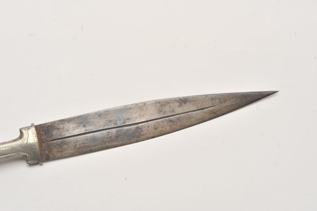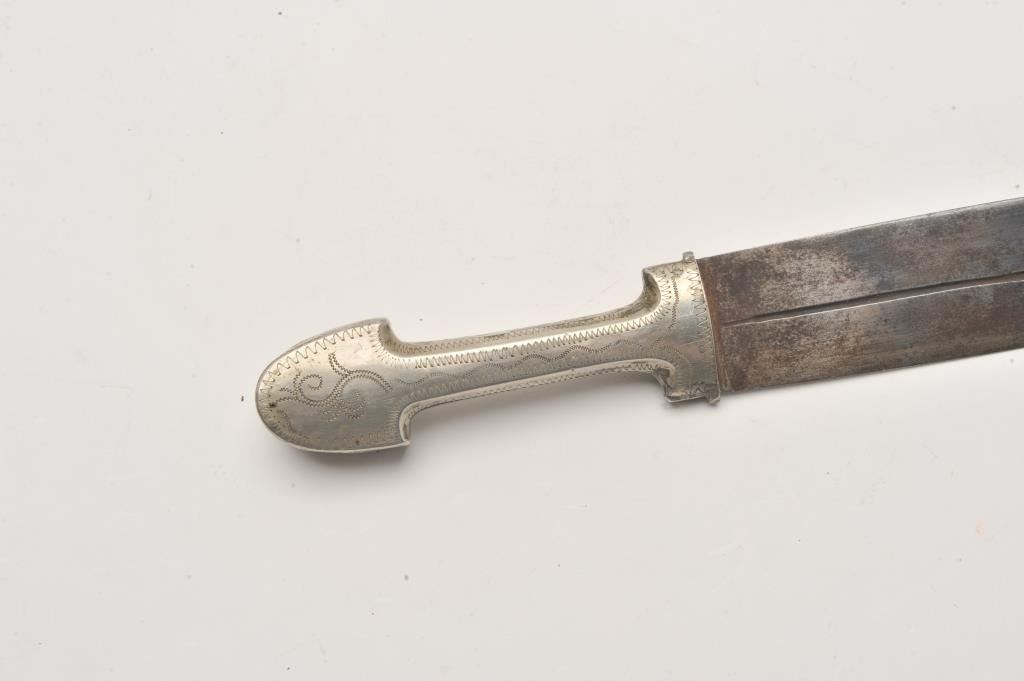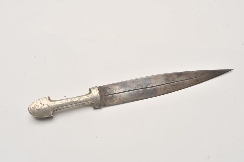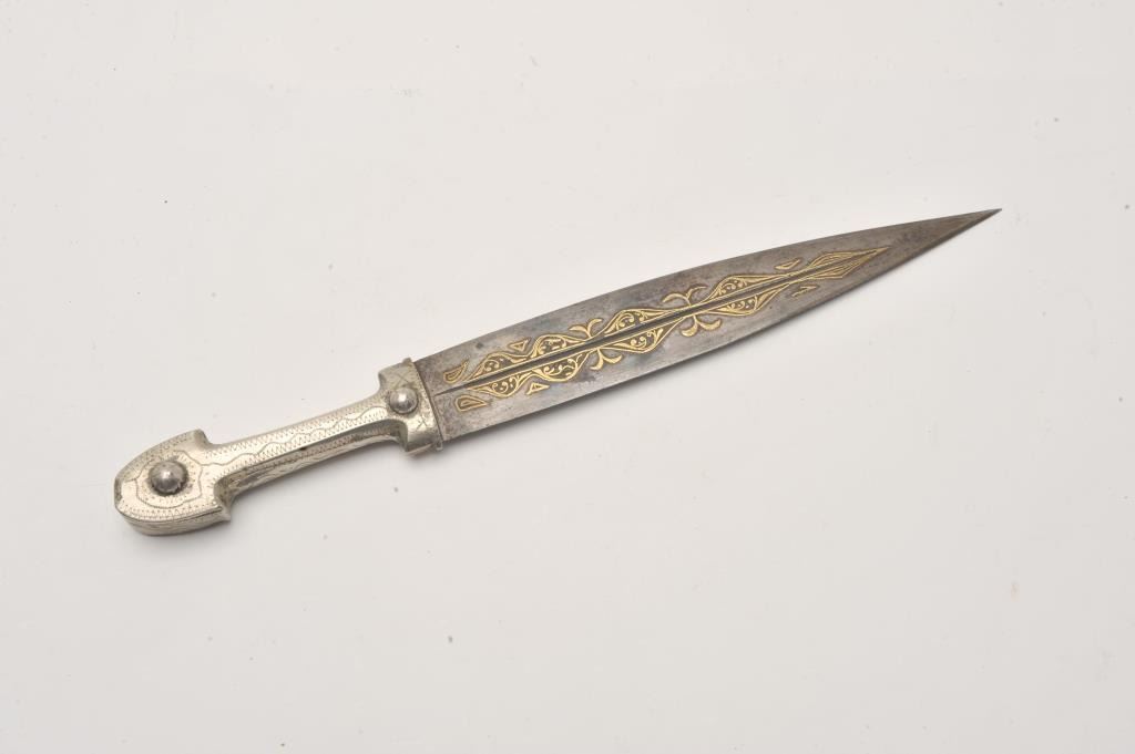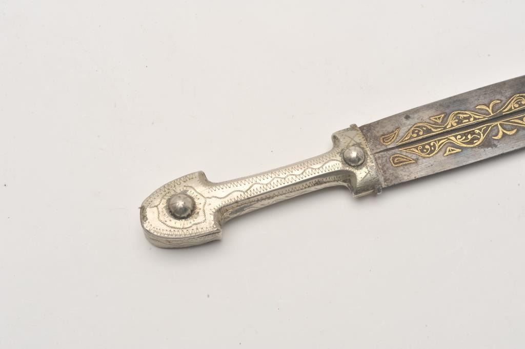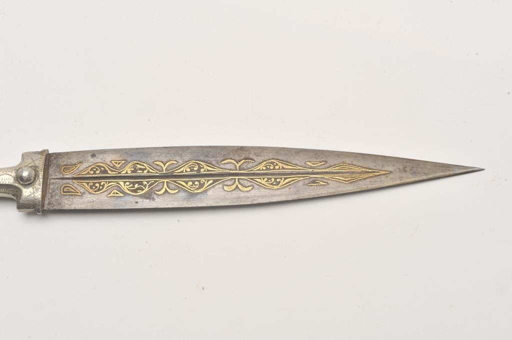 Small silver hilted Caucasian kinjal with gold inlaid blade. Estimate: $200-$400