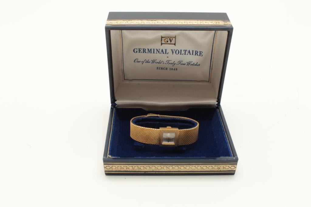 Elegant Germinal Voltaire lady’s wristwatch with matching mesh band in original box. Estimate: $200-$400