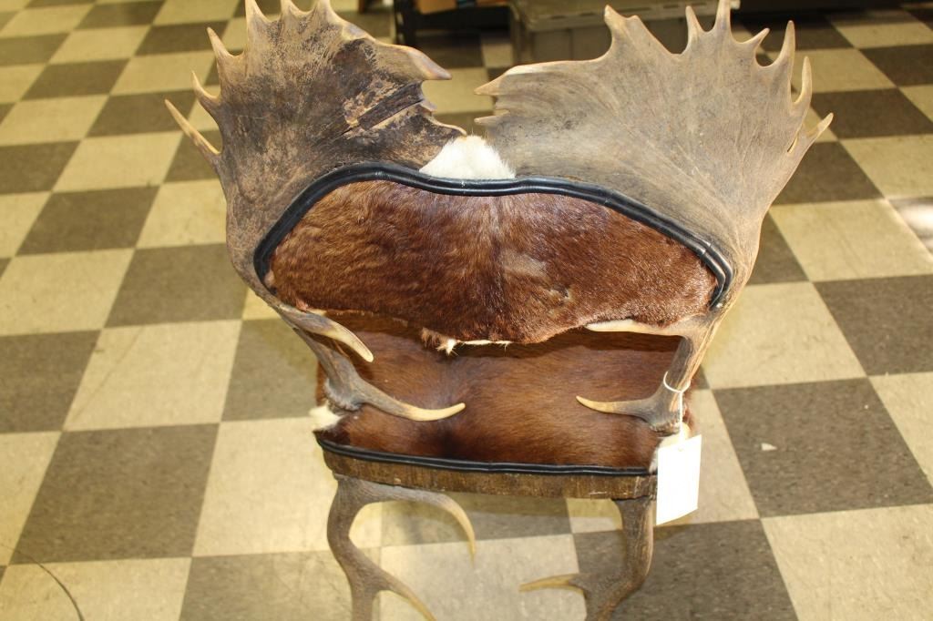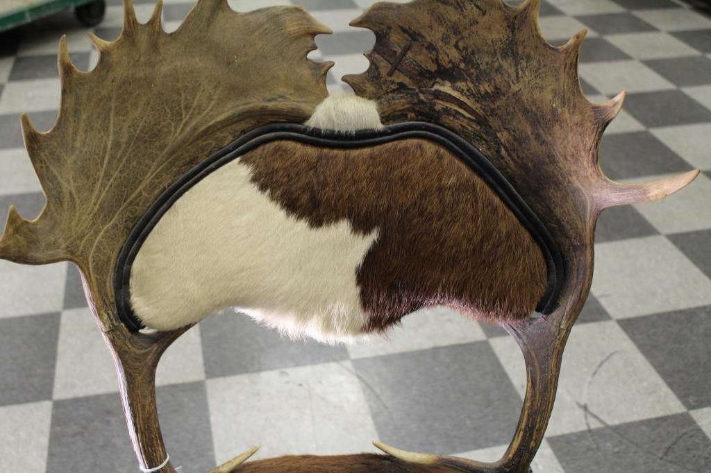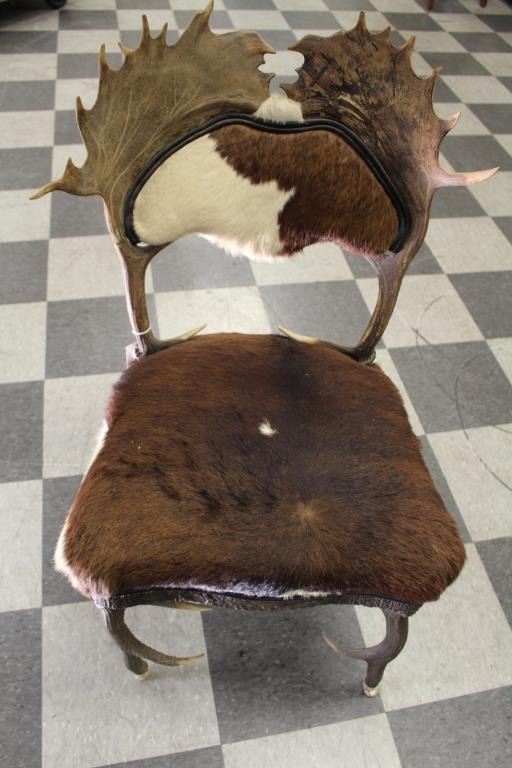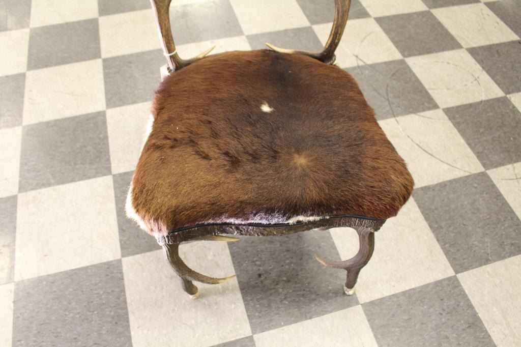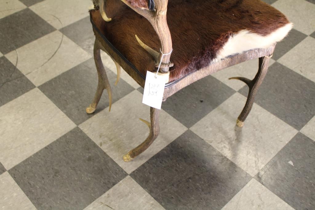 Antique horn and hide chair found in lodge near Livingston, Montana at the North Gate of Yellowstone showing beautiful carved feet of polished horn. Measures approximately 38” in height and 22 ½” id width with 19” deep Lot Title seat. Very good plus condition. Great for cabin lodge or western décor. Est.: $600-$1200