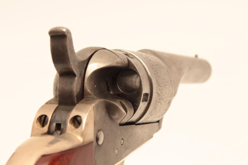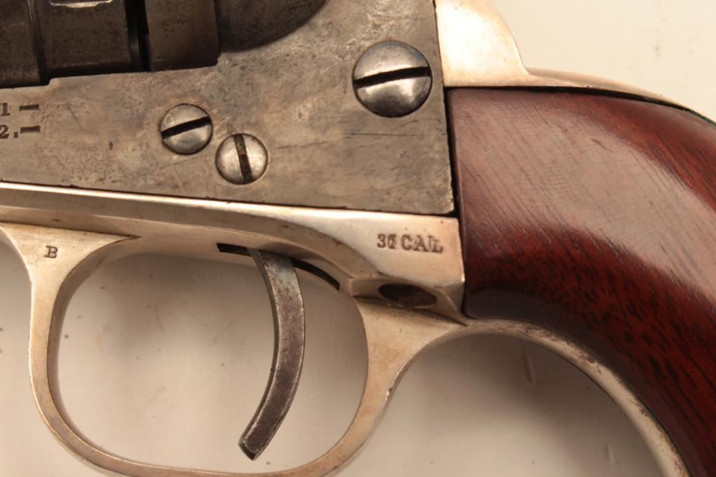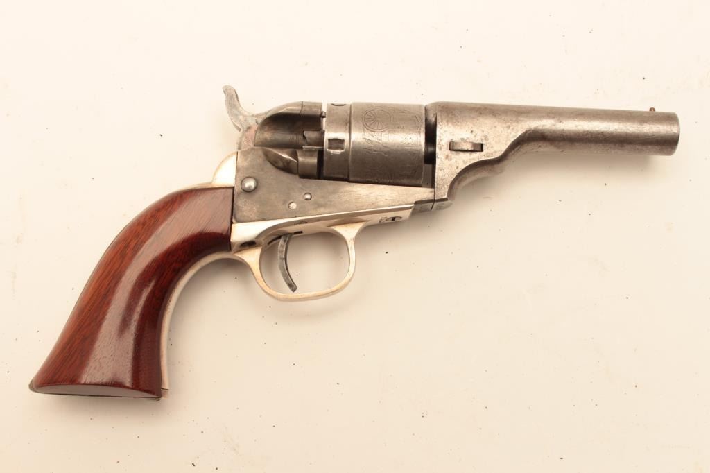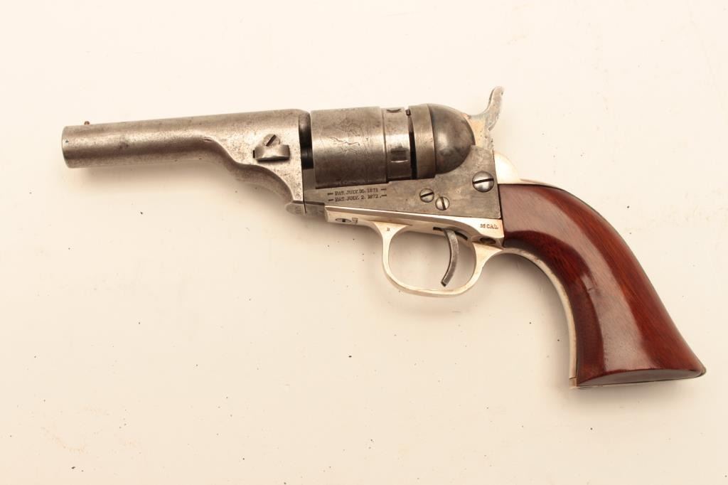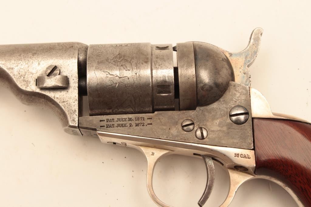 Colt .38 caliber rimfire made as cartridge arm using percussion parts and cartridge era produced 3 ½” round barrel with 71-72 patent dates and S/N 314129. Lightly cleaned barrel and cylinder with 30%-50% original case Lot Title colors. 40%-60% cylinder scene. The grips and straps are restored. All matching. (Antique) Est.: $300-$600