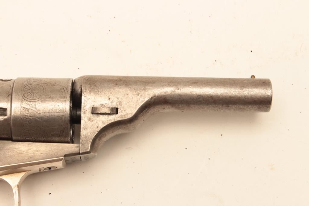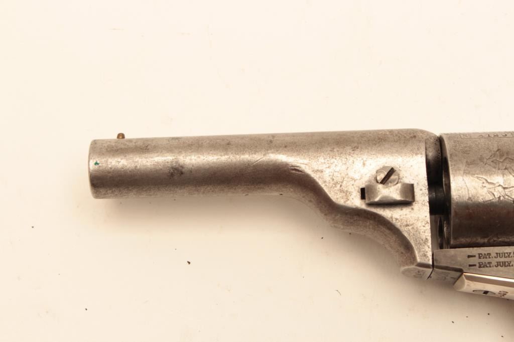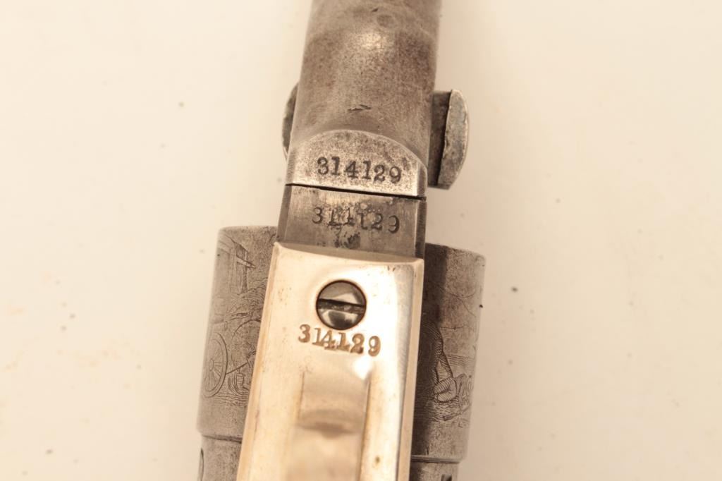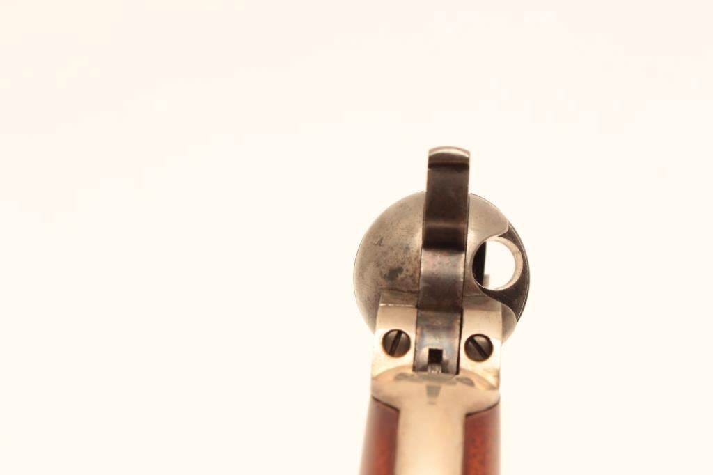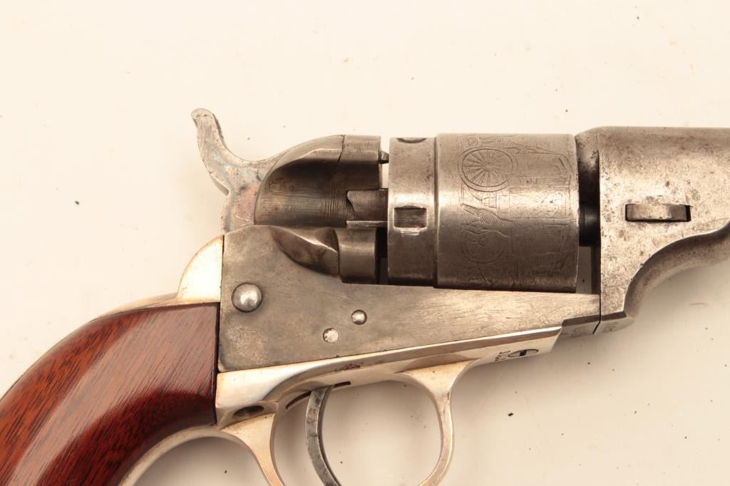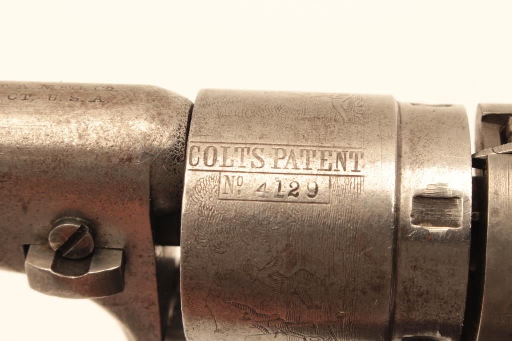 Colt .38 caliber rimfire made as cartridge arm using percussion parts and cartridge era produced 3 ½” round barrel with 71-72 patent dates and S/N 314129. Lightly cleaned barrel and cylinder with 30%-50% original case Lot Title colors. 40%-60% cylinder scene. The grips and straps are restored. All matching. (Antique) Est.: $300-$600