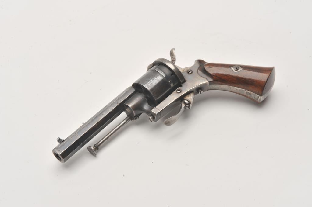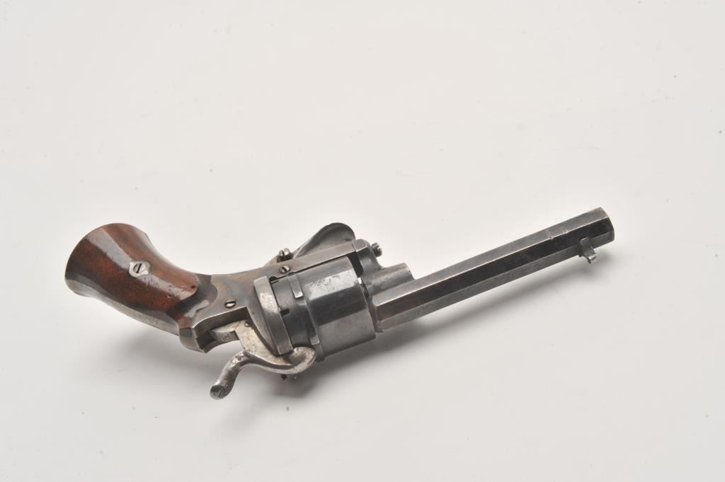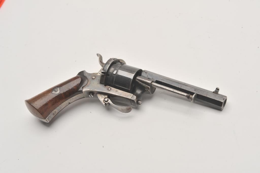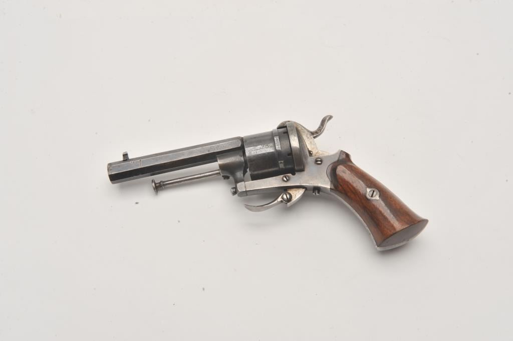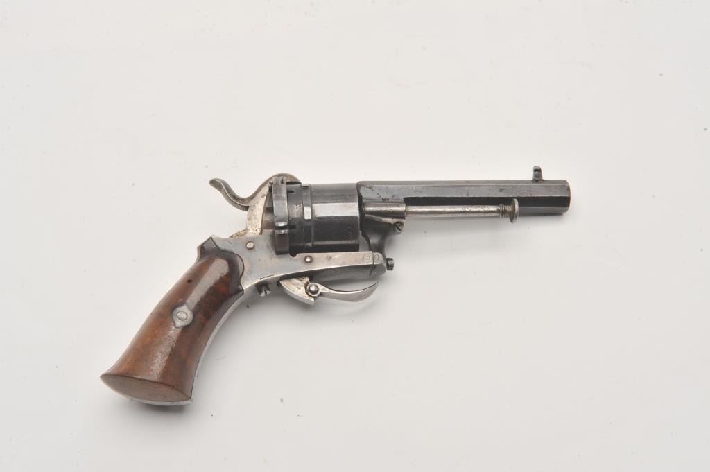 Belgium pinfire circa 1860s in 7.5mm with blue and case colored finish and wood grips. 75%-85% original finish. Tight action and crisp overall with very good grips. Measures 8” overall. Proofed but no makers name. Lot Title (Antique) Est.: $150-$300