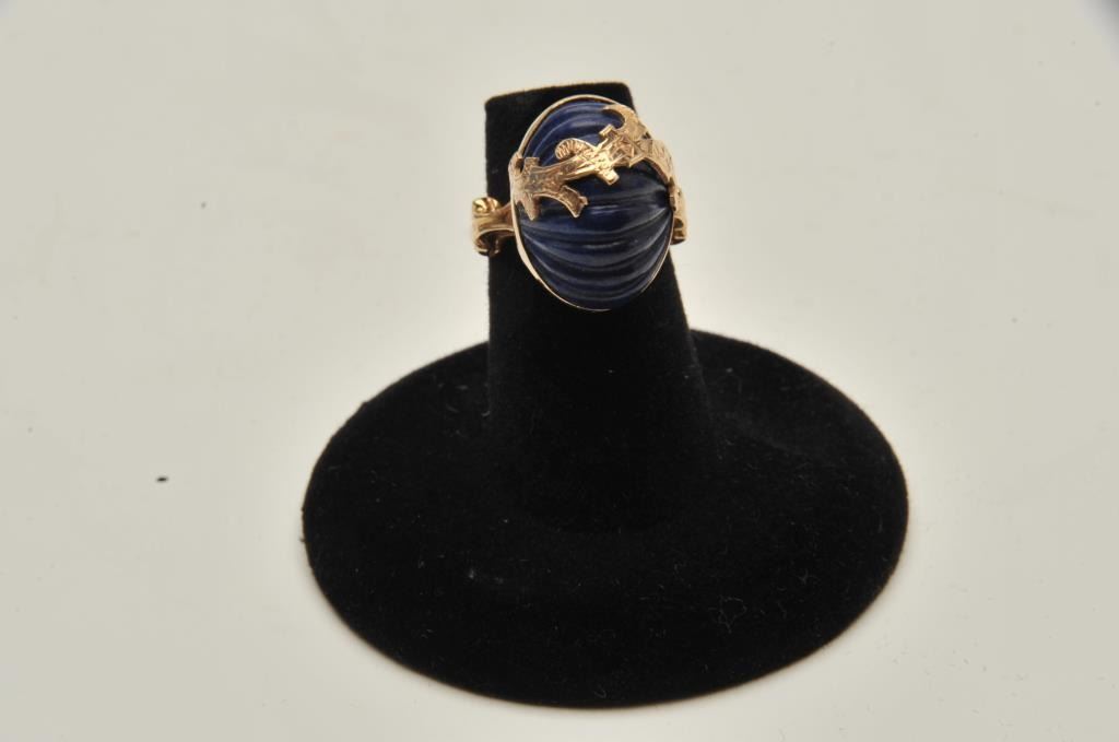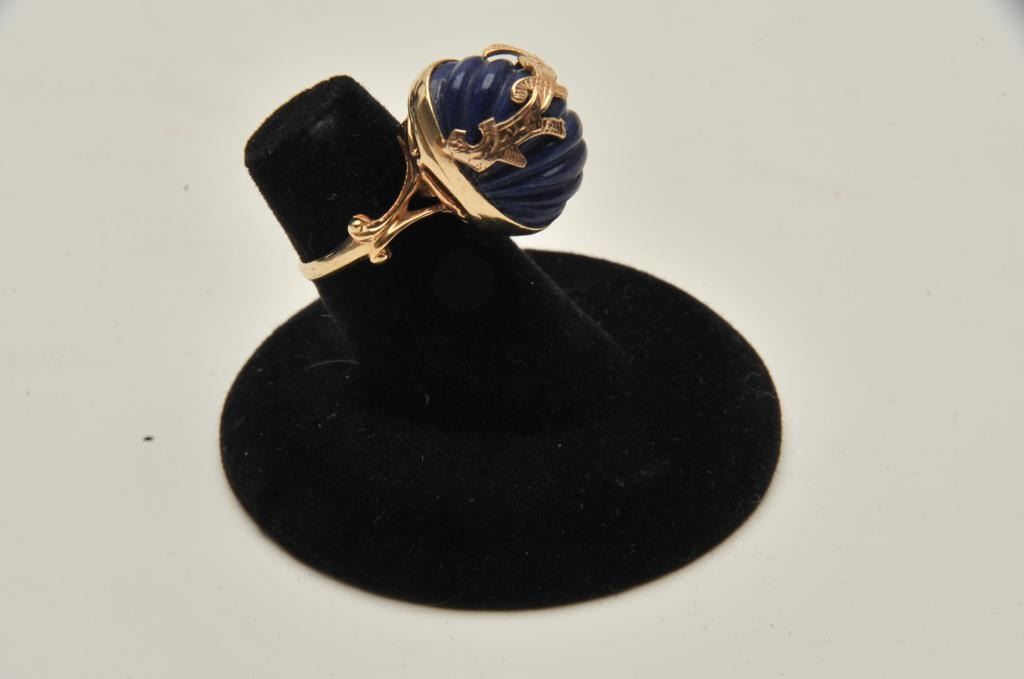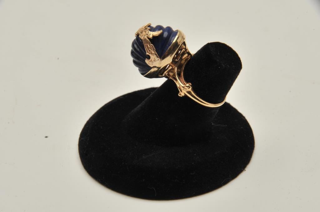 One custom designed ring in 14k yellow gold set with a carved lapislazuli Est:$400-500