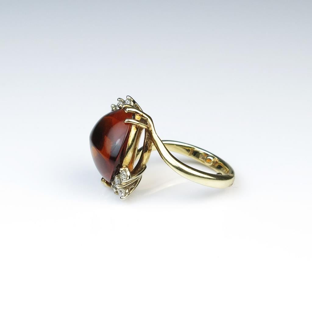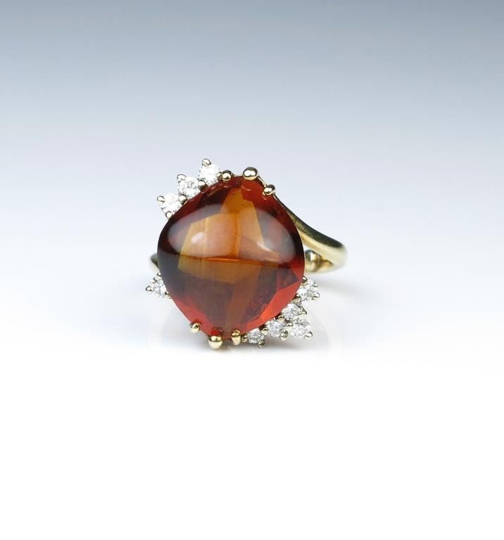 One of a kind vintage Citrine and Diamond ring featuring an organic shaped cabochon Citrine weighing approx. 8-10.00 carats accented with 9 round cut Diamonds weighing approx. 0.25 carats with F-G colors and VS/SI Lot Title clarity set in 14 karat setting. Retail $2,000-$2,400 Estimate $1,000-$1,500