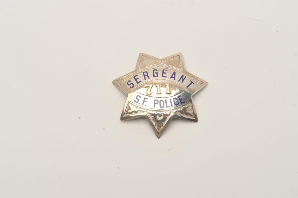 7 point star badge Sergeant S.F. Police (711/hallmark Samuels, SF; also stamped “STERLING” and “APR 12 19”). Est.: $150-$300.