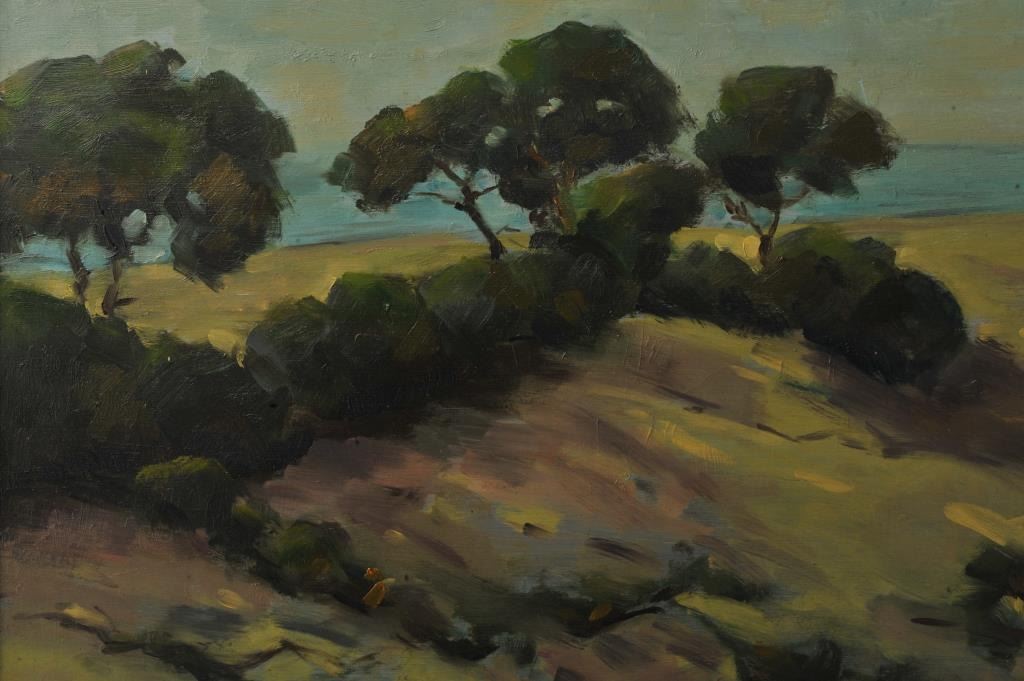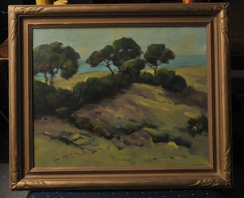 Oil on board of California style scene (Similar Millard Sheets) unsigned circa 1930s-50s. Nicely framed. Measures 15 ½” x 19 ½”. Est.: $175-$350