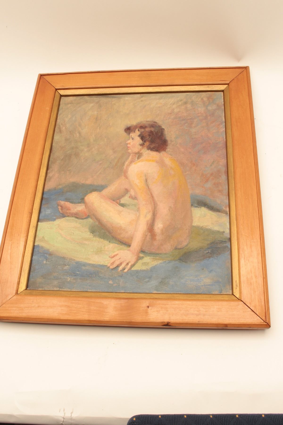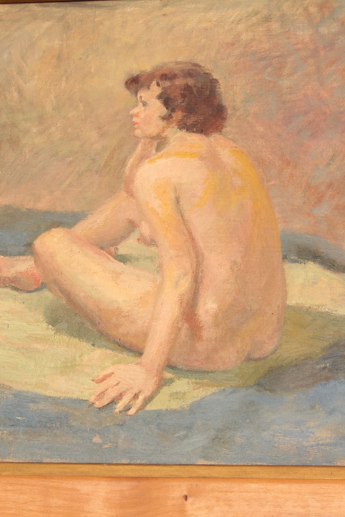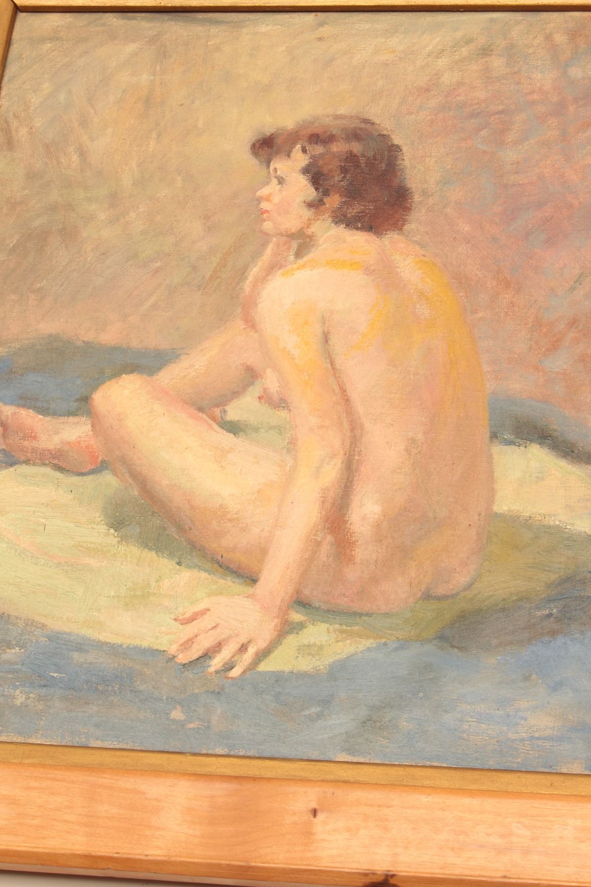 Oil on canvas on back “Adeleide McConnell, Haddonfield Beach, N.J.”. The subject is nude lady on beach. Measures 15 ½” x 19”. Framed. Est.: $250-$500