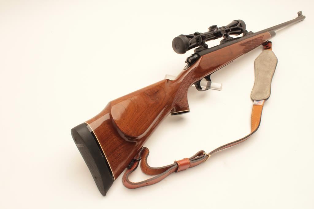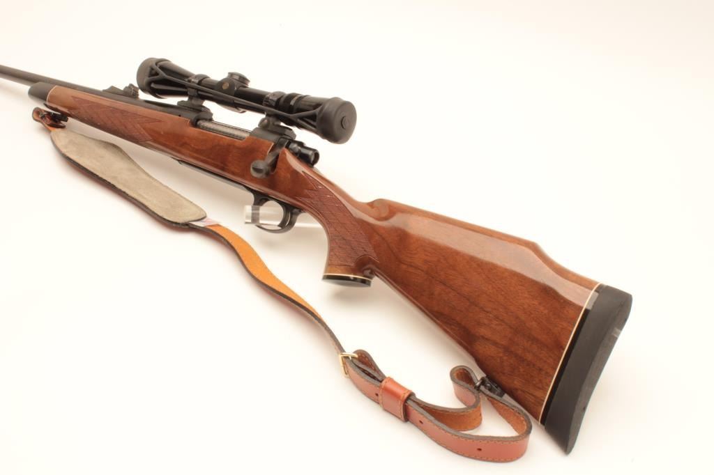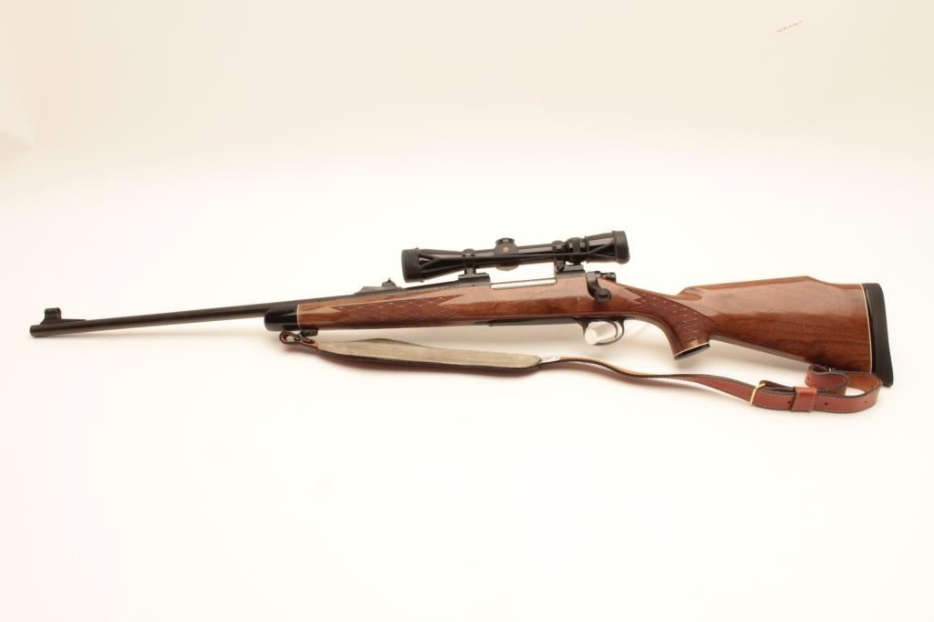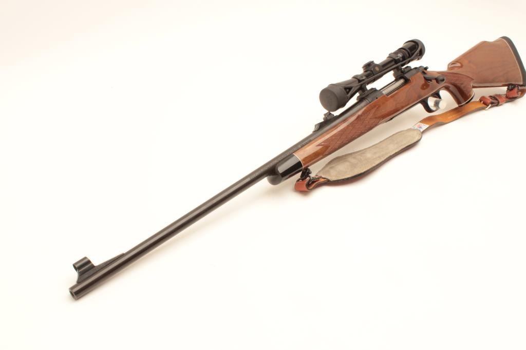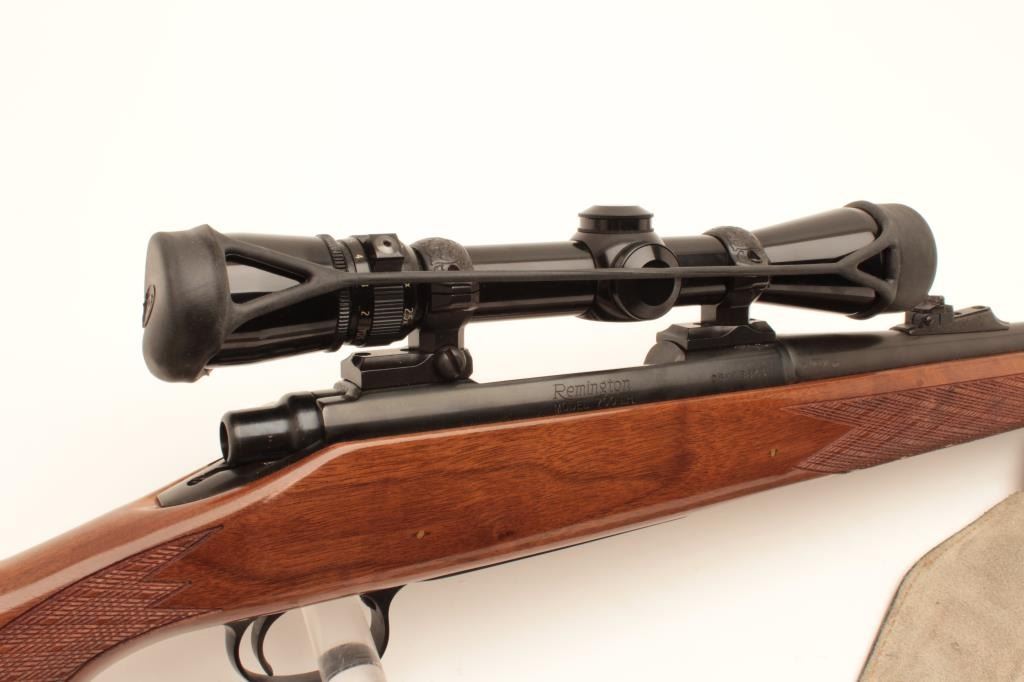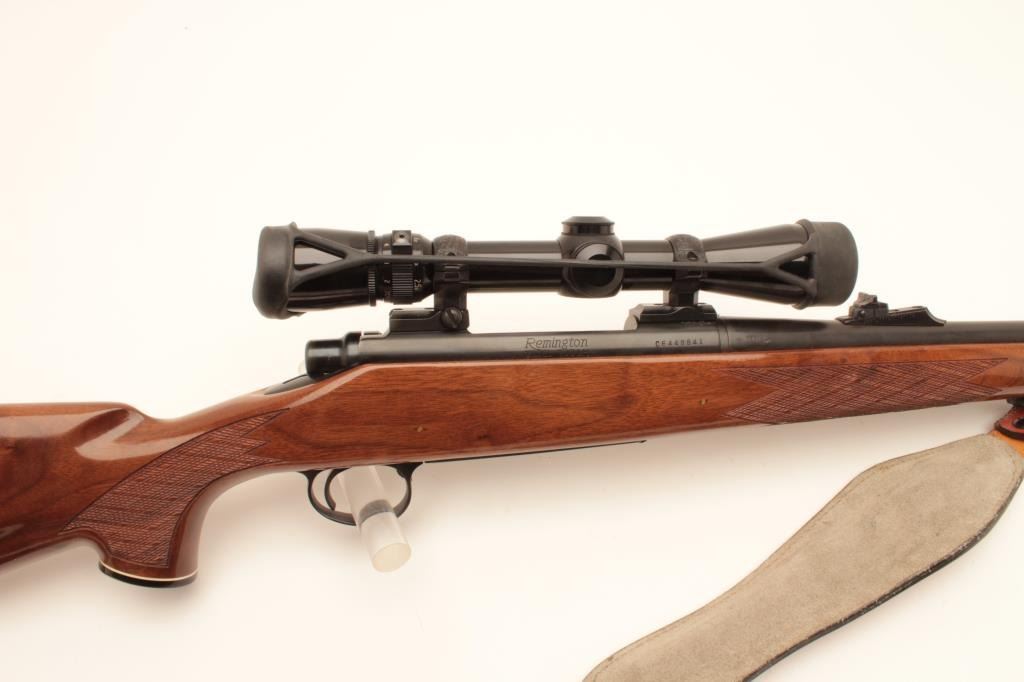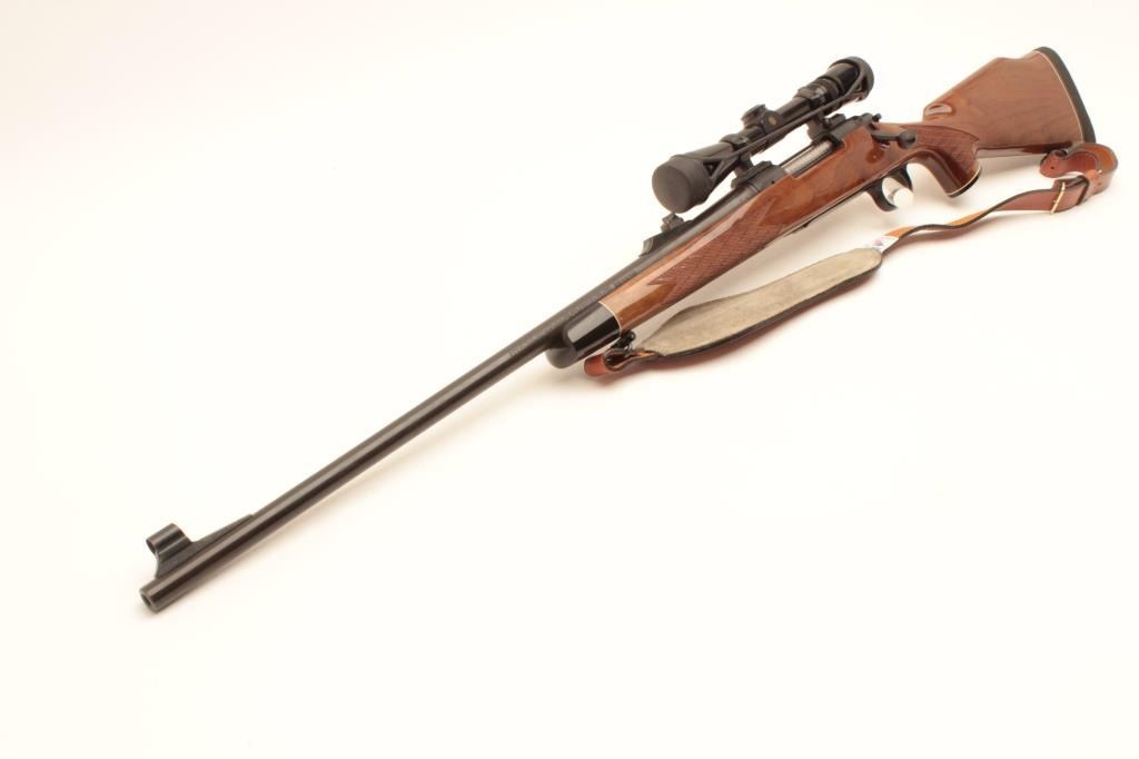 Left hand Remington Model 700 bolt action rifle, .338 Win. Mag. caliber, 25” barrel, blued finish, checkered wood stock, S/N C6448841, with leather sling and mounted with a Leupold Vari-X III 2.5 x 8 scope Lot Title displaying fine optics; the gun is also in overall fine condition with a fine bore, crisp action, sharp markings and fine wood stock. (Modern). Est.: $500-$1,000.