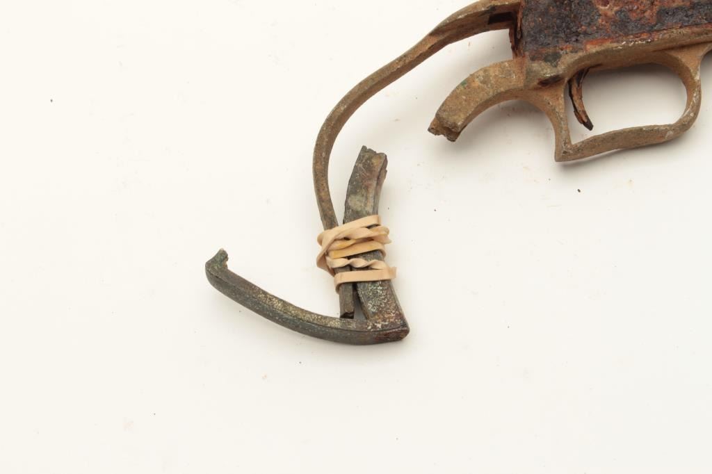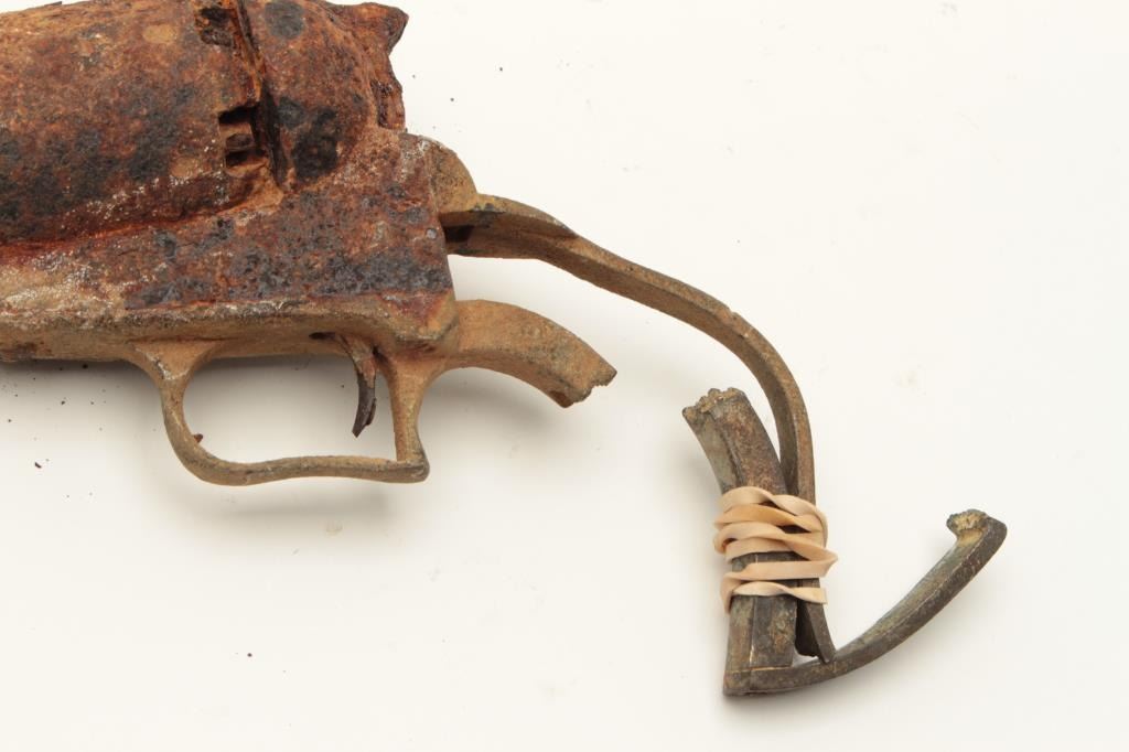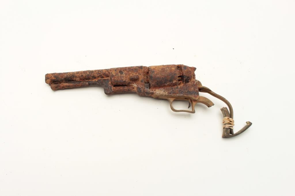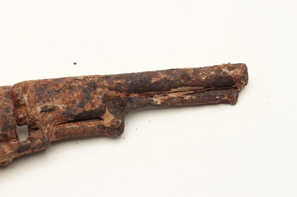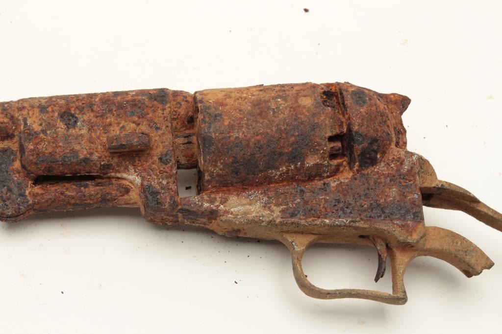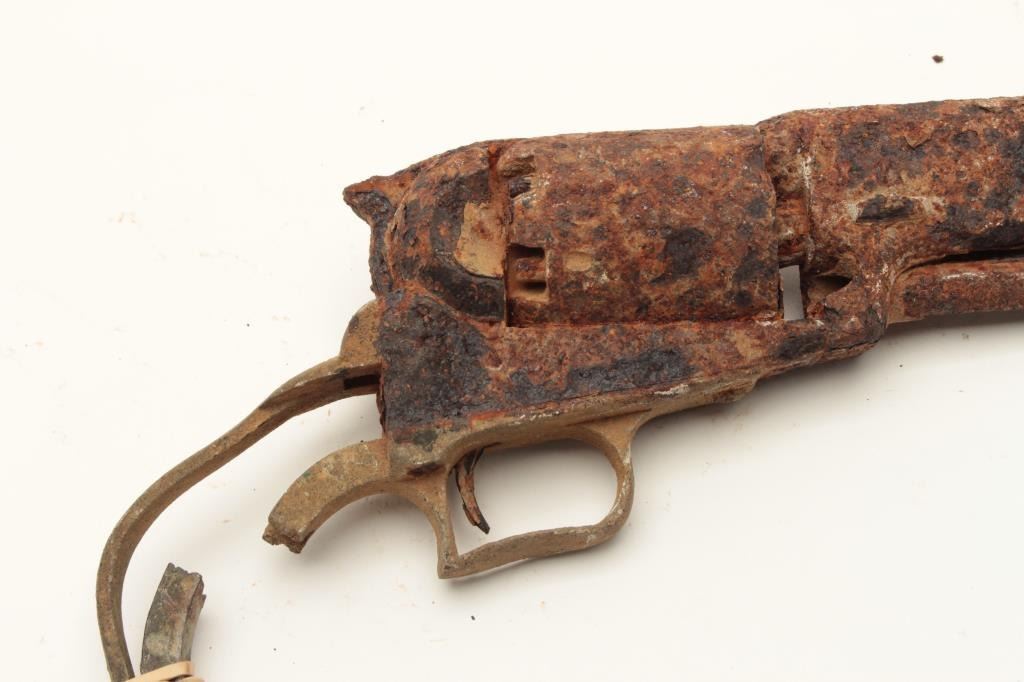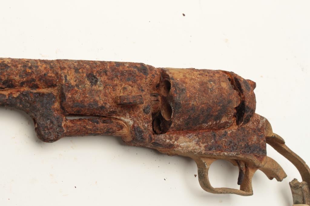 Rusty relic Colt First Model Dragoon percussion revolver; dented brass trigger guard and partial brass grip strap; heavily rusted, S/N appears to be 6063. From the collection of John O. Beckwith. Est.: Lot Title $500-$1,000.