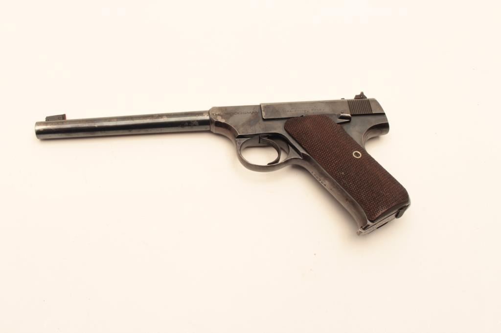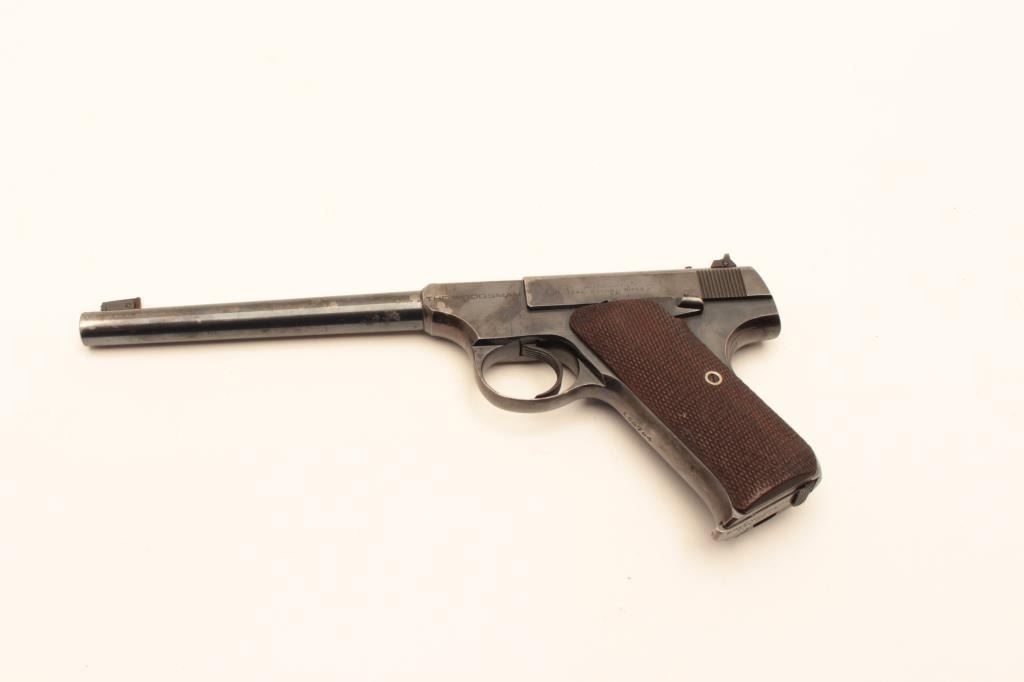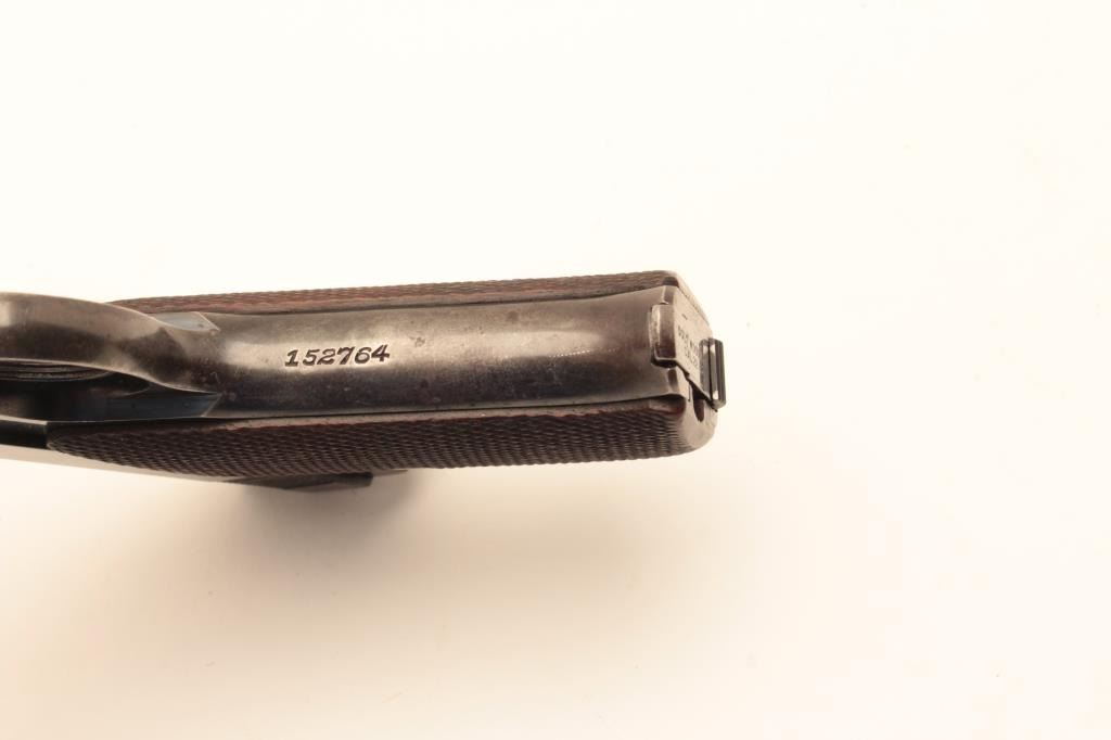 Colt Woodsman semi-automatic pistol, .22LR caliber, 6.5” barrel, blued finish, checkered wood grips, S/N 152764 (Hi Speed); in overall very good condition displaying majority of original blue with some spots of Lot Title erosion and wear; very good + bore, crisp action, sharp markings and good grips. (C&R). Est.: $500-$1,000.