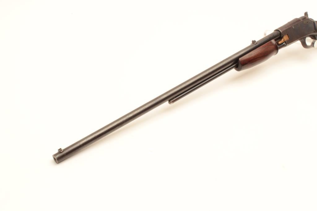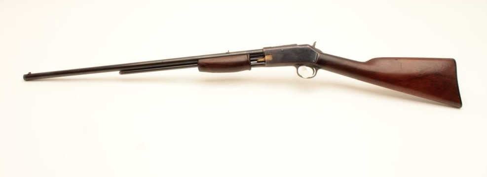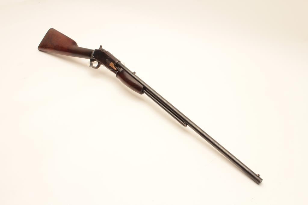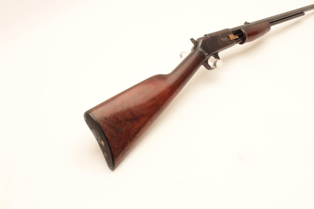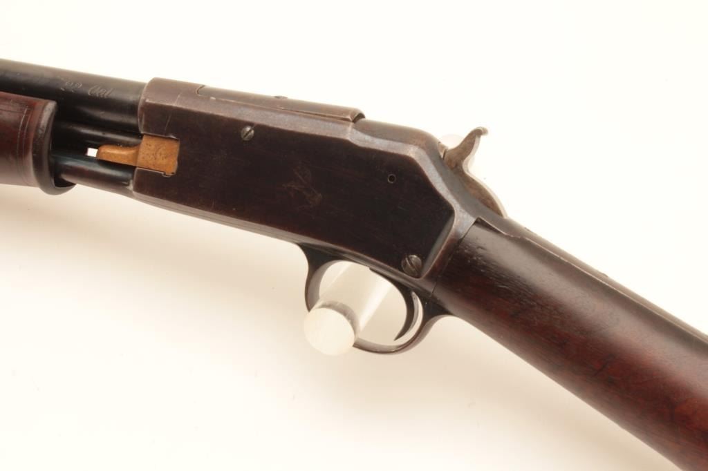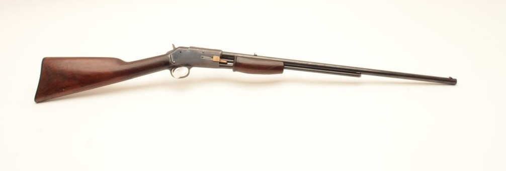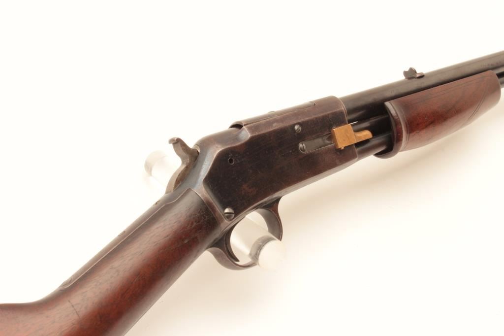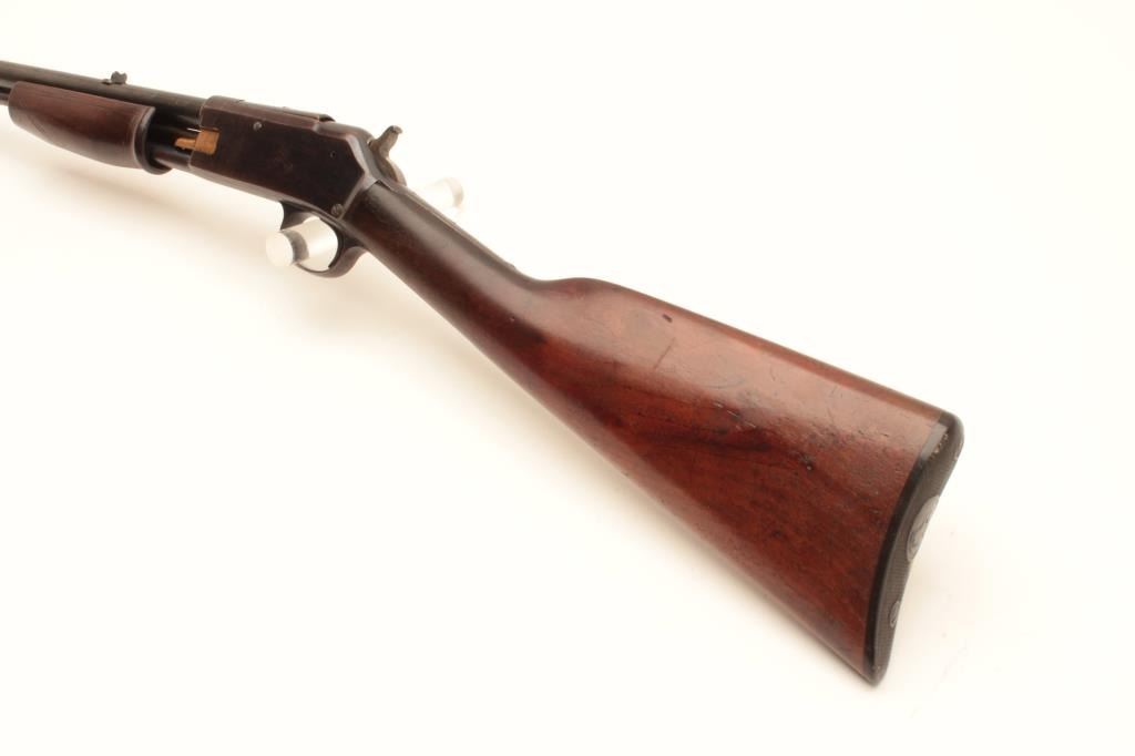 Colt Lightning pump action rifle, .22 caliber, 24” round barrel, blued finish, wood stocks, S/N 77667, in overall good + condition displaying the majority of its blued finish, good markings, crisp action, Lot Title overall good wood and fair + bore; original checkered hard rubber butt plate retained. (C&R). Est.: $800-$1,600.