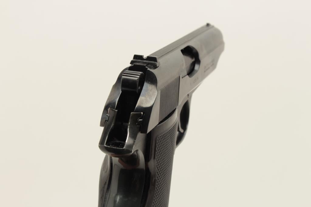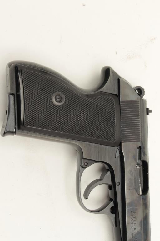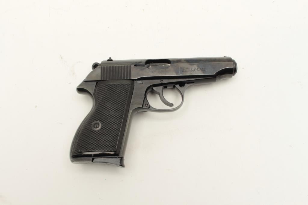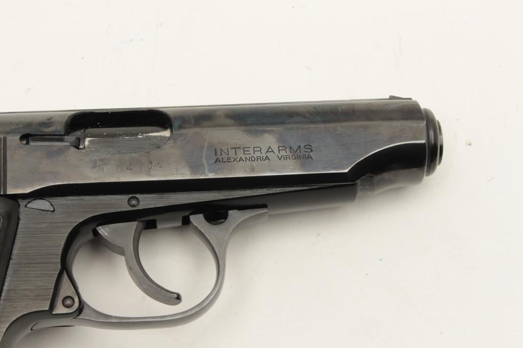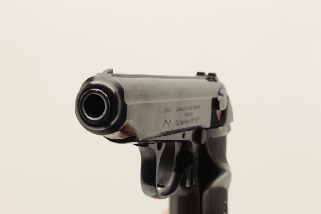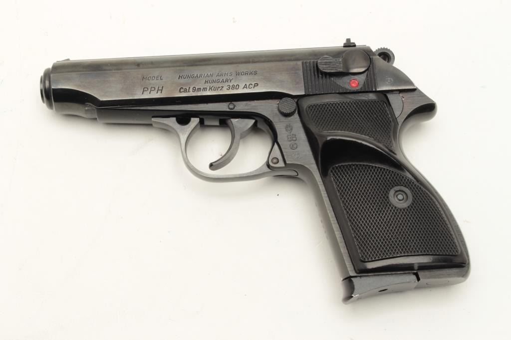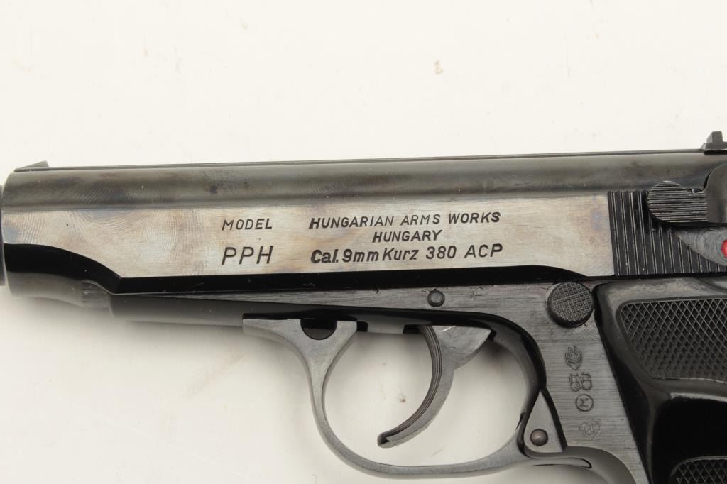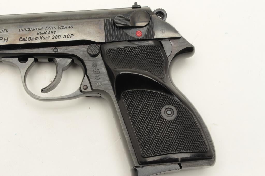 Hungarian Arms Works (FEG) Model PPH DA semi-automatic pistol, .380 caliber, 4” barrel, blued finish, checkered plastic grips, Interarms-marked on right side of slide, S/N N 02874 (all matching visible Lot Title numbers), in overall fine condition with fine bore, action, markings and grips. Accompanied by an extra factory magazine. (Modern/PPT). Est.: $250-$500.