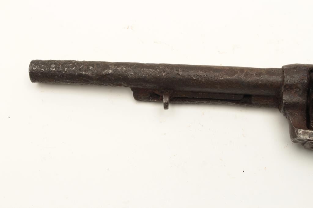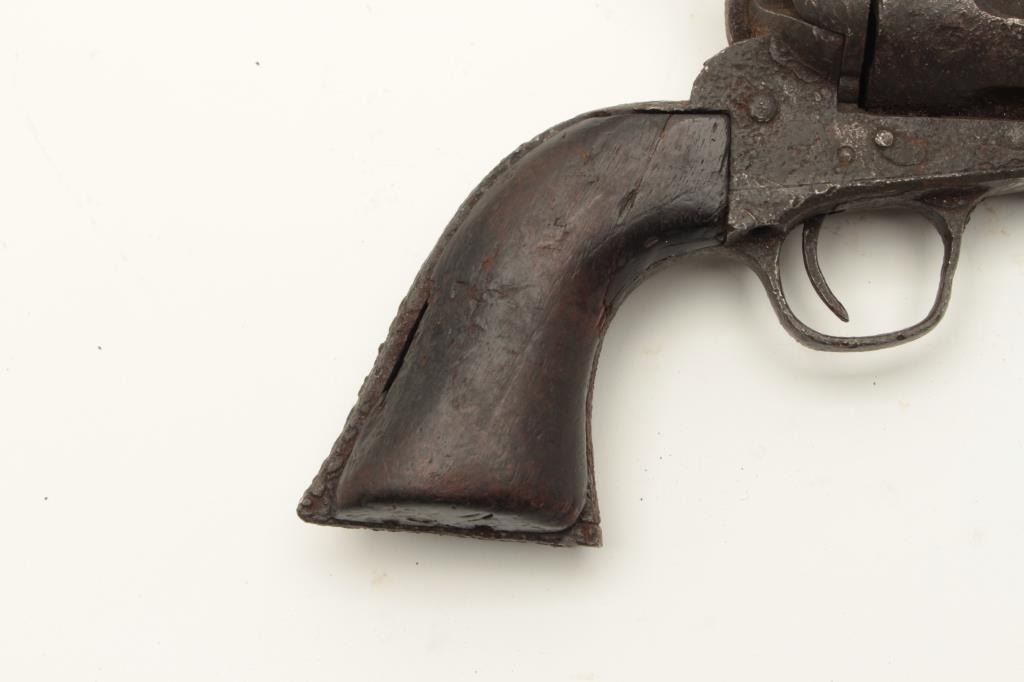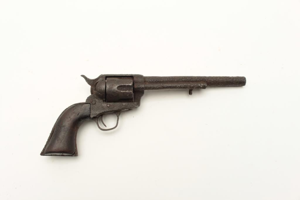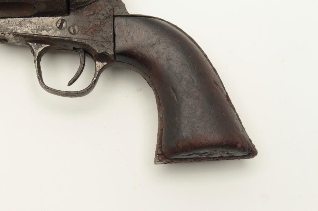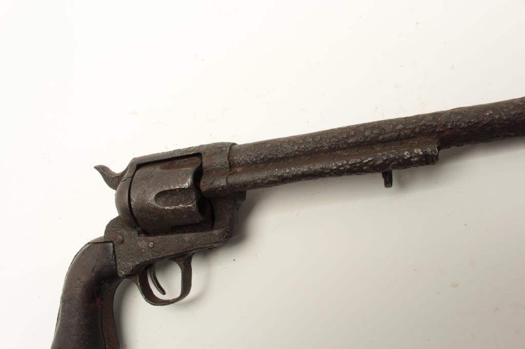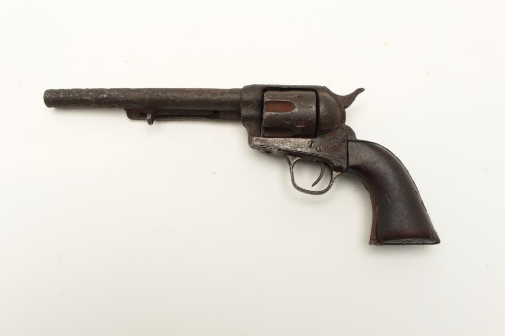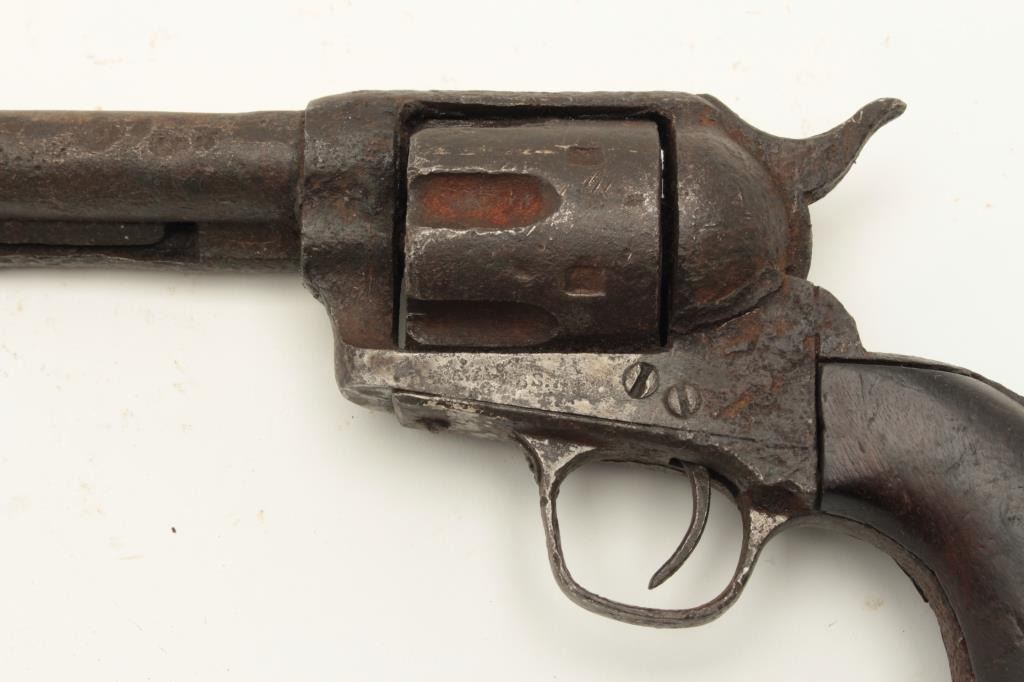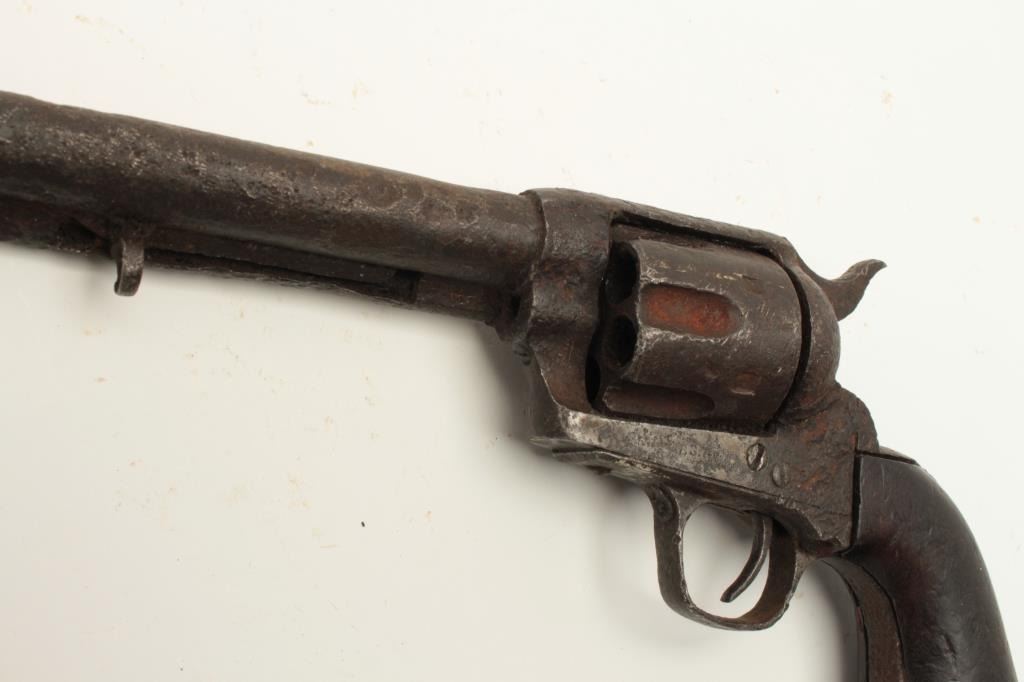 Rusty relic Colt U.S. marked SAA revolver, 7.5” barrel, S/N 16742 with wood grips; accompanied by a Jan. 23, 1999 John Kopec evaluation letter indicating this gun was a “Condemed” U.S. marked “Civilian” issued Lot Title revolver. From the collection of John O. Beckwith. Est.: $600-$1,200.