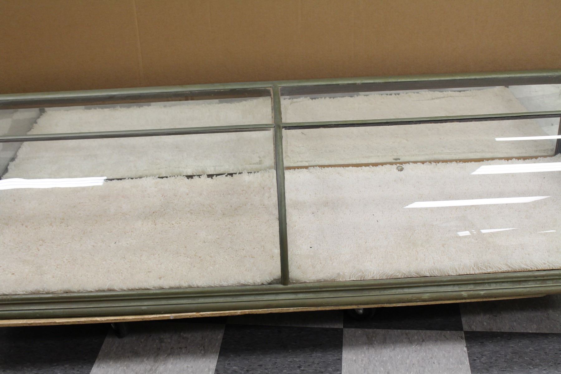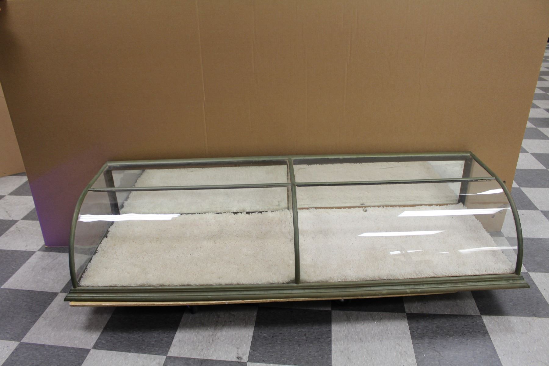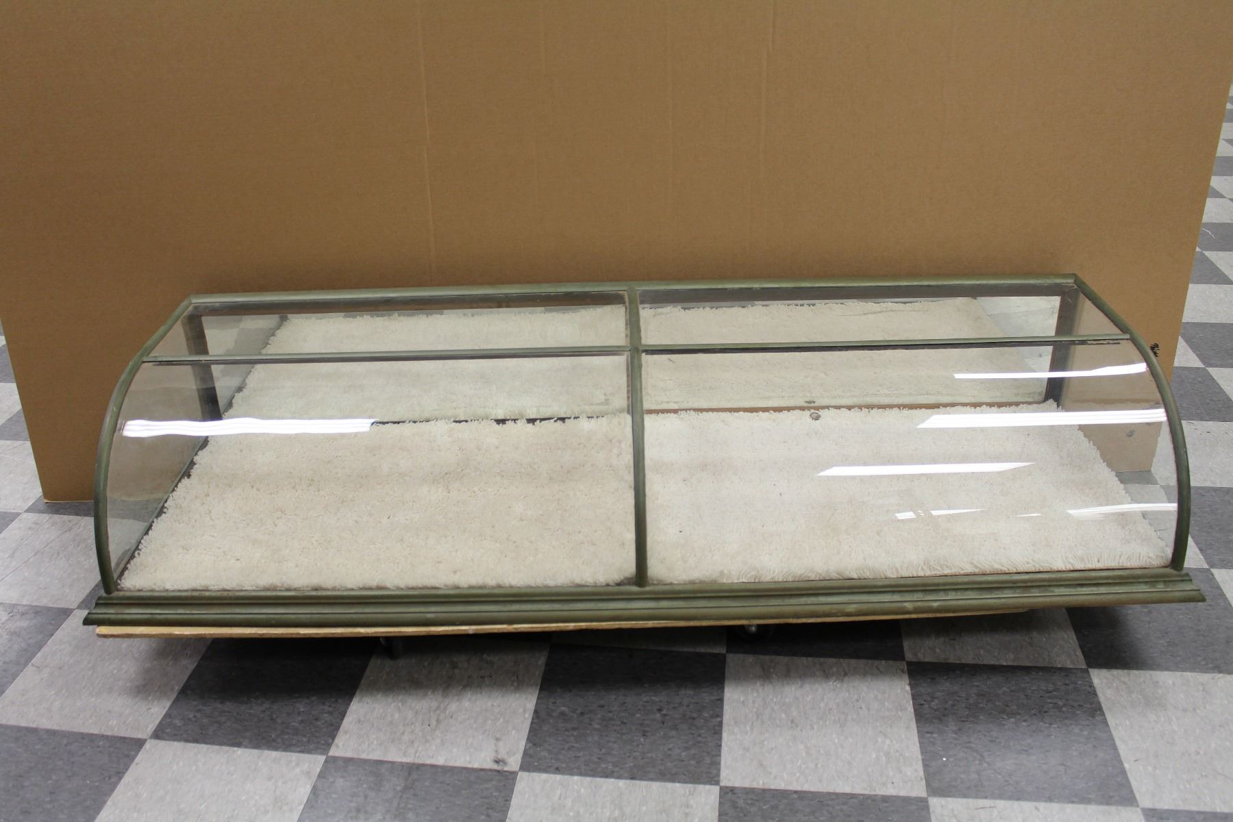 Double door antique curved glass showcase, approximately 72” long x 13” high x 25” deep; great for displaying a variety of collectibles and in overall good condition. Est.: $400-$800.