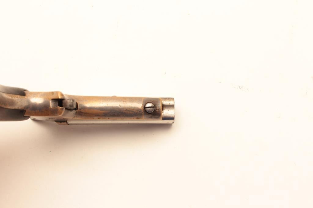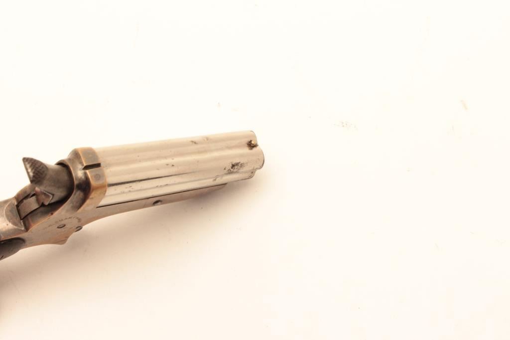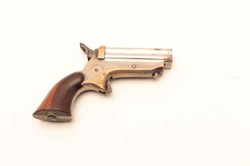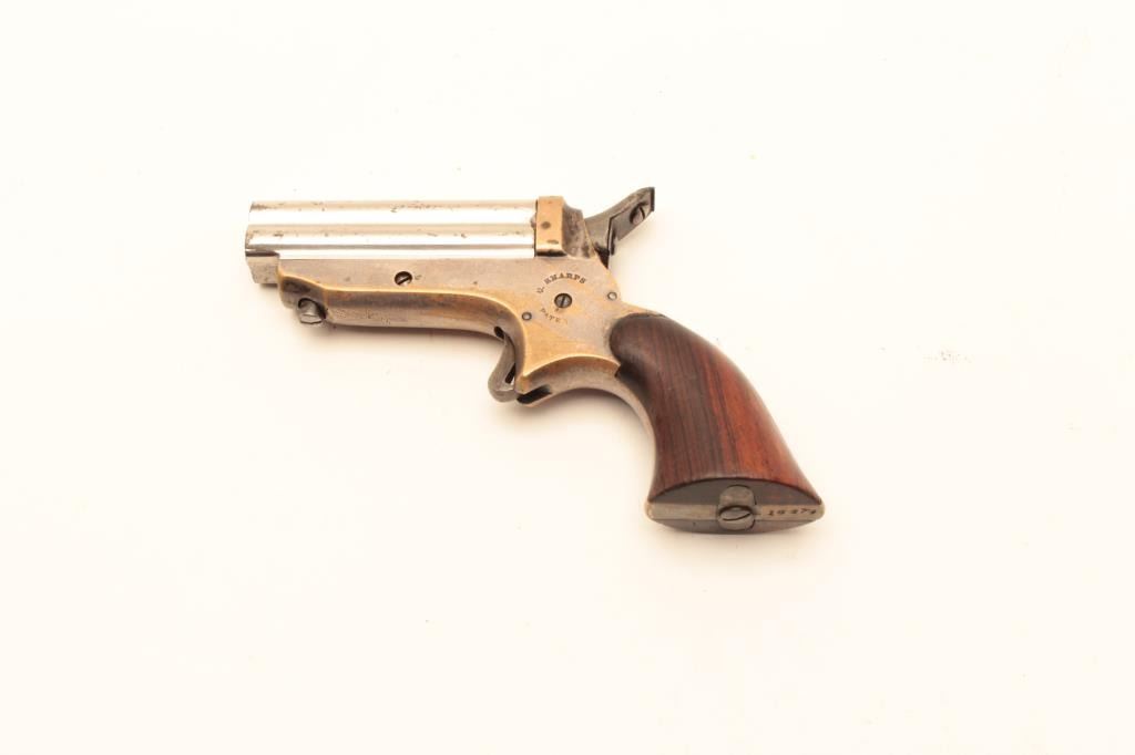 Early Civil War era Sharps 4 barrel derringer, .22 caliber, 2.5” barrel group, nickel finish to barrels, traces of silver plating to brass frame, rosewood grips, S/N 16879 (matching barrel number), in overall Lot Title good condition with good action, good grips and markings approximately 70% visible (as is the case with many of this model). (Antique). Est.: $300-$600.