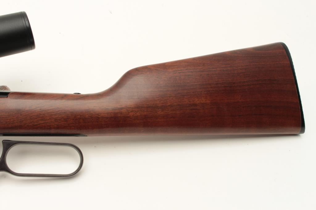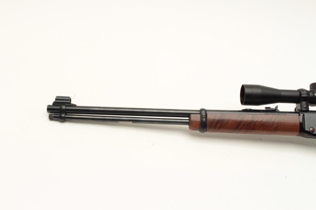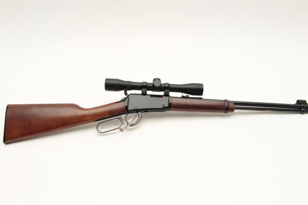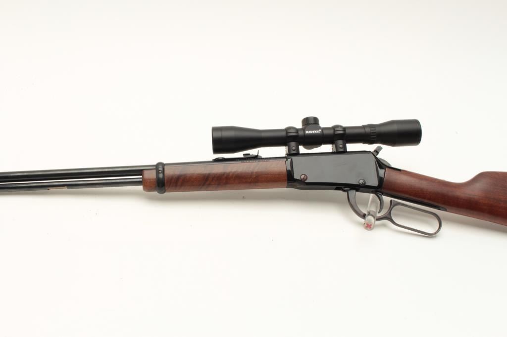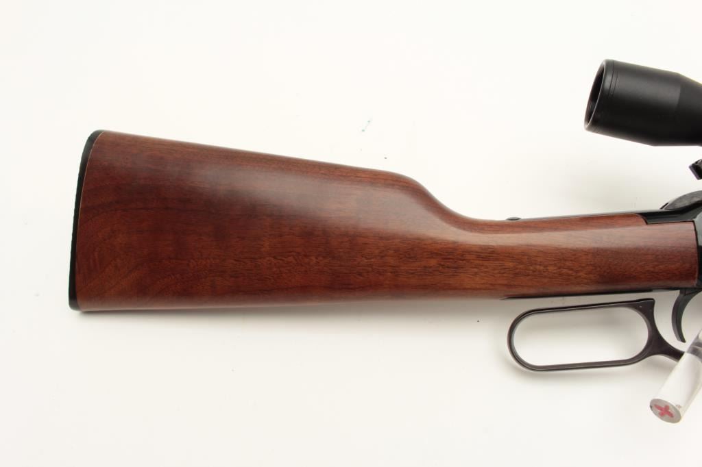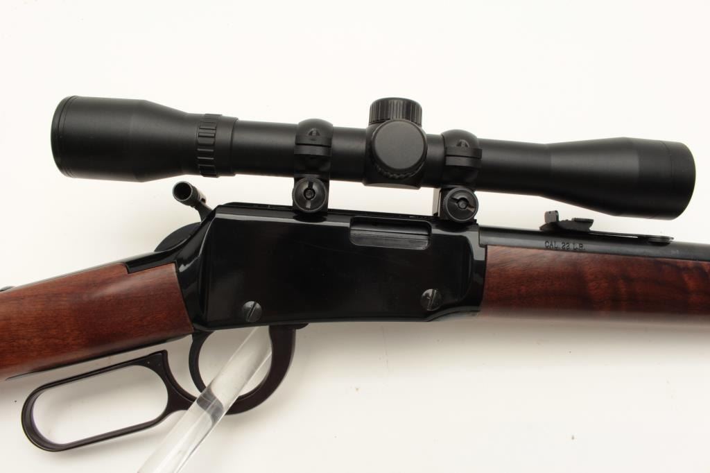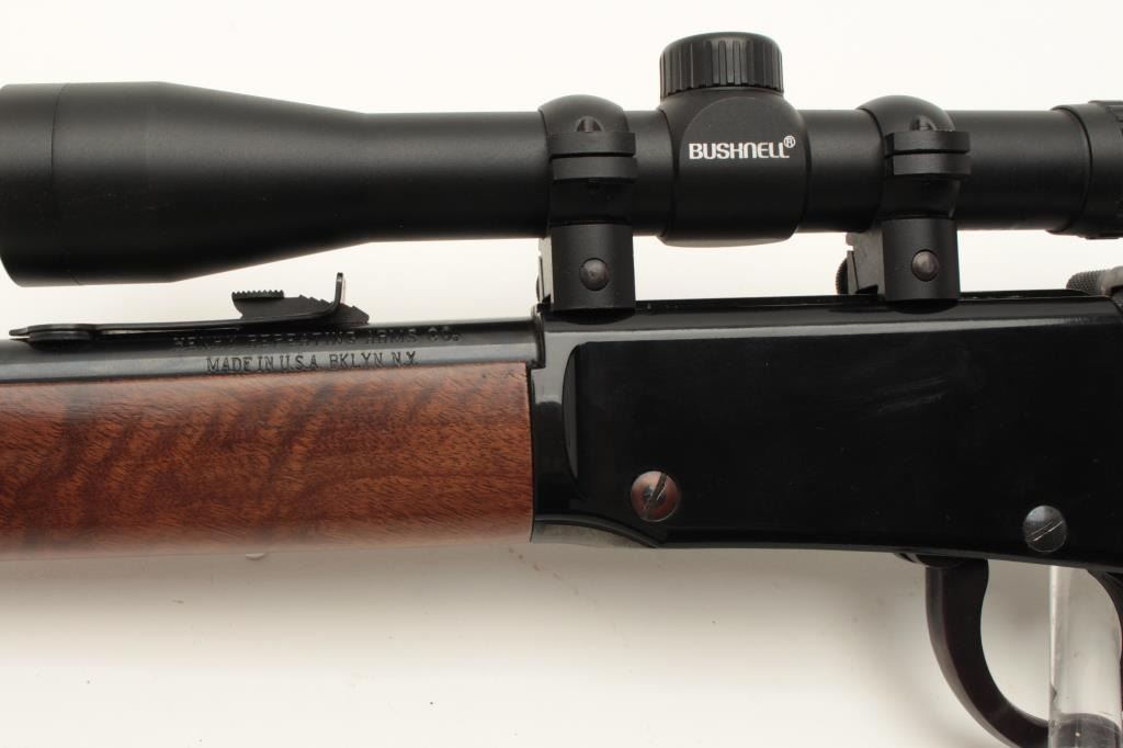 Henry Repeating Arms Co. lever action carbine, .22LR caliber, 18.5” barrel, black finish, wood stocks, S/N 051716, mounted with a Bushnell scope displaying crisp optics; in like new condition with factory cardboard Lot Title box and instructions manual. (Modern). Est.: $350-$700.