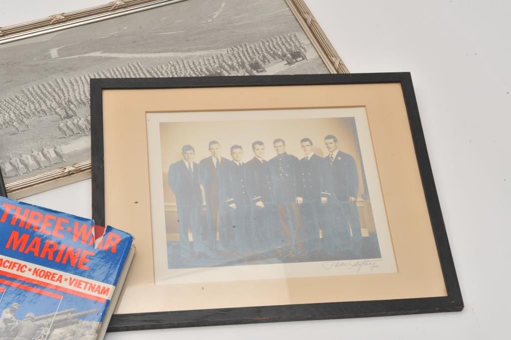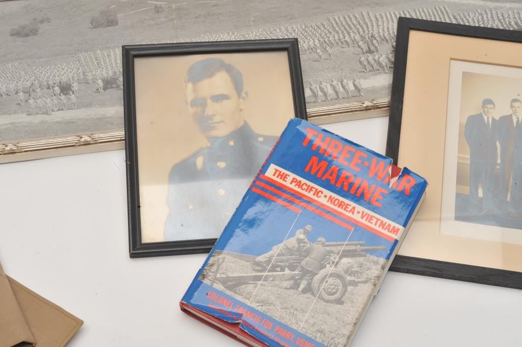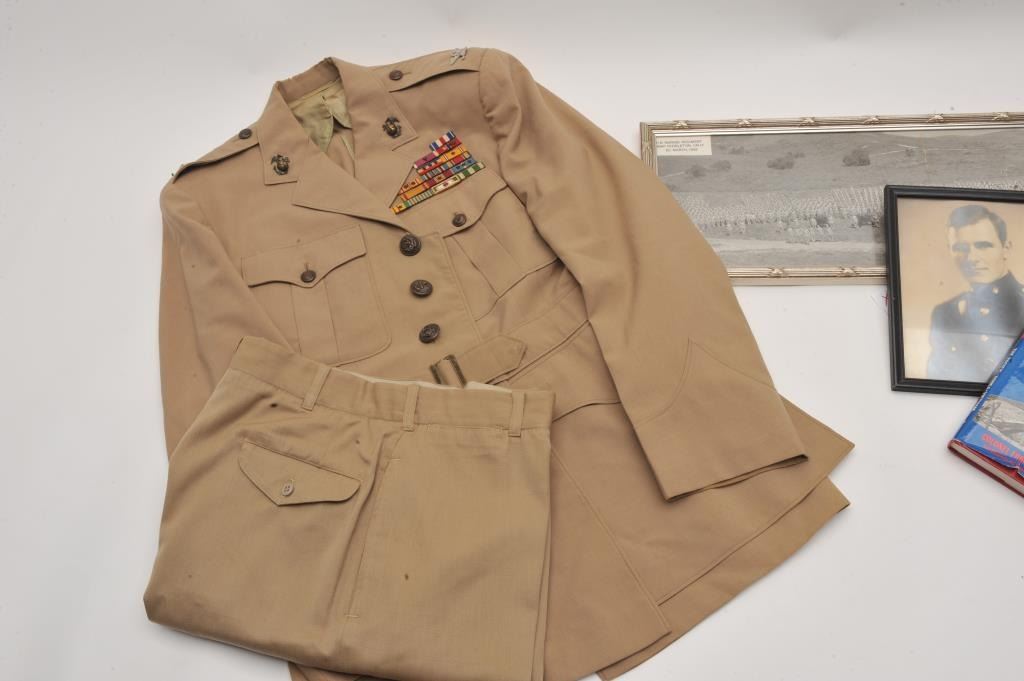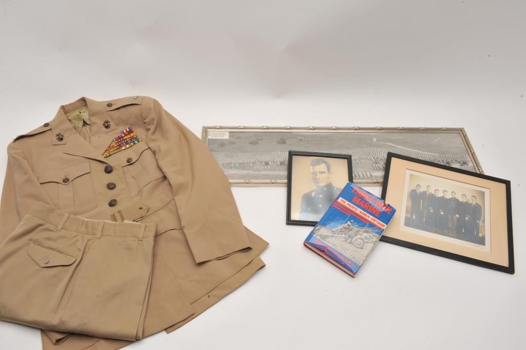 Ensemble belonging to Colonel Francis Fox Parry U.S.M.C. Parry served with distinction in the Pacific WWII, Korea and Vietnam. Ensemble consists of his Dress Uniform with Silver Eagles and Full Ribbons for Service. Lot Title Name on interior breast label. With wide view Photograph of him at command in Camp Pendleton March 1962. Another photo of him with Brothers of young officer 1941. Single studio photo as young officer. Parry was a Lot Title field Artillery Officer "Who turned makeshift operations to successful campaigns" according to "Three War Marine" book with copy of exciting text. Est:$300-600