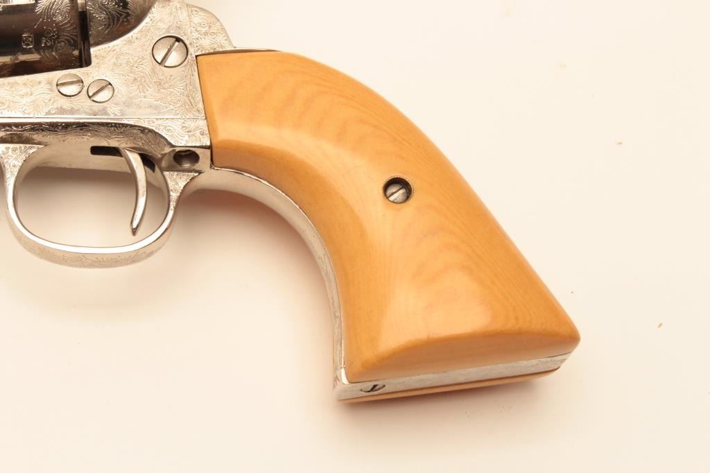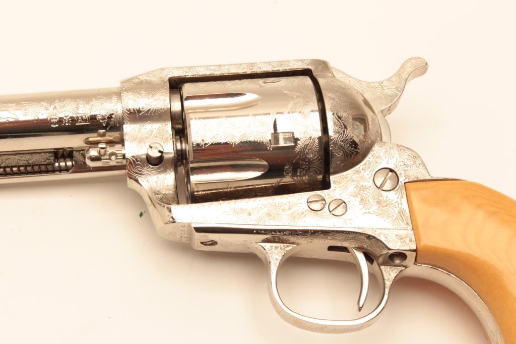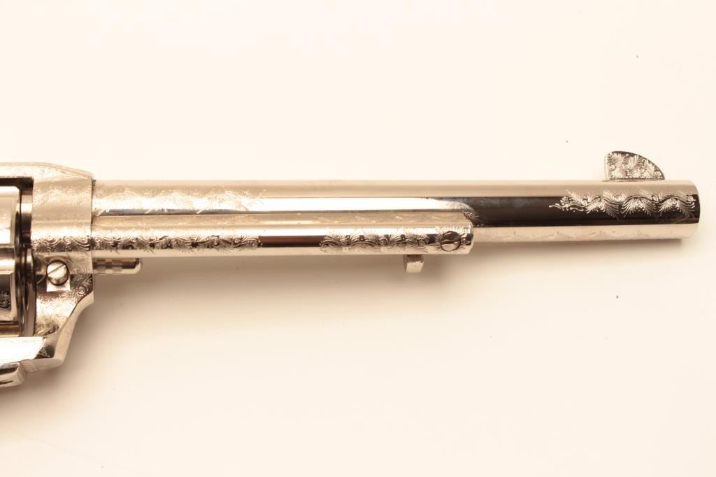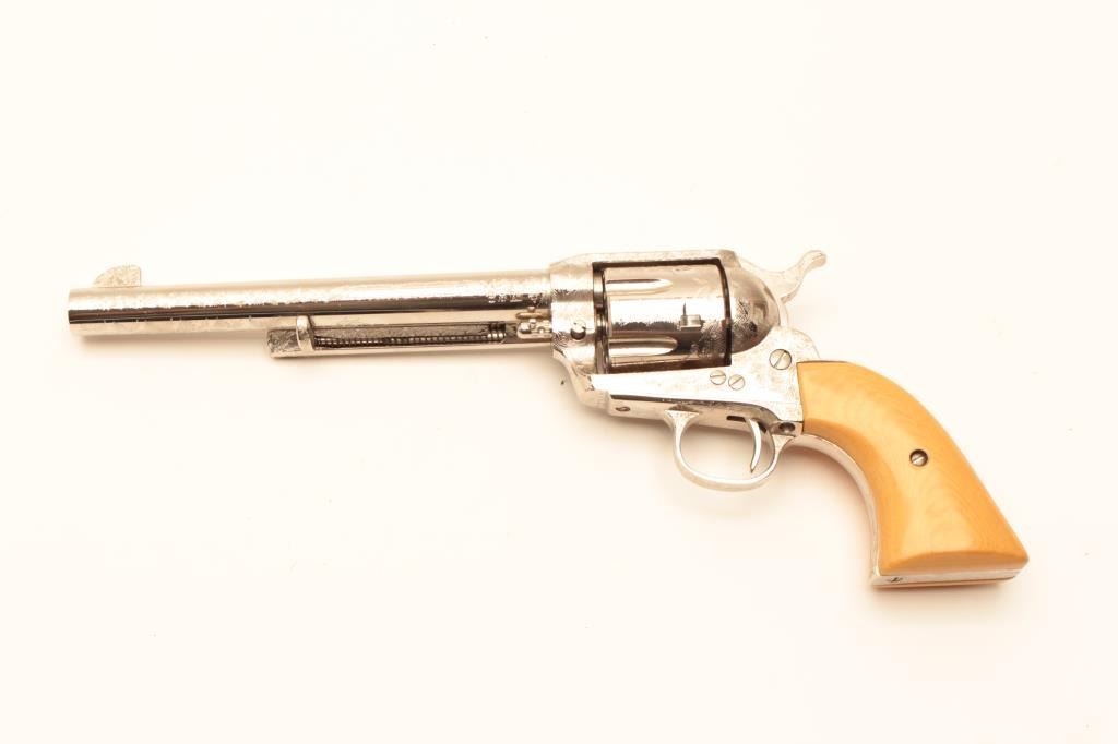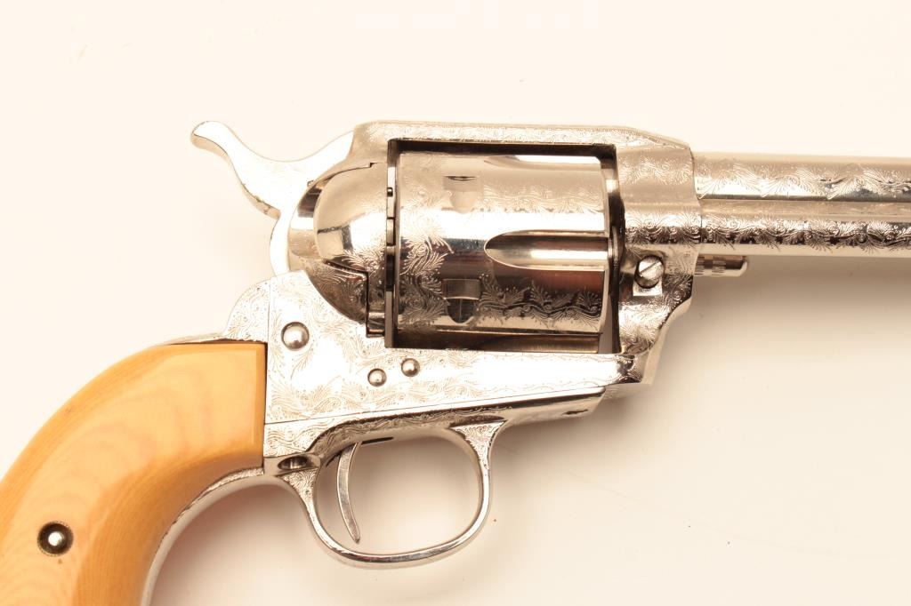 Dakota .45 Colt Caliber Single Action revolver with a 7 ½” barrel, nickel finish, engraved, simulated ivory grips, S/N 77956. Extra wood grips. Like new in box. Consignor note indicates “Jim Walker Special” Long Lot Title Beach. (Modern/PPT) Est.: $600-$1200