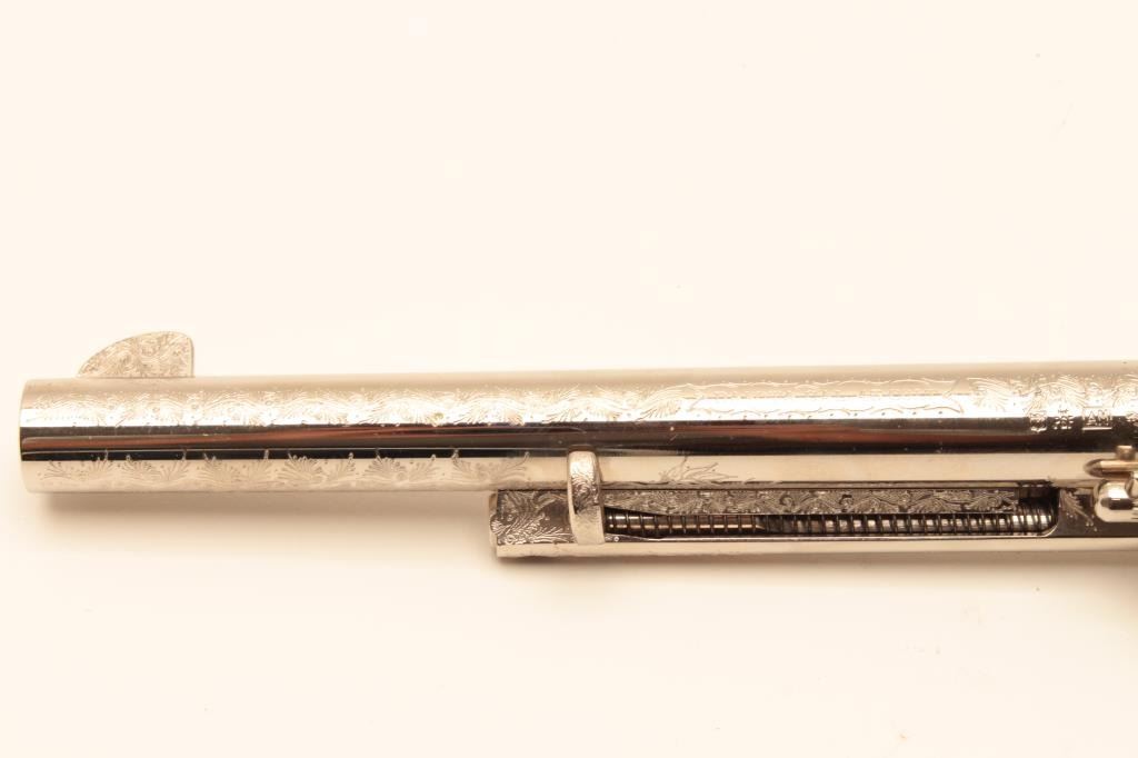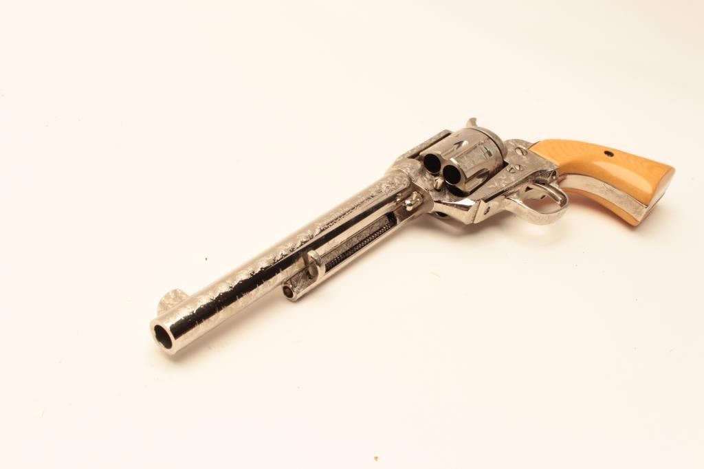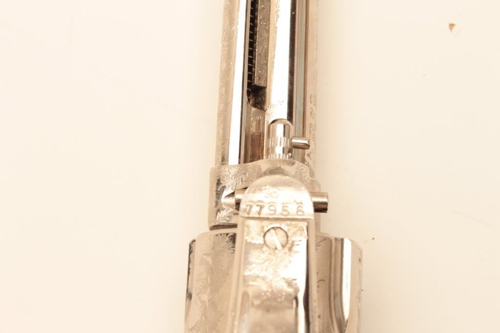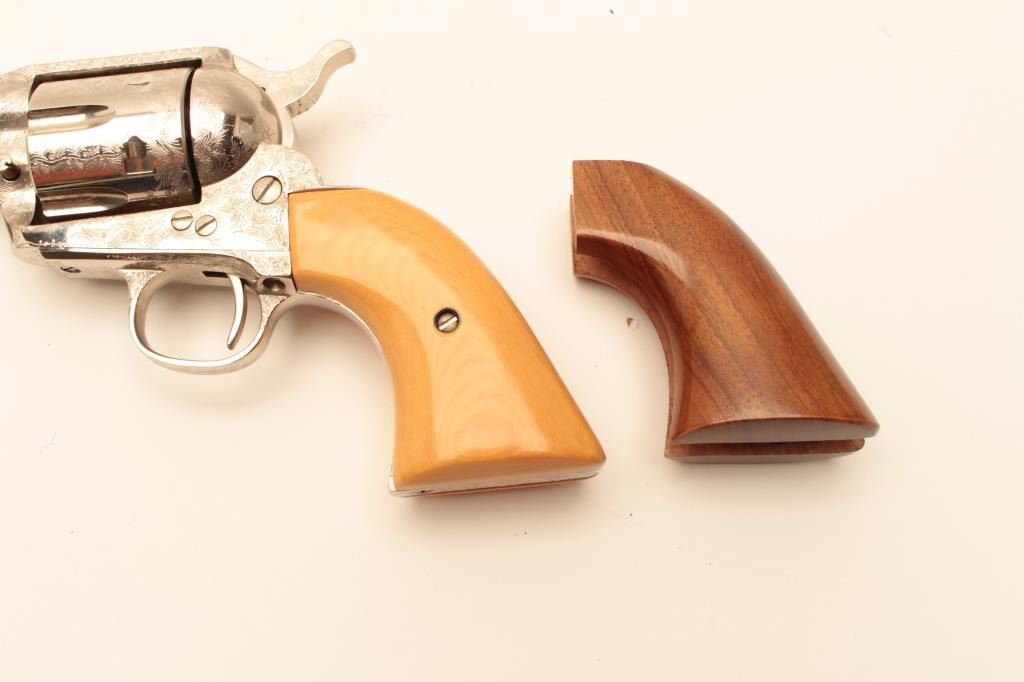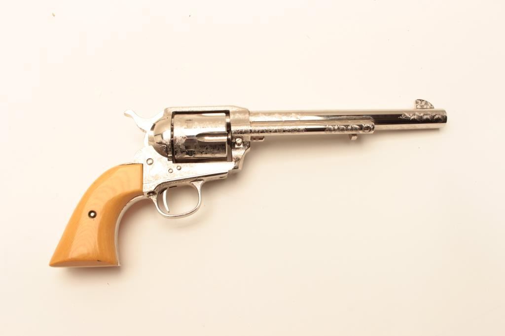 Dakota .45 Colt Caliber Single Action revolver with a 7 ½” barrel, nickel finish, engraved, simulated ivory grips, S/N 77956. Extra wood grips. Like new in box. Consignor note indicates “Jim Walker Special” Long Lot Title Beach. (Modern/PPT) Est.: $600-$1200