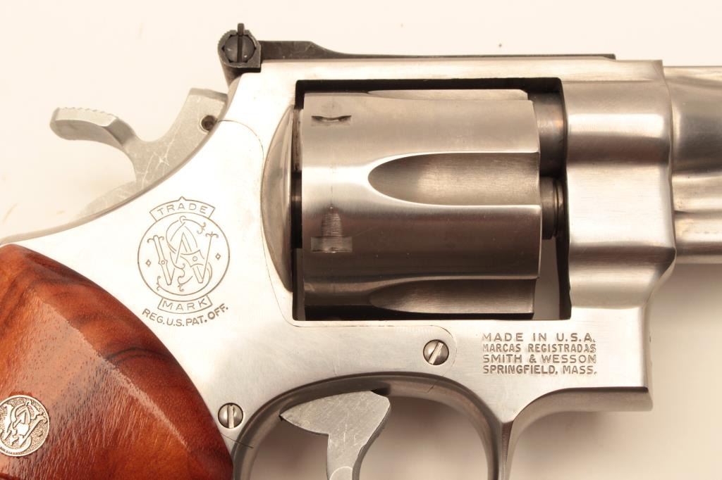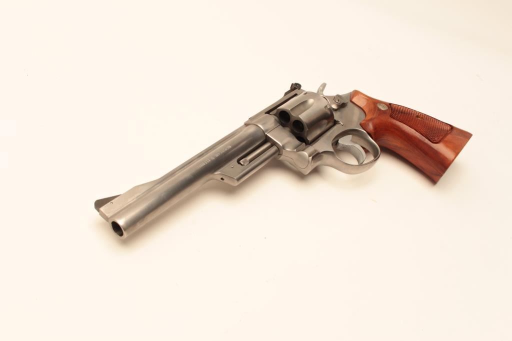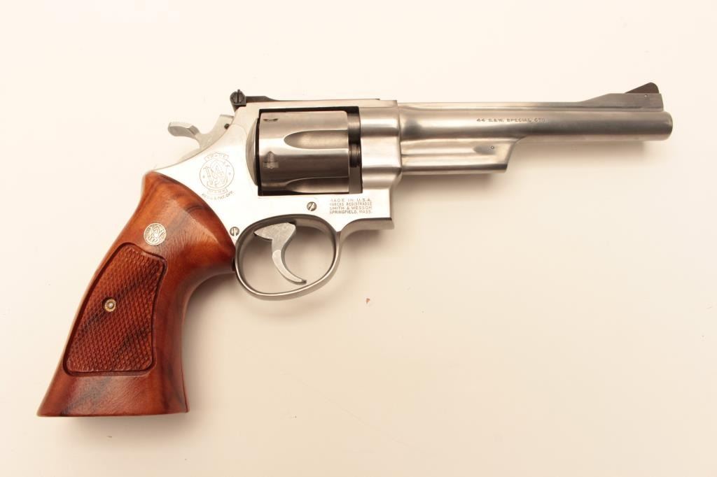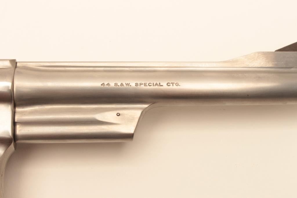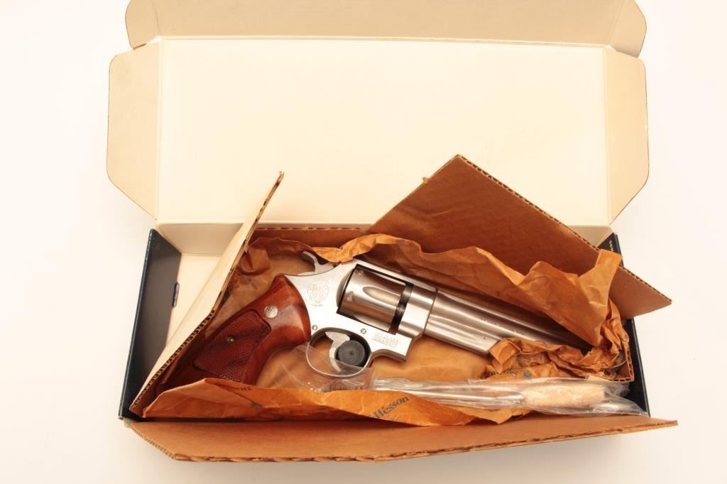 Smith & Wesson Model 624 Double Action revolver in .44 S&W caliber with a 6 ½” barrel, stainless steel, and target features, S/N AH00020. Fine to excellent used condition in box. 97%-99% with some firing Lot Title apparent. (Modern/PPT) Est.: $500-$1000