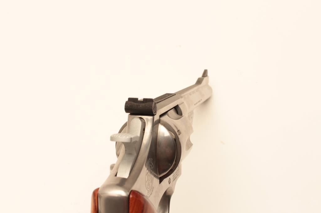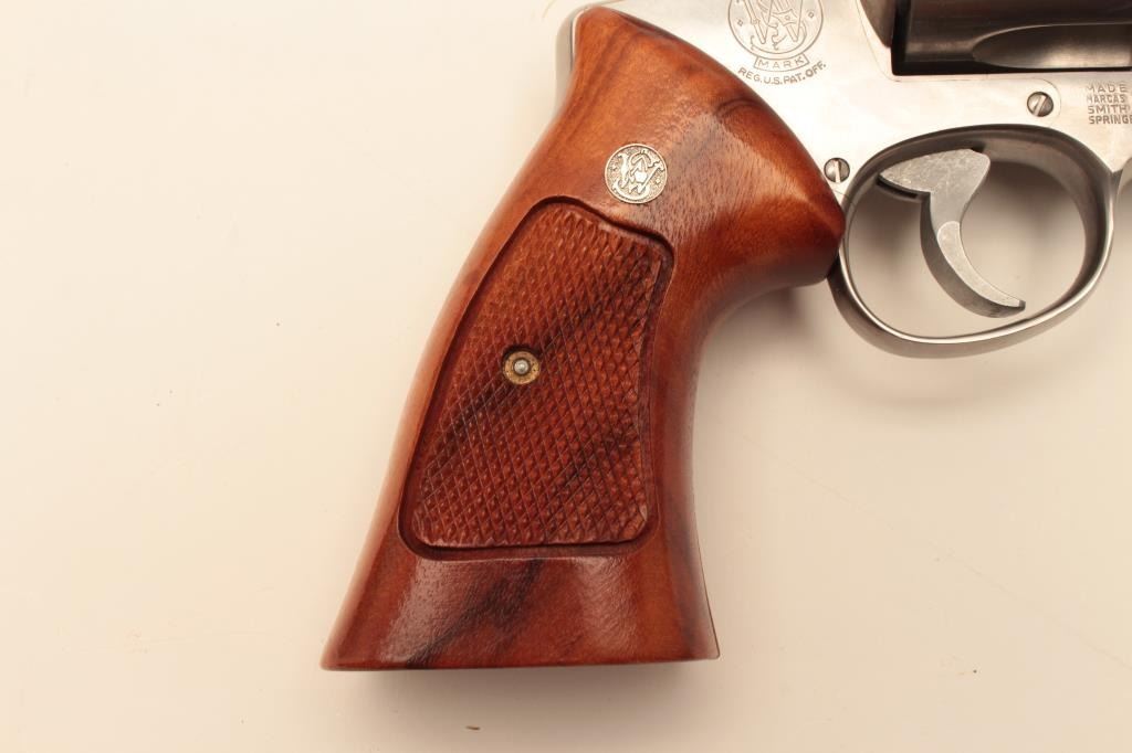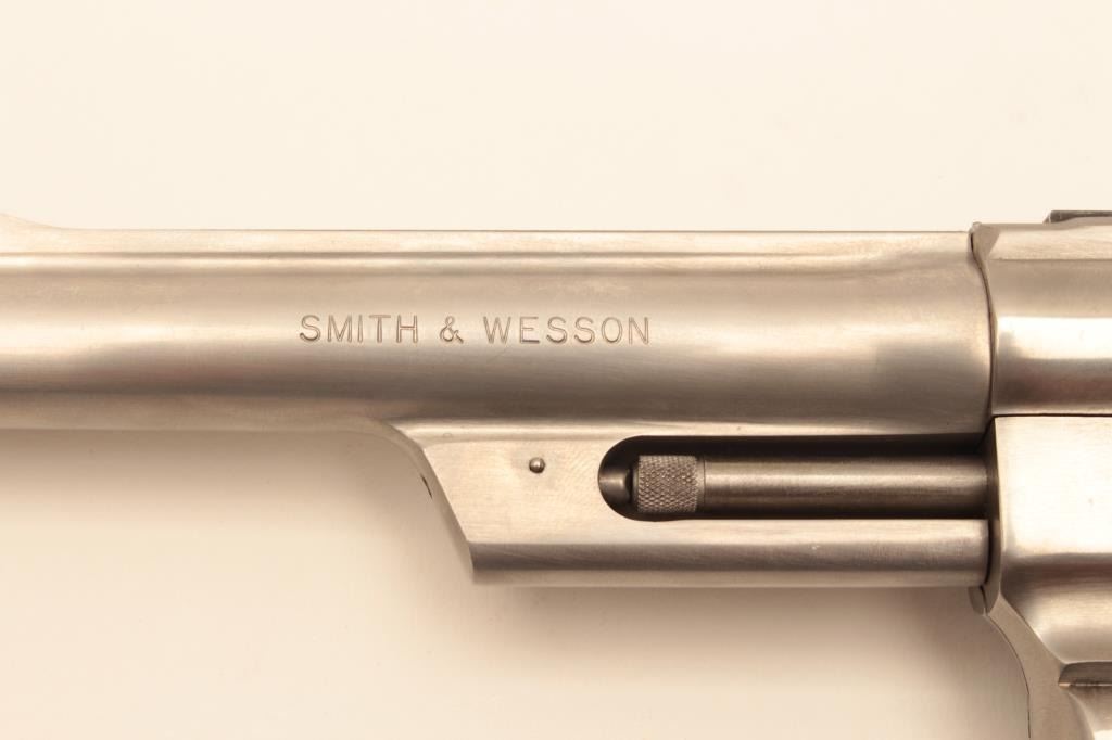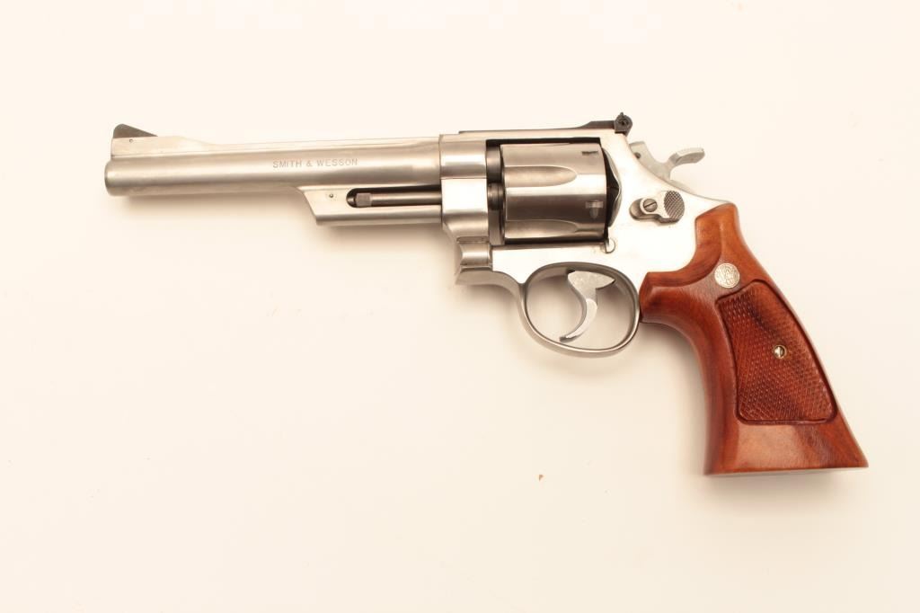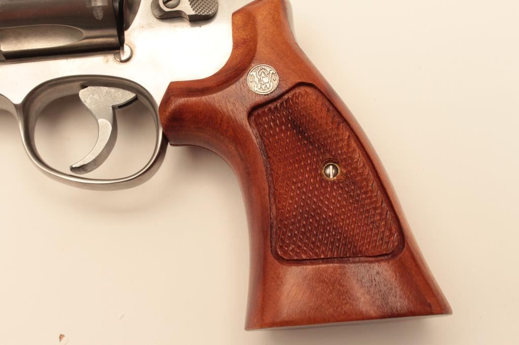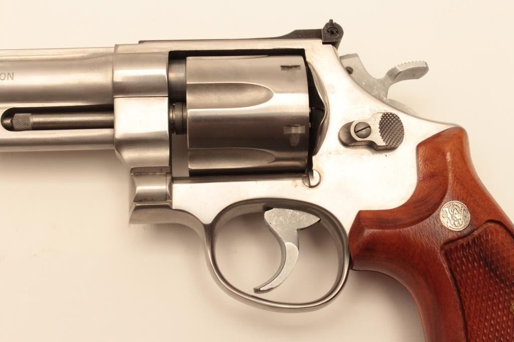 Smith & Wesson Model 624 Double Action revolver in .44 S&W caliber with a 6 ½” barrel, stainless steel, and target features, S/N AH00020. Fine to excellent used condition in box. 97%-99% with some firing Lot Title apparent. (Modern/PPT) Est.: $500-$1000