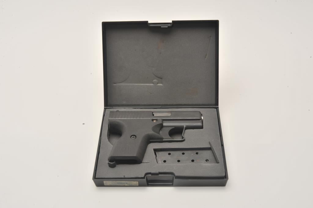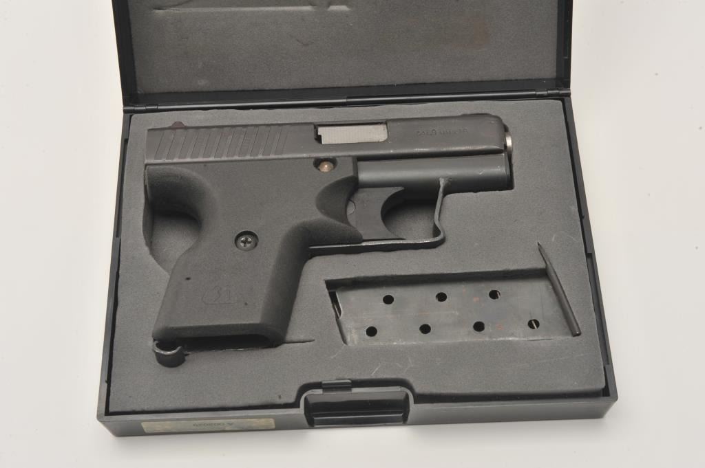 Sardius Industries Limited Model SD9 semi-automatic pistol, 9mm caliber, Serial #A002029. The pistol is in very good overall condition with a 3 ¼” barrel. The pistol retains nearly all of its black finish with Lot Title wear at the muzzle and high point edge wear. The black synthetic grips are in good condition with light handling marks. The top of the slide in import marked. The bore is good, the action functions and the markings Lot Title are sharp. A rarely encountered pistol manufactured in Israel. The lot includes the factory plastic box and one correct magazine. Est.: $350-$700. (Modern).