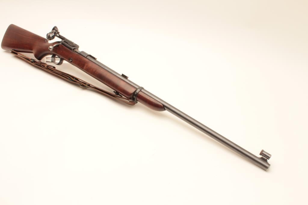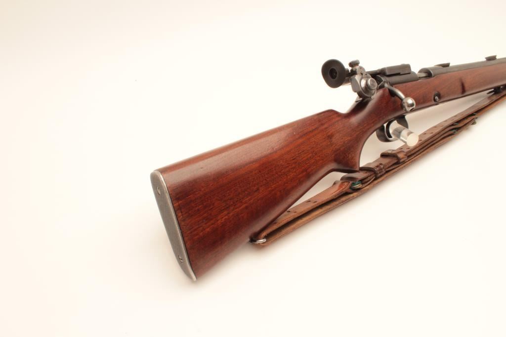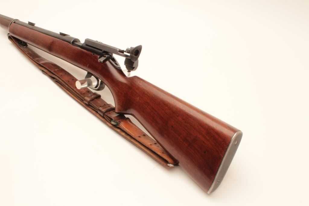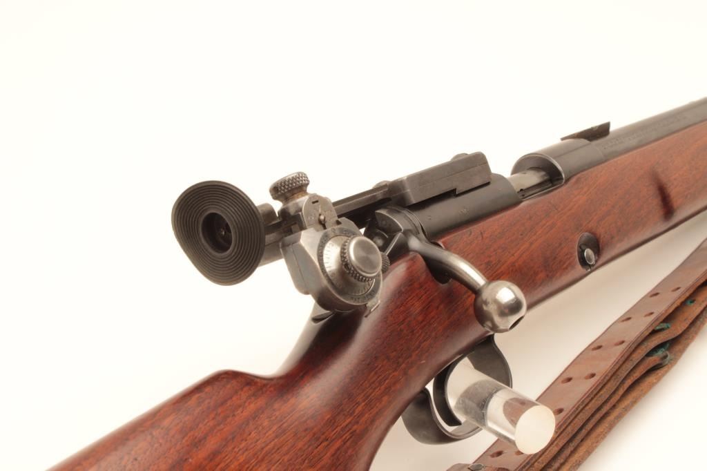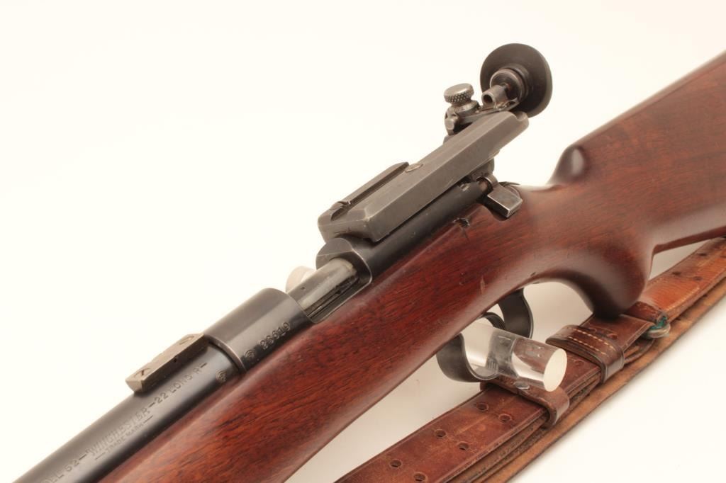 Winchester Model 52 bolt action target rifle, .22 Long Rifle, Serial #23619. The rifle is in very good overall condition with a 28” barrel. The metal surfaces retain the majority of their blue finish with light wear Lot Title at the muzzle and area of thinning blue on the barrel. The rifle comes with a globe style front sight, scope bases and an adjustable target aperture sight at the rear of the action. The smooth wood stock is in Lot Title good condition with small mars and handling marks. The butt stock retains the sling swivels, period leather military style sling and ends with a checkered steel butt plate. The bore is good, the action is crisp and Lot Title markings are sharp. Est.: $600-$1,200. (C+R).