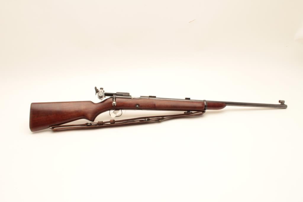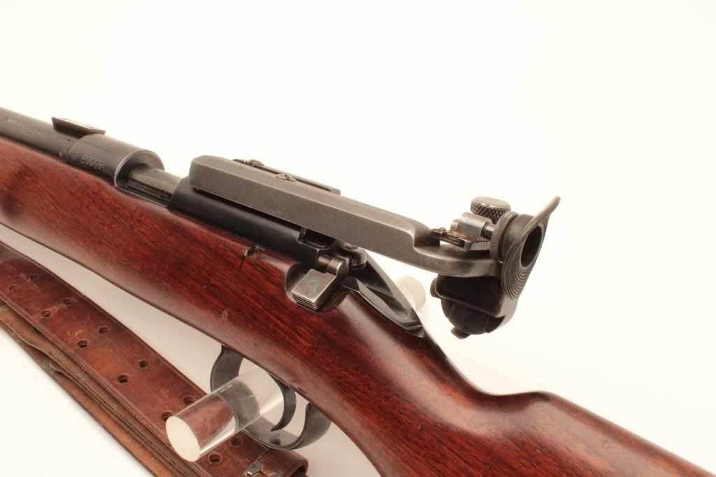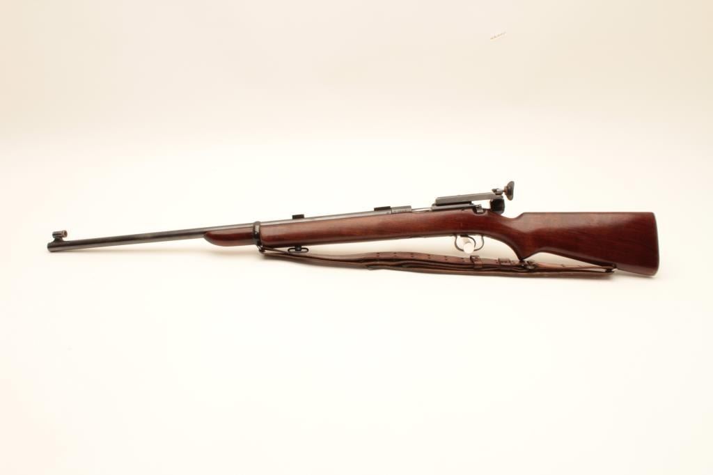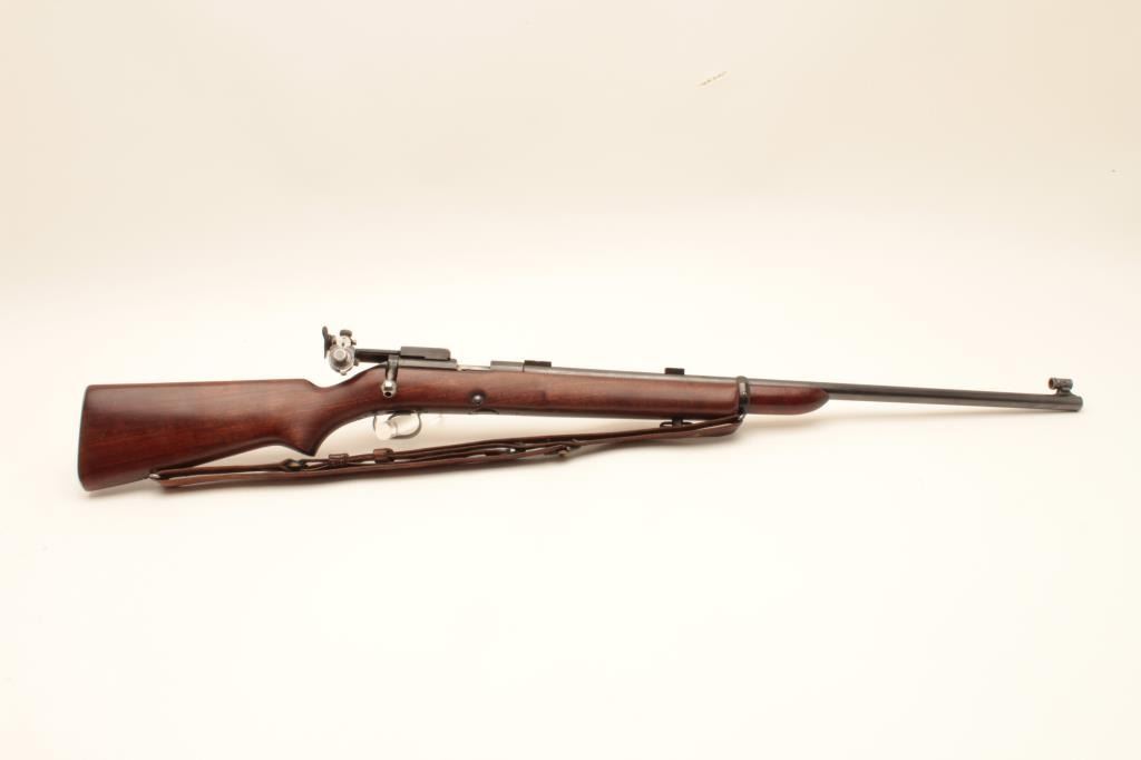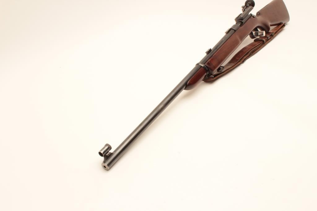 Winchester Model 52 bolt action target rifle, .22 Long Rifle, Serial #23619. The rifle is in very good overall condition with a 28” barrel. The metal surfaces retain the majority of their blue finish with light wear Lot Title at the muzzle and area of thinning blue on the barrel. The rifle comes with a globe style front sight, scope bases and an adjustable target aperture sight at the rear of the action. The smooth wood stock is in Lot Title good condition with small mars and handling marks. The butt stock retains the sling swivels, period leather military style sling and ends with a checkered steel butt plate. The bore is good, the action is crisp and Lot Title markings are sharp. Est.: $600-$1,200. (C+R).