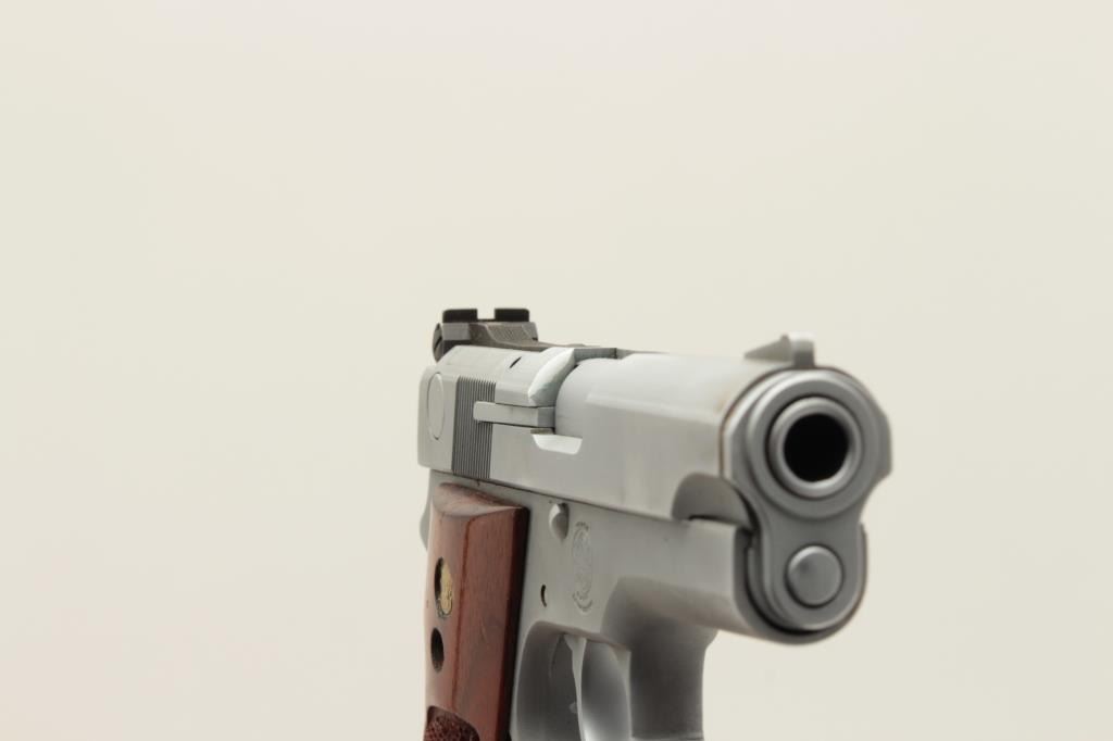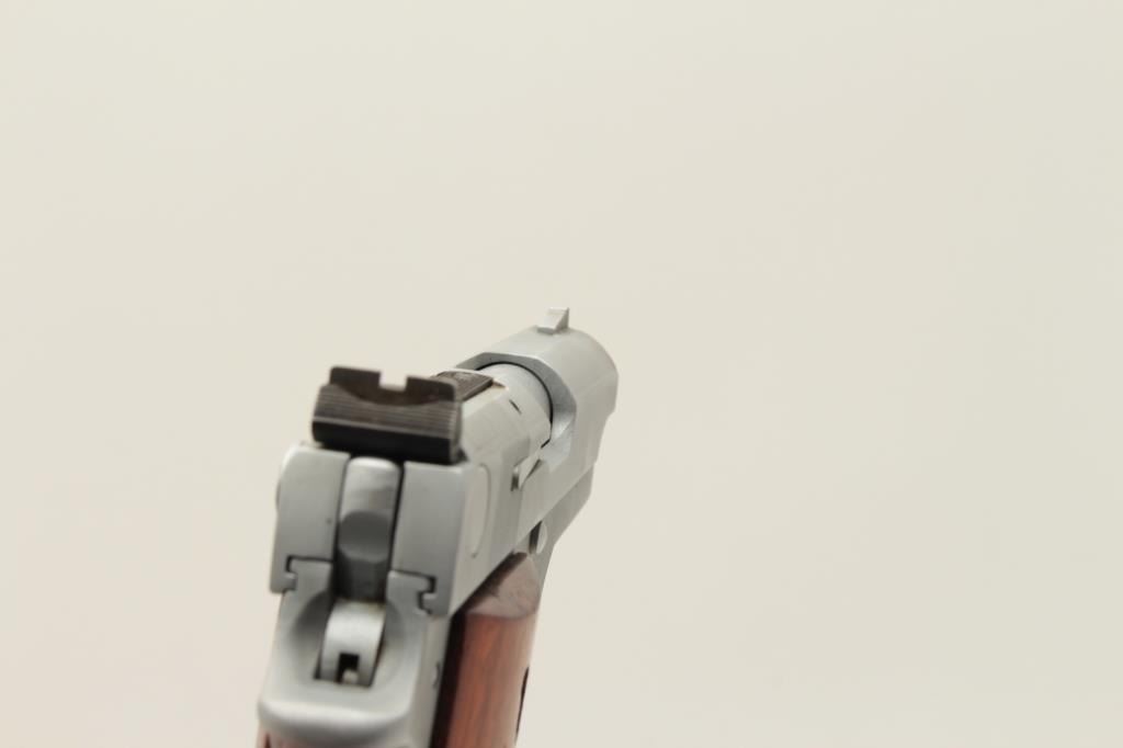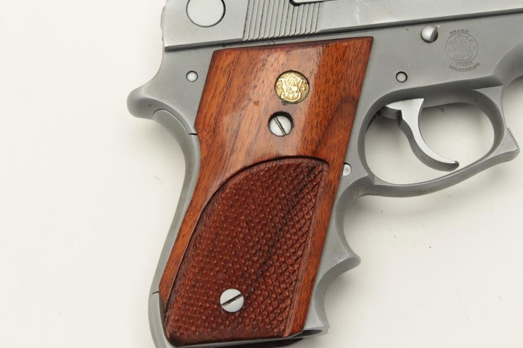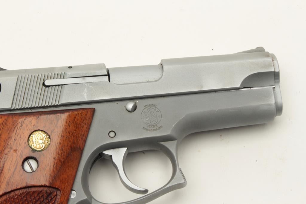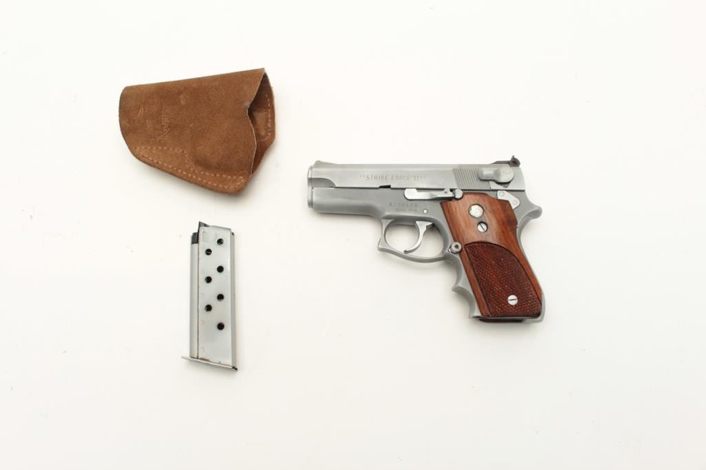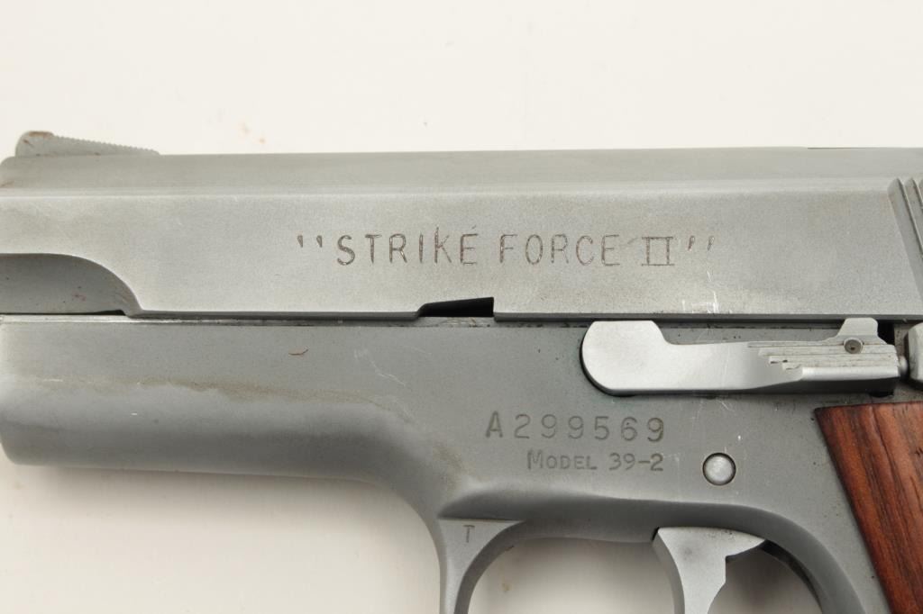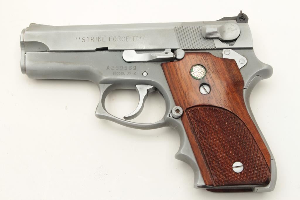 Smith & Wesson Model 39-2 Strike Force II semi-automatic pistol, 9mm caliber, Serial #A299569. The pistol is in very good overall condition with a 3 ¼” barrel with a ramp front and adjustable rear sights. The pistol Lot Title retains the majority of its matte stainless finish with holster wear at the muzzle. The checkered wood medallion grips are in good condition showing mars and compressions from carry and use. The bore is good, the action Lot Title crisp and markings are sharp. The lot includes one correct magazine and a Bianchi open-top suede holster. Est.: $350-$700. (Modern).