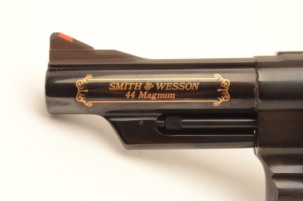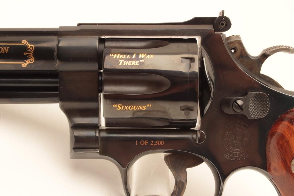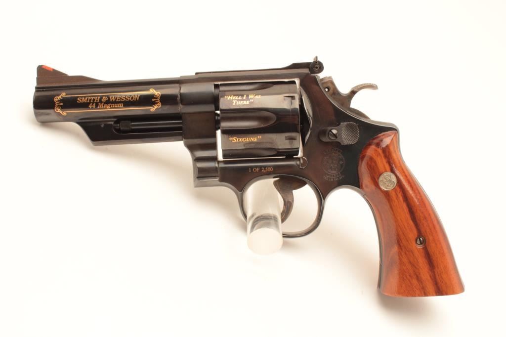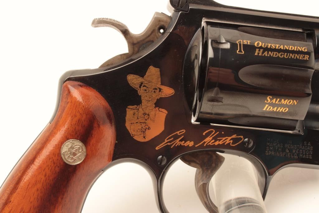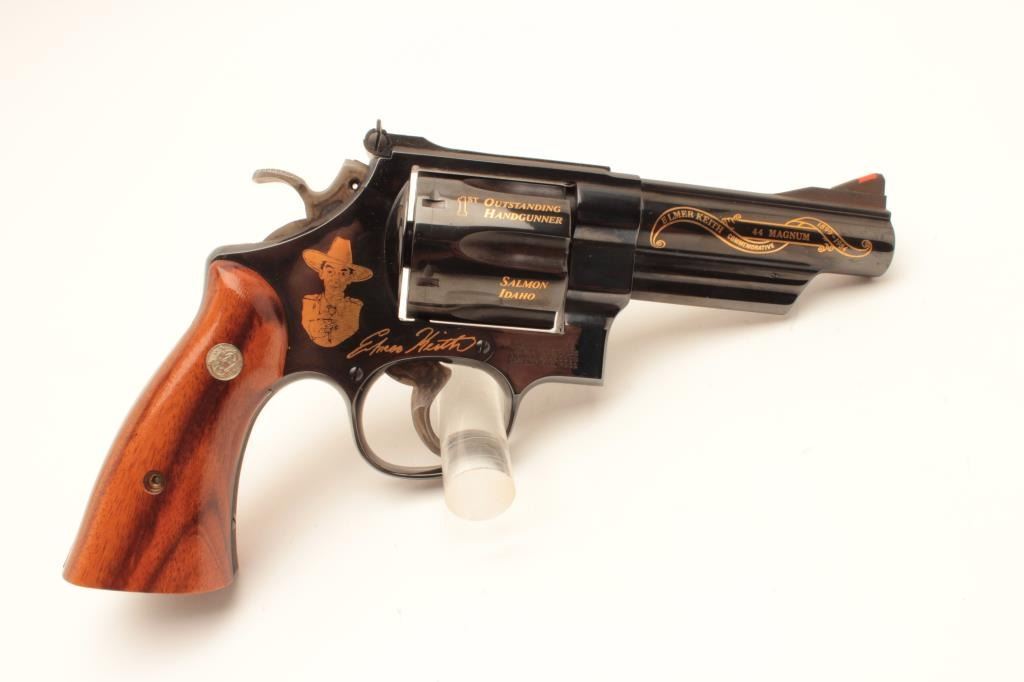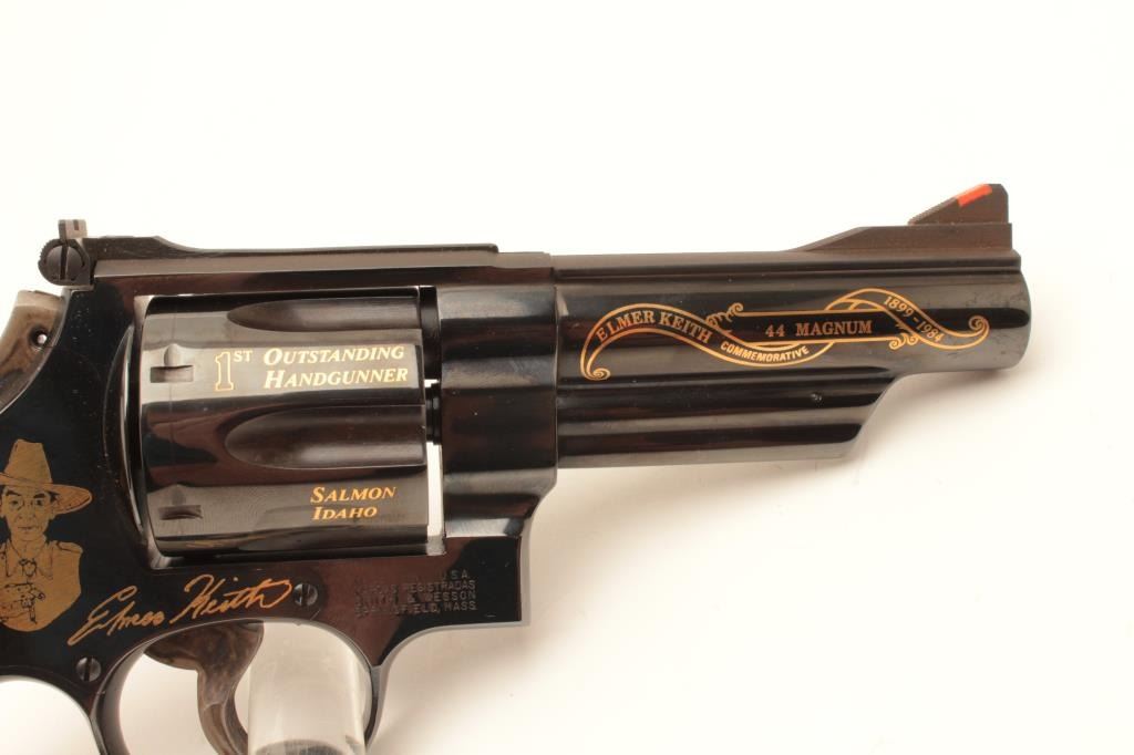 Smith & Wesson Model 29-3 Elmer Keith Commemorative double action revolver, .44 Magnum caliber, Serial #EMK1192. The pistol is as new in the box with a 4” barrel with an Orange ramp front and adjustable rear Lot Title sights. Commemorating his life and limited in production to 2,500 units, the pistol bears the image of Elmer Keith and his signature on the frame along with other inscriptions in gold script. The hammer and Lot Title trigger retain significant vivid case hardening. The smooth wood medallion grips are in excellent condition with beautiful figure and graining. The pistol is in the original blue factory cardboard box and Lot Title appears to be unfired. Est.: $700-$1,400. (Modern).
