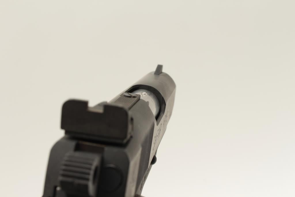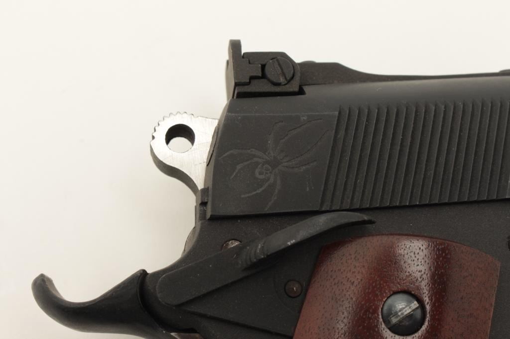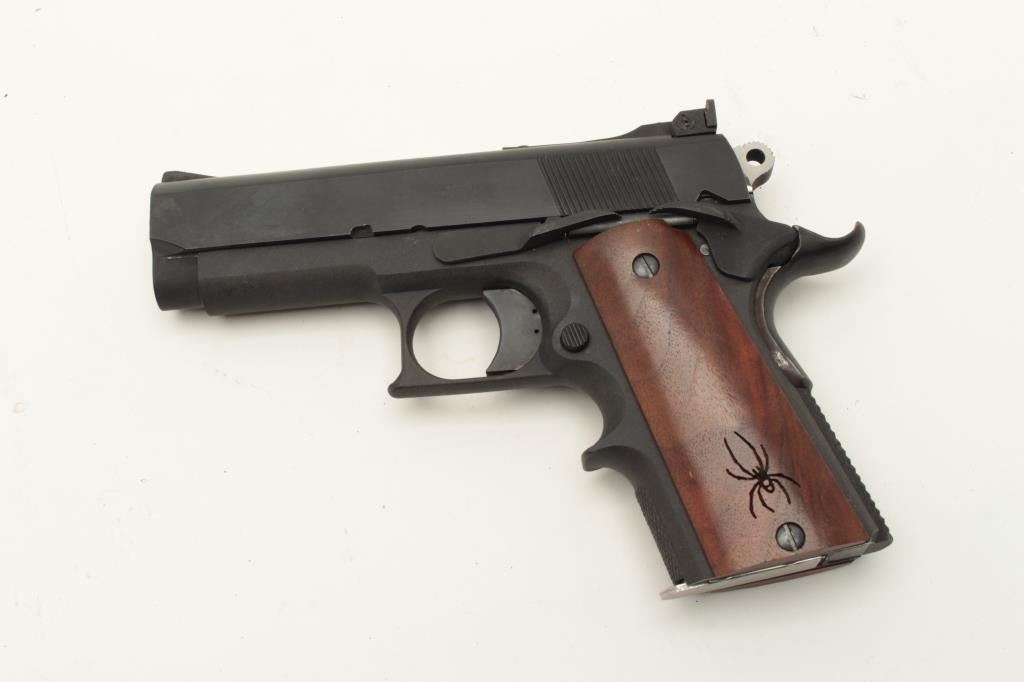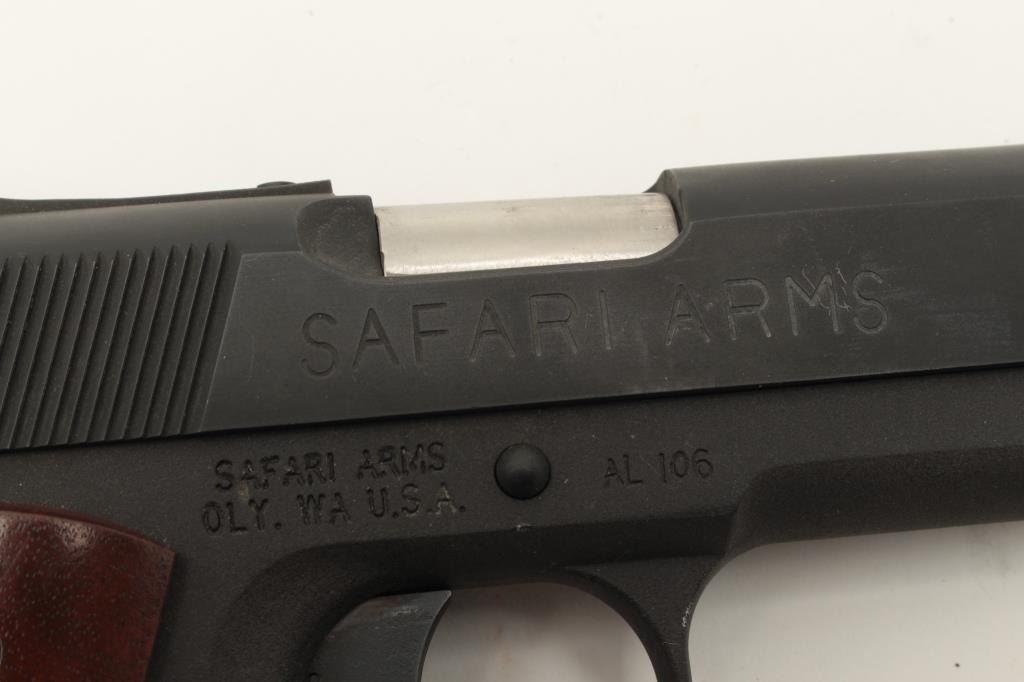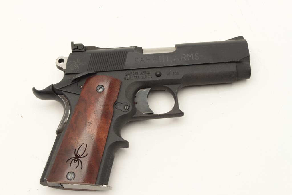 Safari Arms Commander style semi-automatic pistol, .45 ACP caliber, Serial #AL105. The pistol is in very good overall condition with a 4” barrel with a ramp front and adjustable rear sights. The metal parts retain the Lot Title majority of their matte blue finish with handling marks. The smooth wood grips are in good condition with small mars from carry and use featuring a spider on each panel. The bore is good, the action crisp and Lot Title markings are sharp. The lot includes one correct, stainless magazine. Est.: $500-$1,000. (Modern).