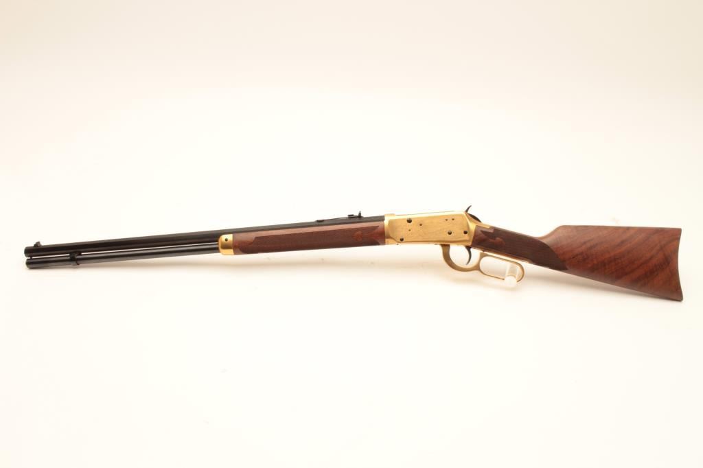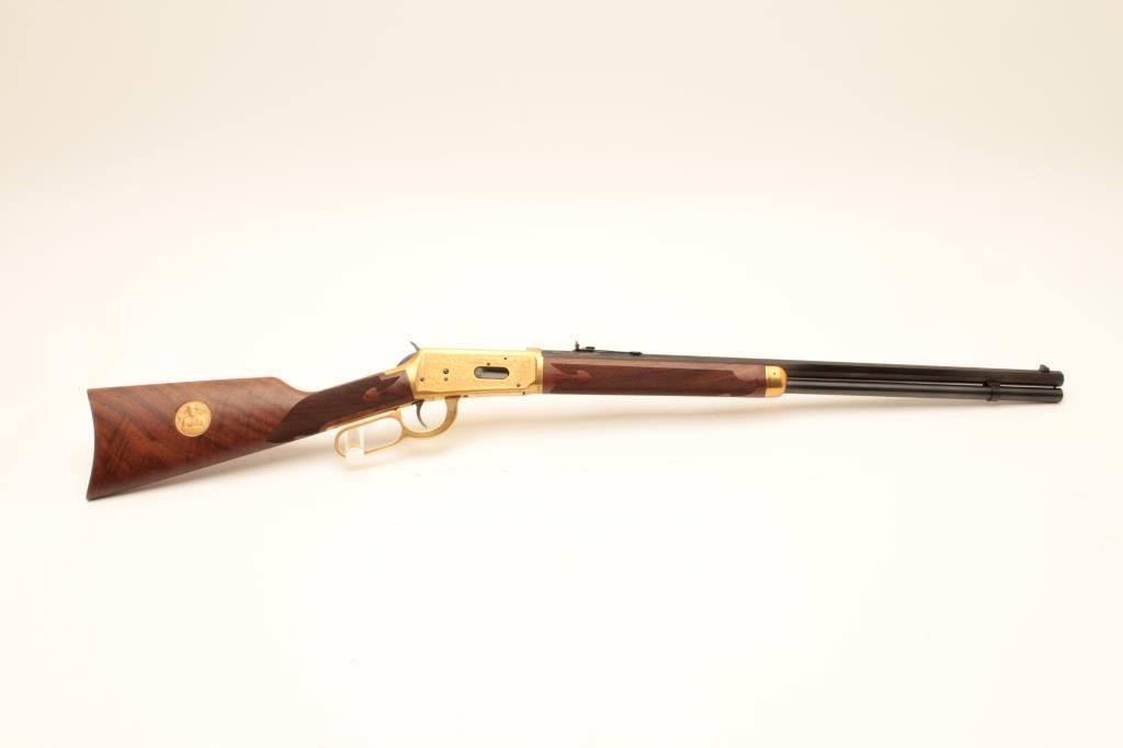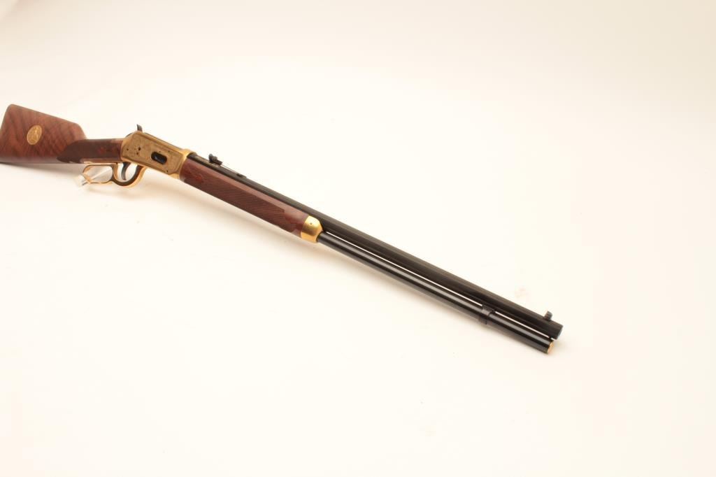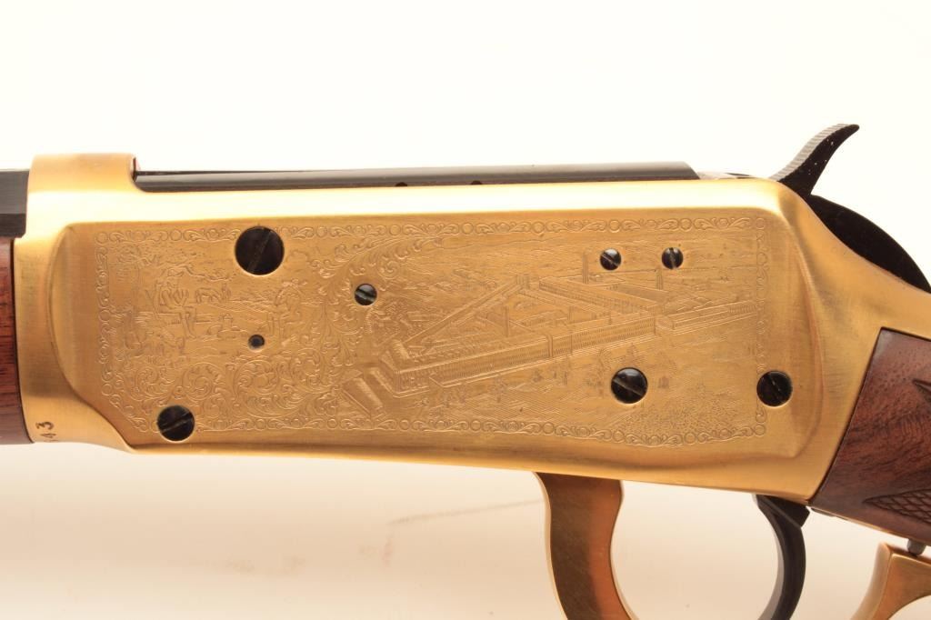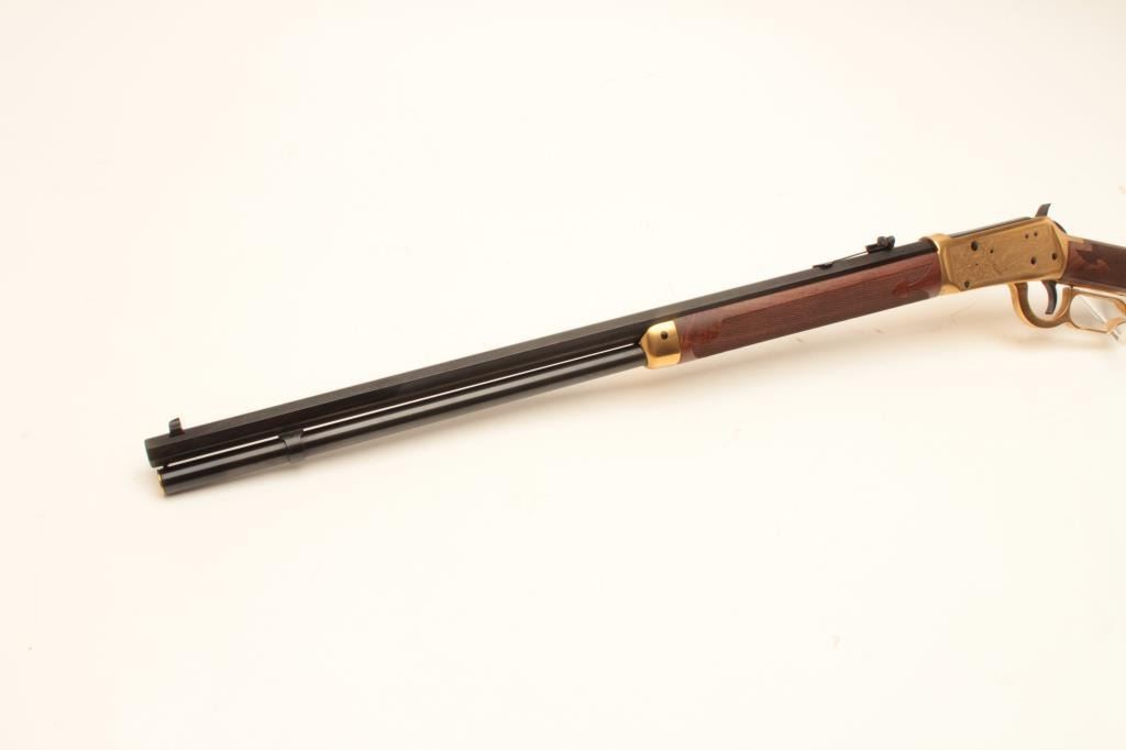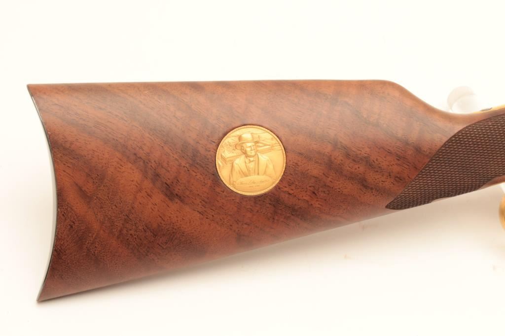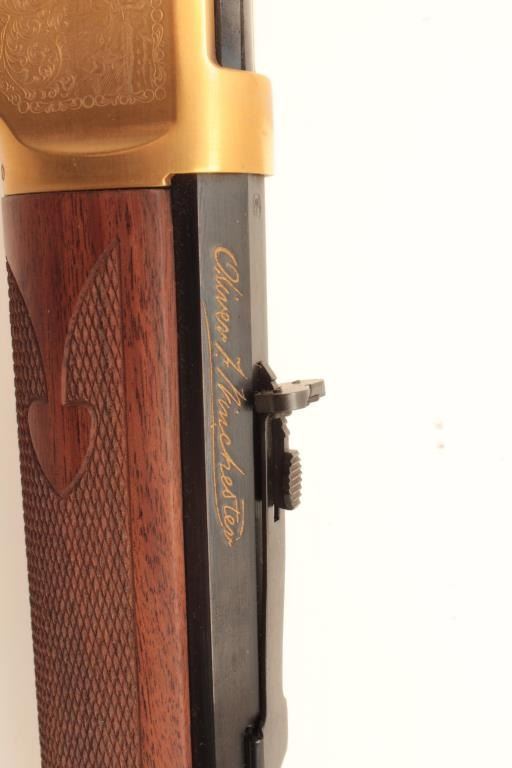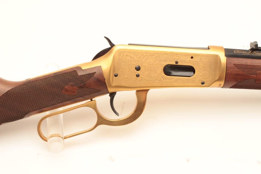 Oliver F. Winchester Commemorative Model 1894 lever action rifle, .38-55 WCF caliber, Serial #OFW17643. The rifle is new in the factory box with all associated paperwork and packaging material. The rifle features a Lot Title 24” octagon barrel with a full-length magazine. The receiver is gold tone with engraving depicting the Winchester factory. The finely checkered wood stocks are in excellent condition with a smooth steel Lot Title crescent butt and a gold tone Oliver Winchester medallion inlayed in the butt stock. This Winchester is long out of production and appears unfired. Est.: $400-$800. (Modern).