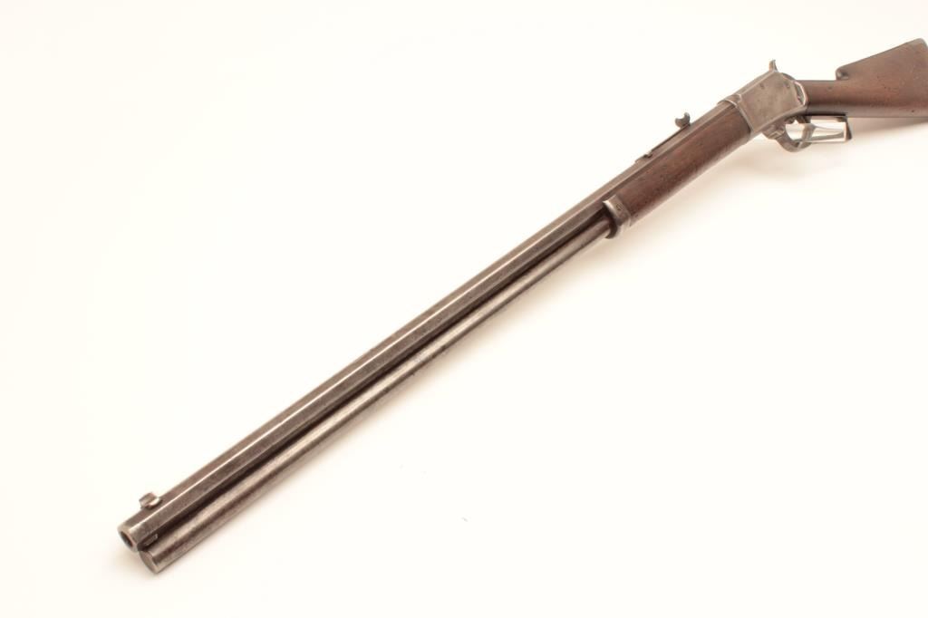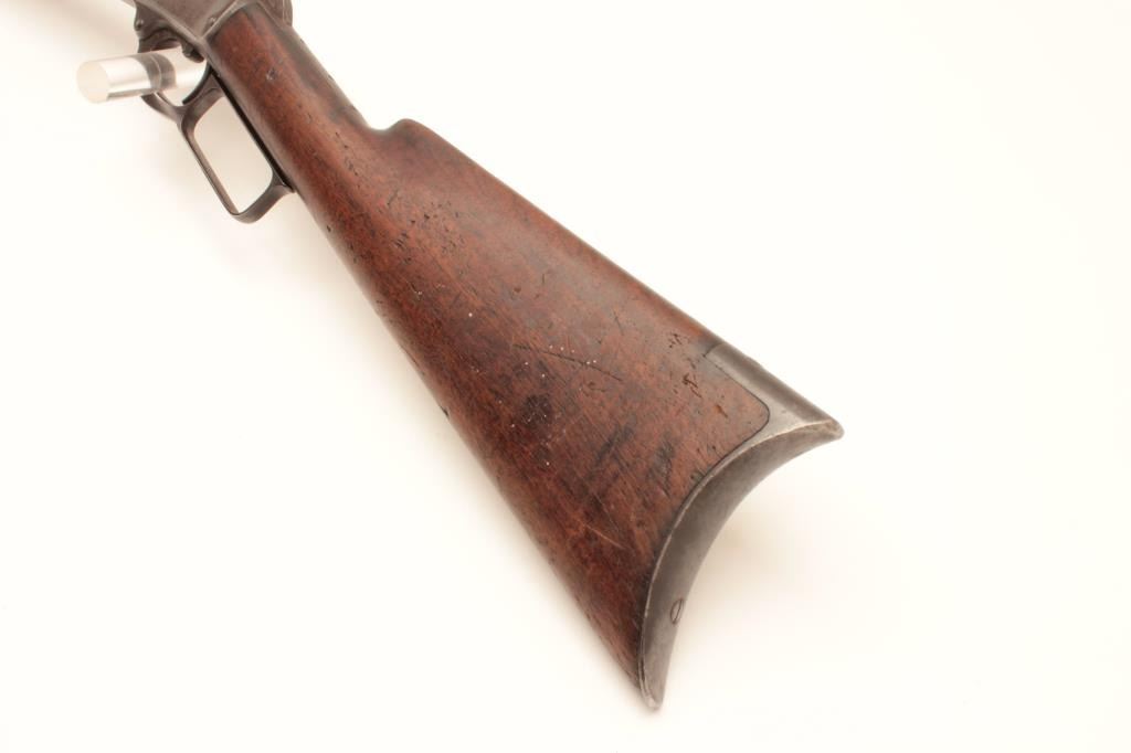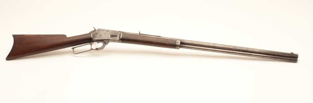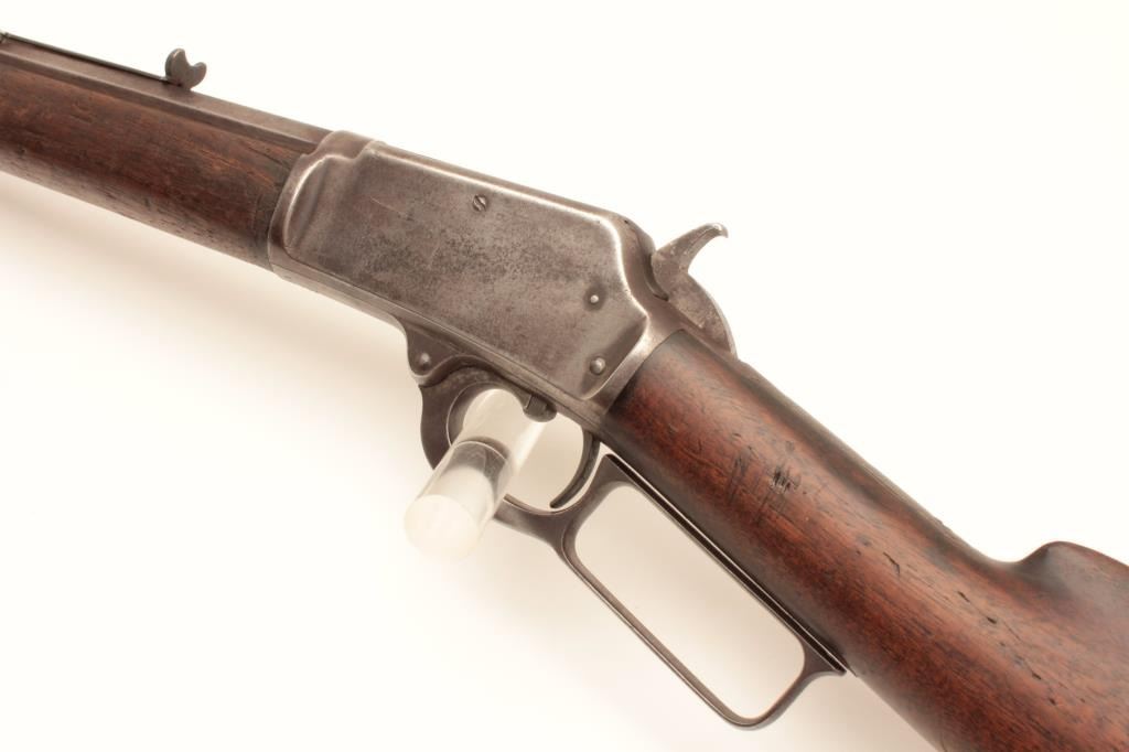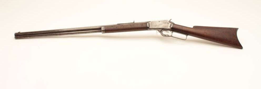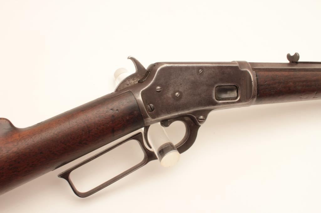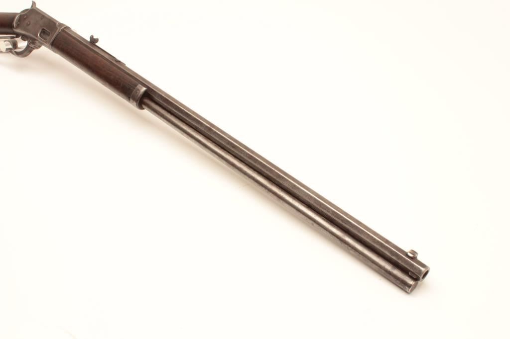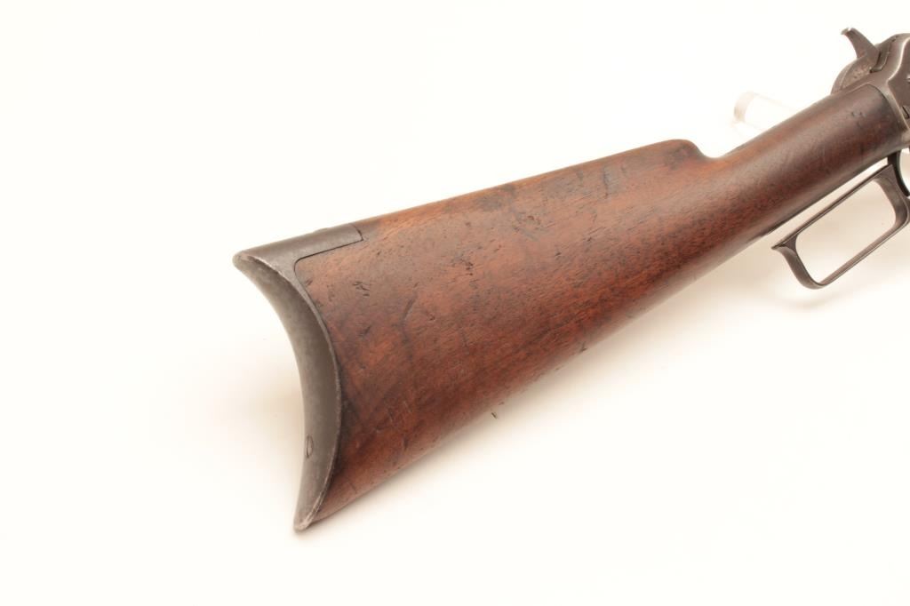 Marlin Model 1888 lever action rifle, .38 WCF caliber, Serial #24801. The rifle is in good overall condition with a 28” octagon barrel. The extra-long 28” barrel and full-length magazine have gone to silver/grey Lot Title patina with numerous small mars and scratches. The rear sight is missing the elevator and there are two screws missing at the tang. The receiver is likewise a silver/grey patina with some areas of light Lot Title surface erosion noted. The smooth wood stocks show moderate wear with numerous mars and compressions. The butt ends with a smooth, steel crescent butt plate. The bore is fair, the action is crisp and the markings Lot Title are legible on this desirable Marlin rarely seen with the longer barrel. Est.: $1,000-$2,000. (Antique).