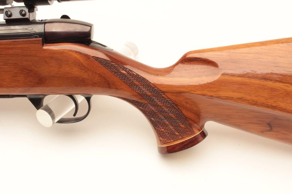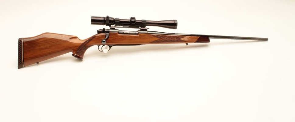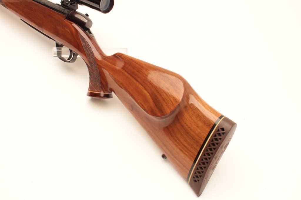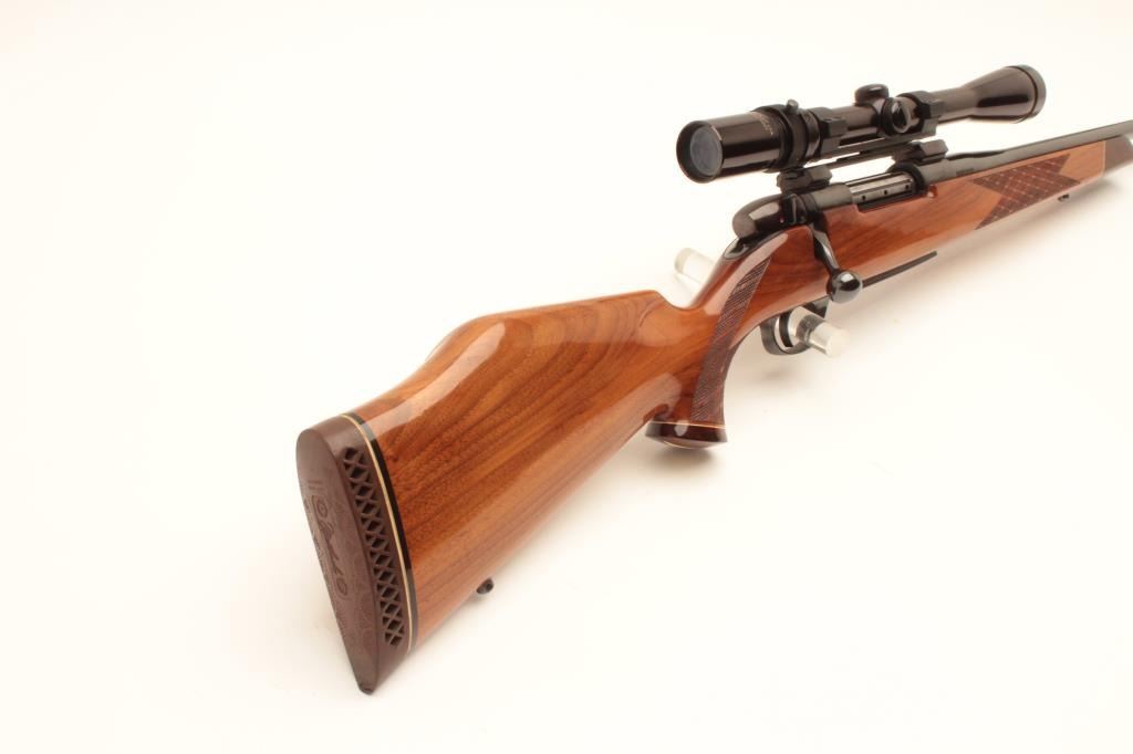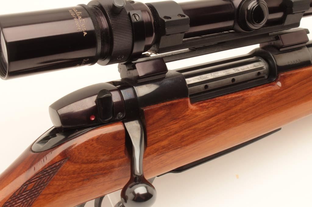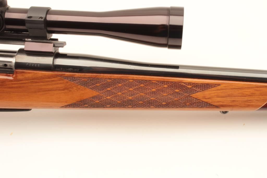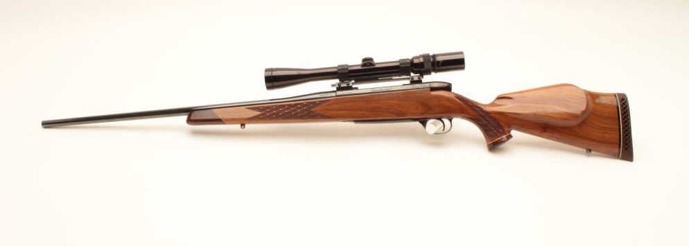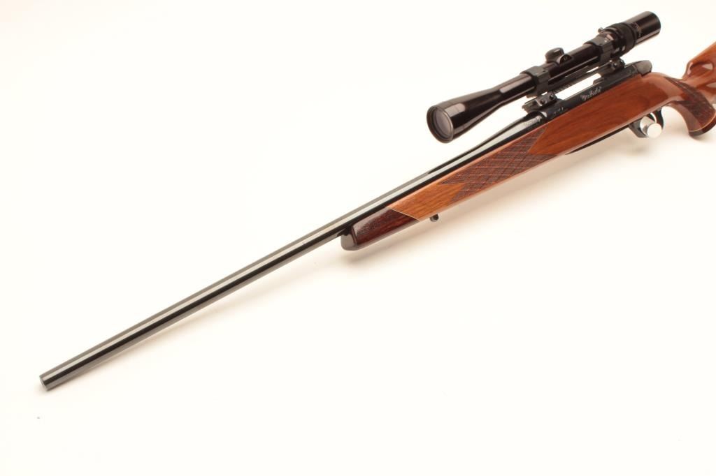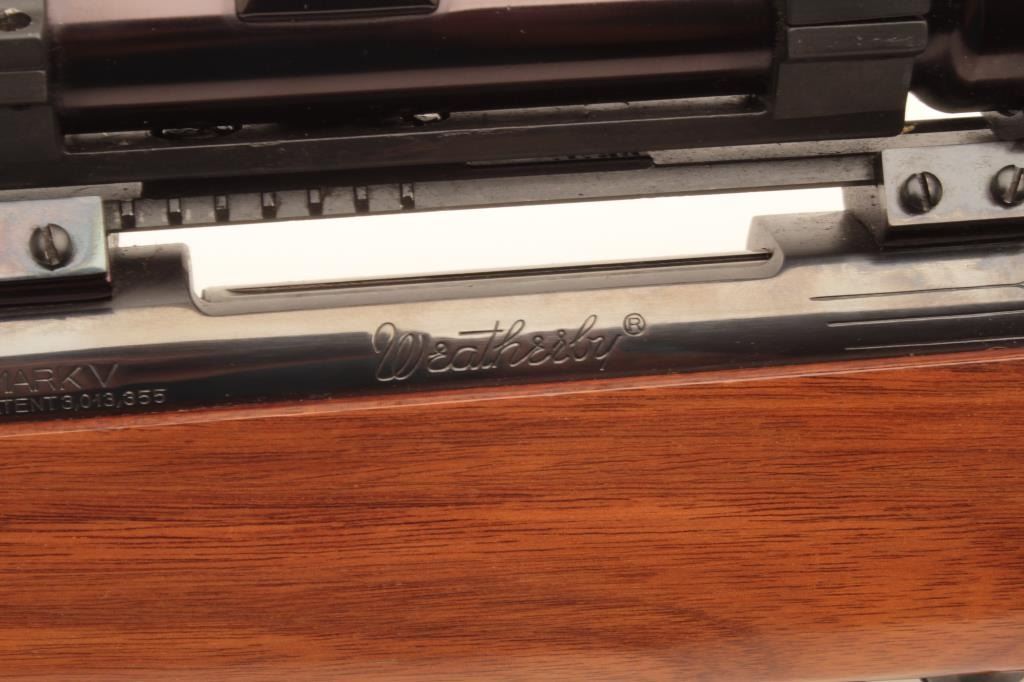 Weatherby Mark V bolt action rifle, .300 Magnum caliber, blued finish, checkered wood stock with hard rubber butt pad, S/N P6555, mounted with a Realistic 6X scope displaying crisp optics; gun is overall very good + used Lot Title with very good + bore, crisp action and markings, very good wood stock. (Modern). Est.: $800-$1,600.