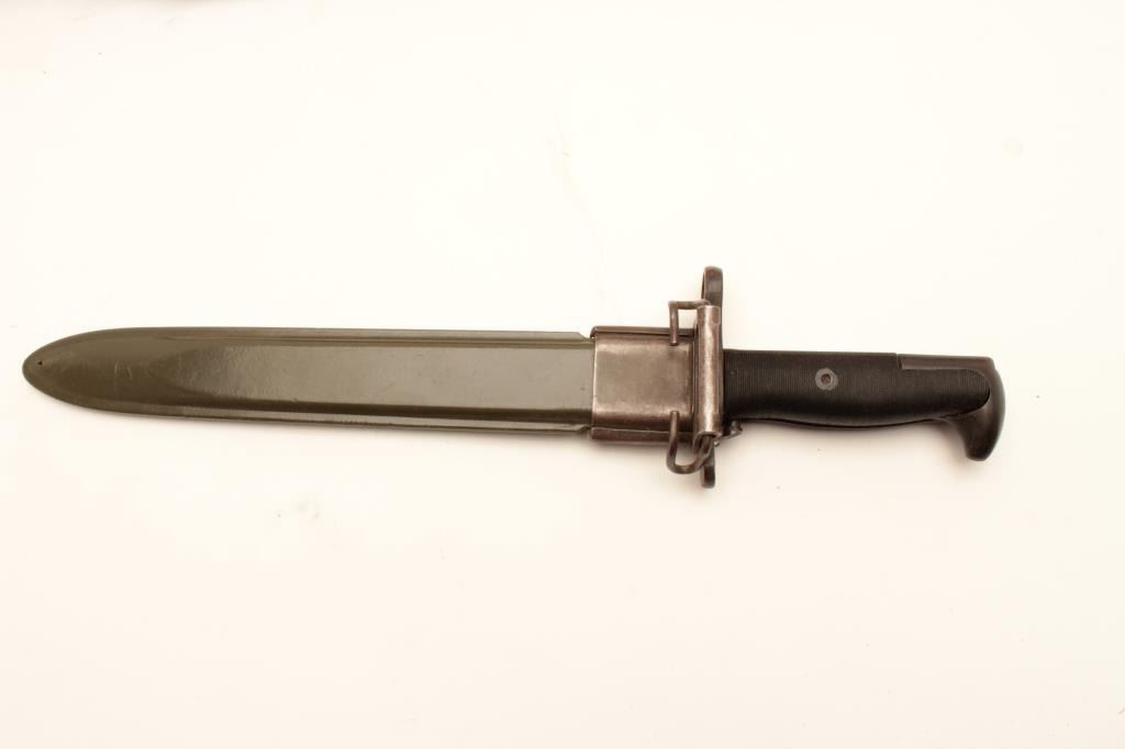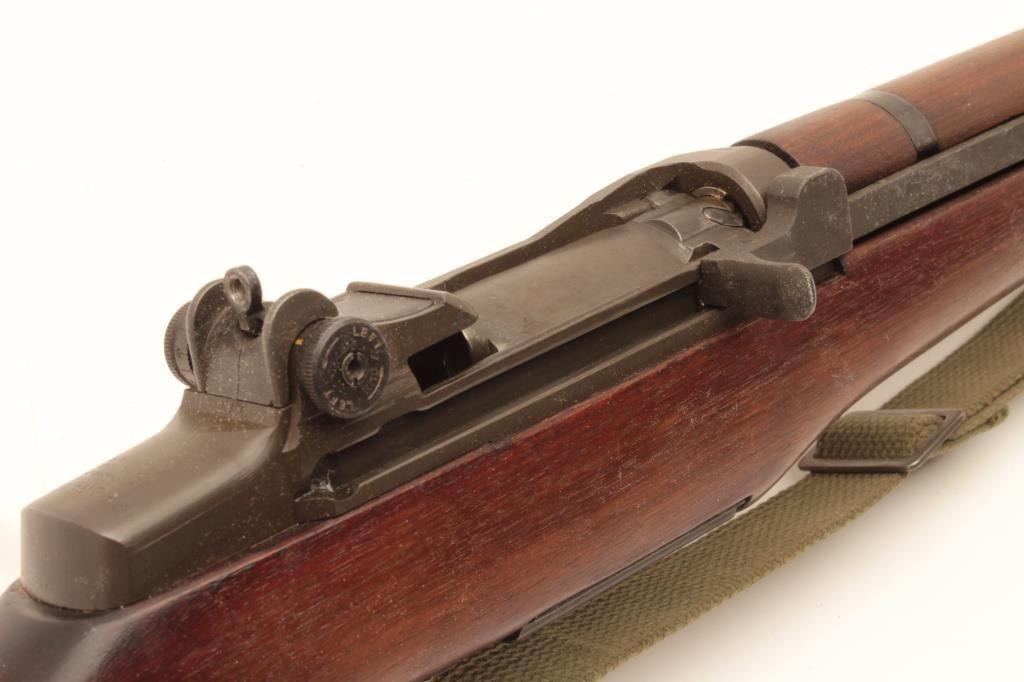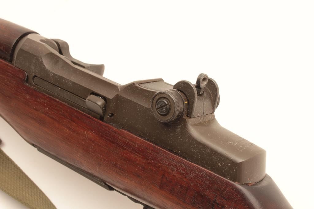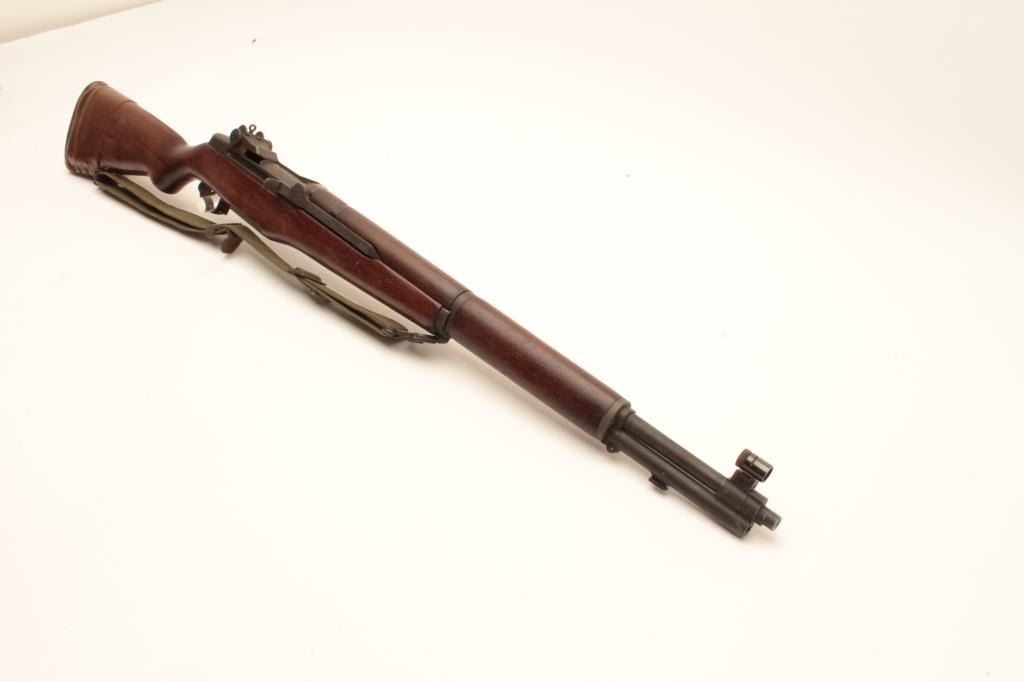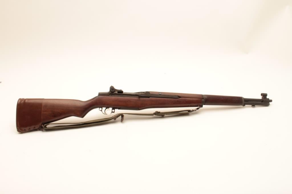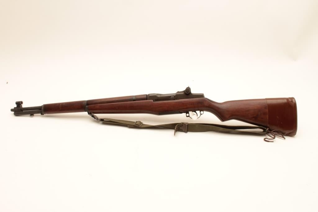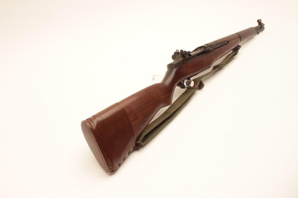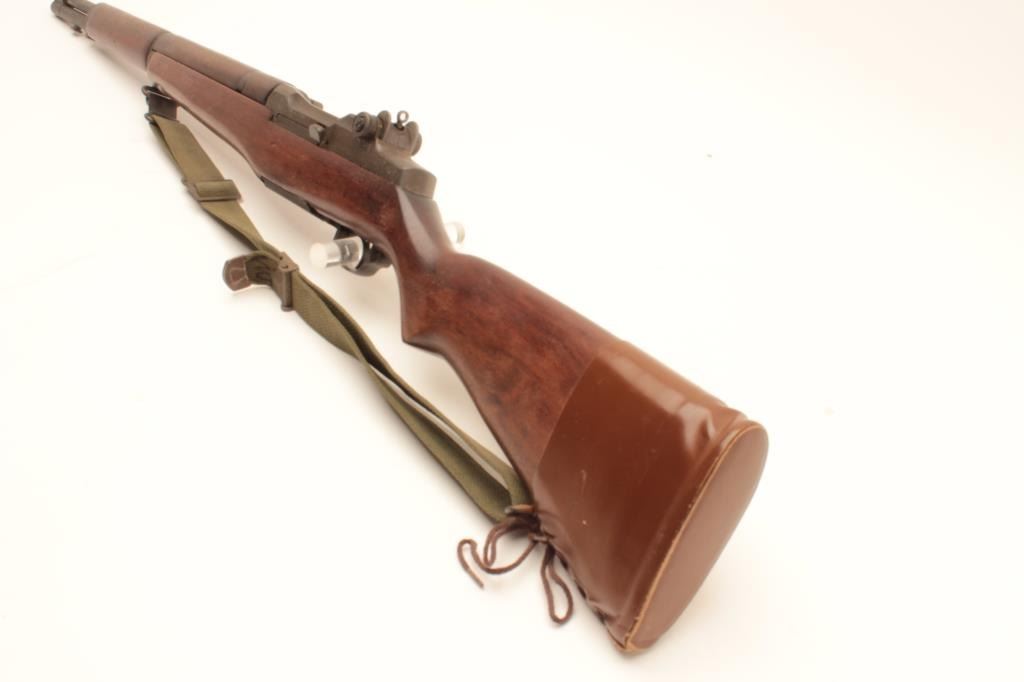 Winchester US M1 Garand semi-automatic rifle, .30 caliber, Serial #2330768. The rifle is in fine to excellent overall condition as arsenal rebuilt. The 24” SA barrel is dated 11-65 with the front sight replaced by a Lot Title modern target style. The rifle retains nearly all of its military finish with only light handling marks noted. The smooth wood stock bears Korean War era inspection marks and is fitted with a lace up leather butt Lot Title pad. The rifle has sling swivels, an OD green canvas sling and the original bayonet in scabbard. The rifle comes in the original DCM box with all associated packaging and paperwork. Est.: $800-$1,600. (C+R).