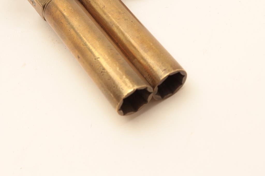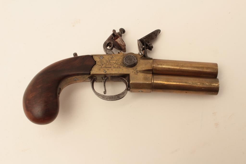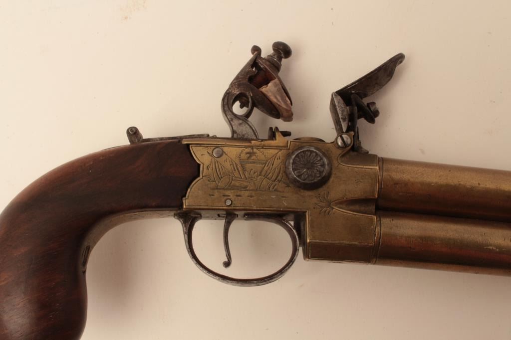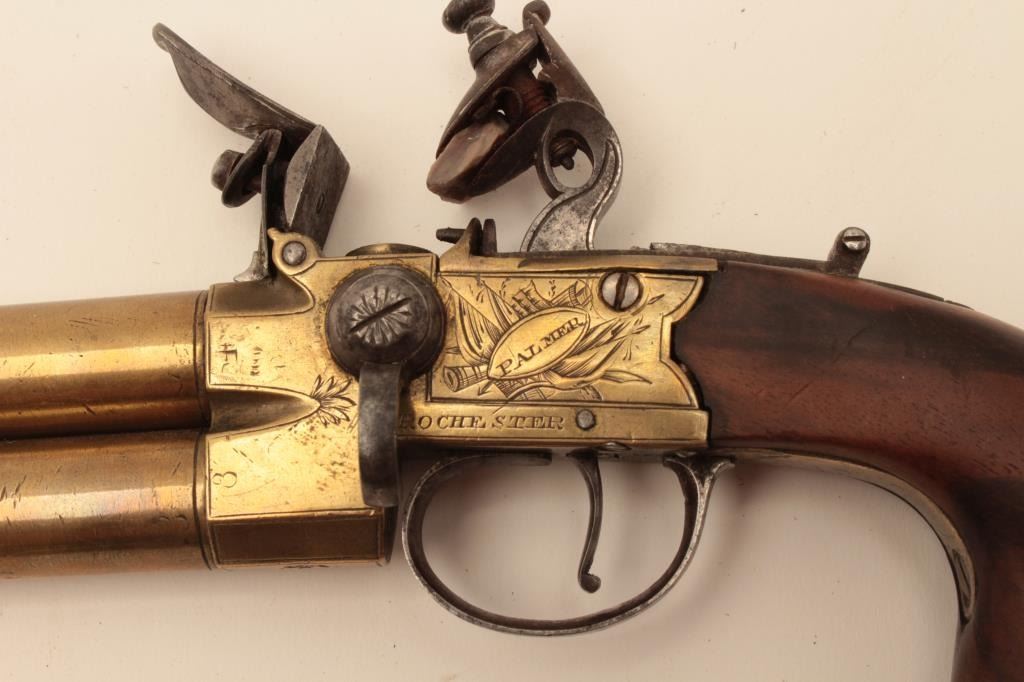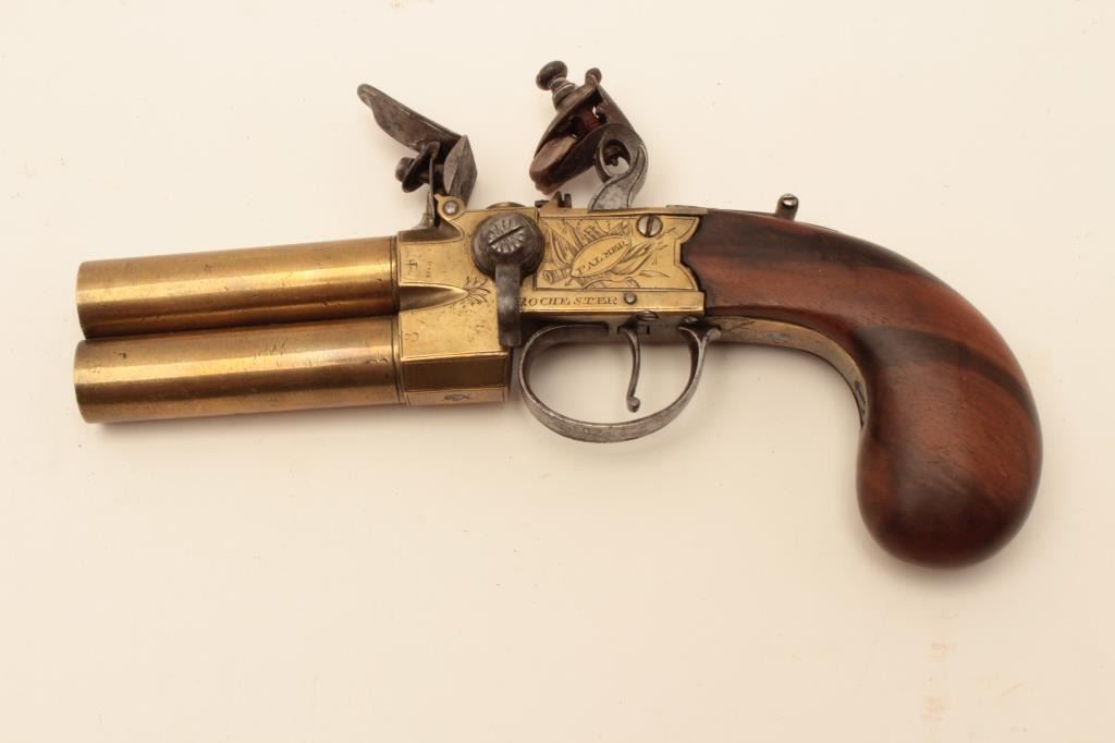 Over & Under tap action flintlock pistol signed “Palmer, Rochester”. British proofed. Brass barrels and frame. Smooth and un-checkered select hardwood grip. Measures 7 ½” overall with 3” barrels of approximately Lot Title .45 caliber false rifled. Works well and very good plus overall. Est.: $500-$1000