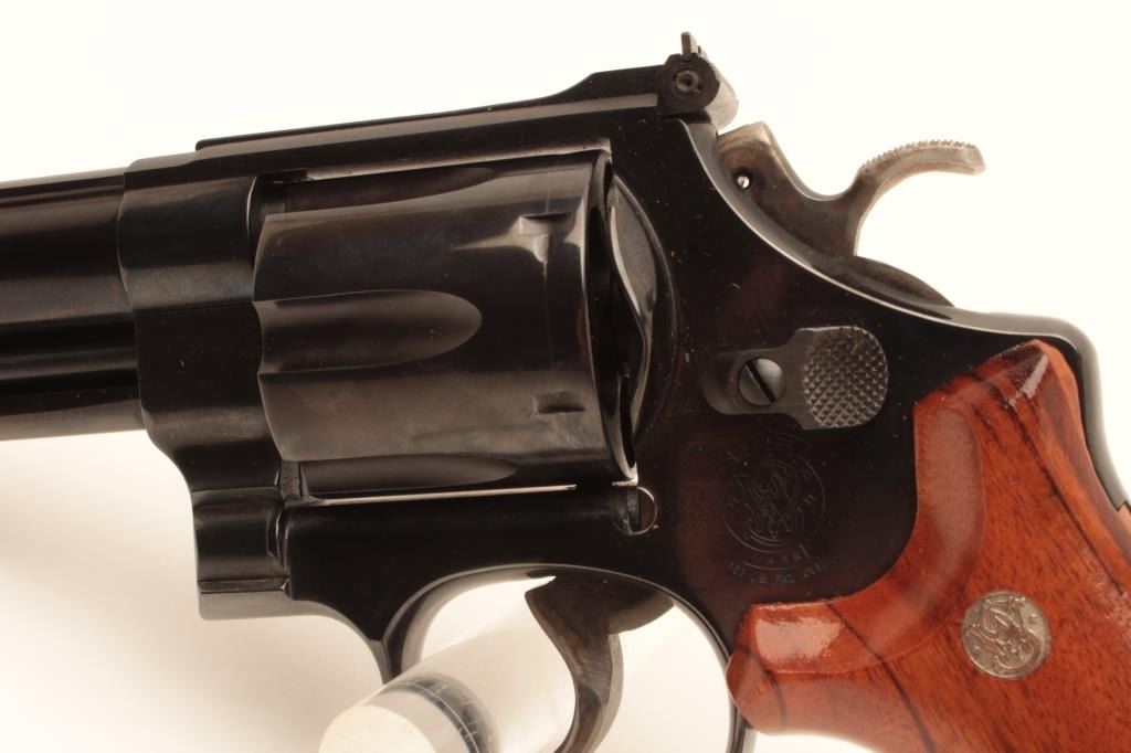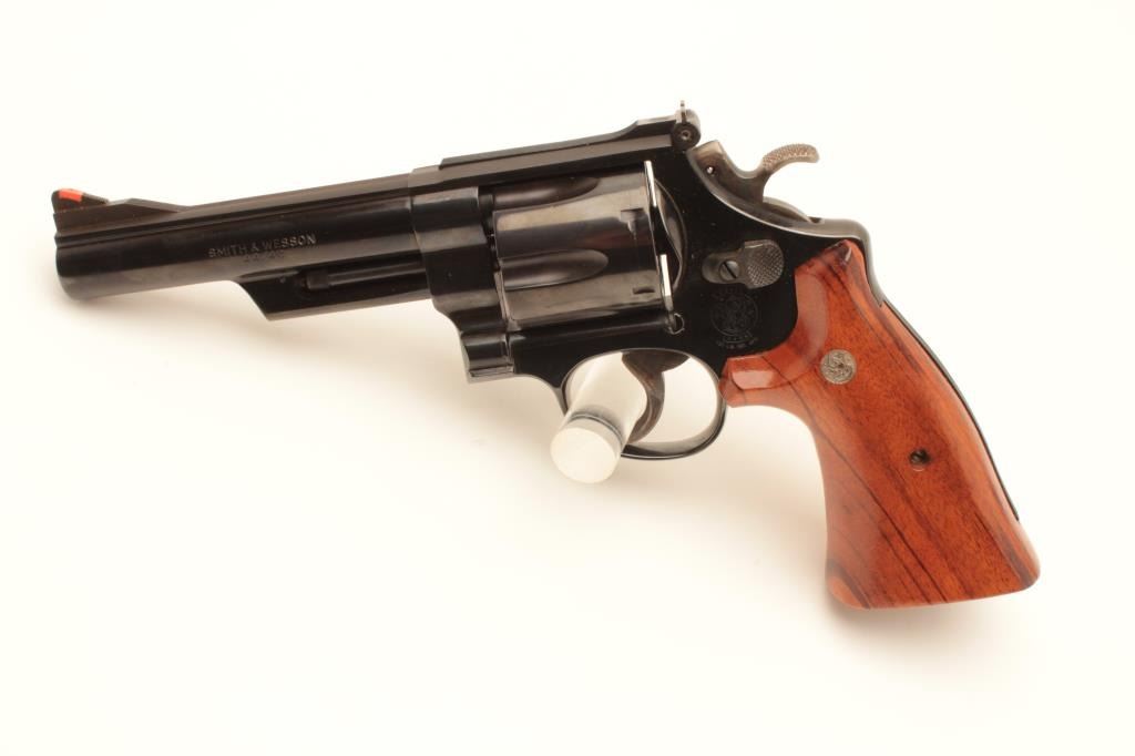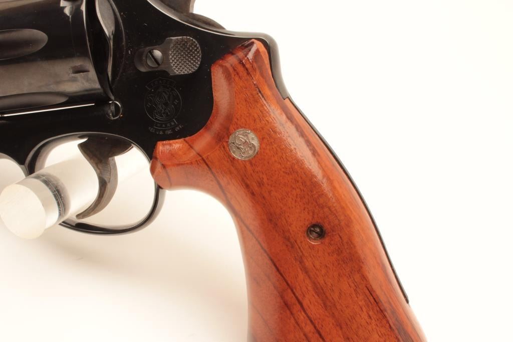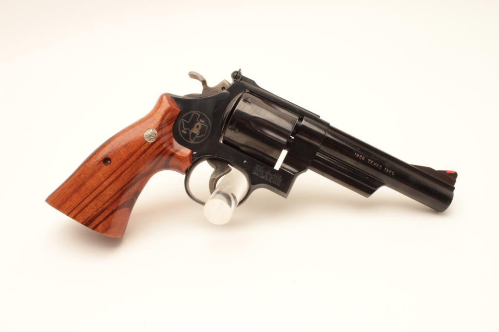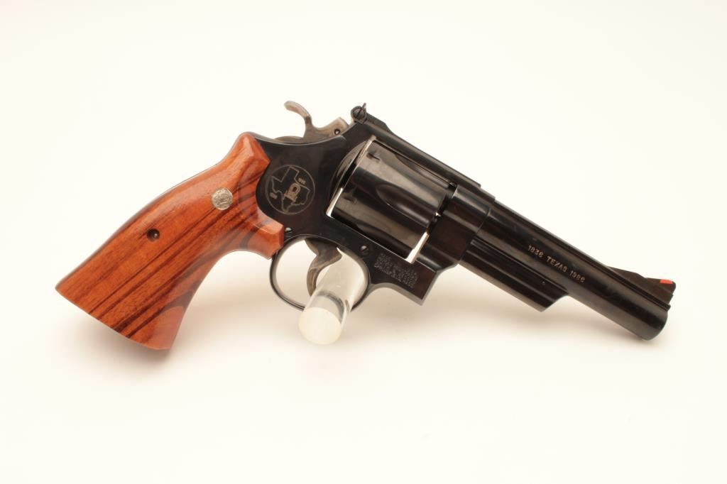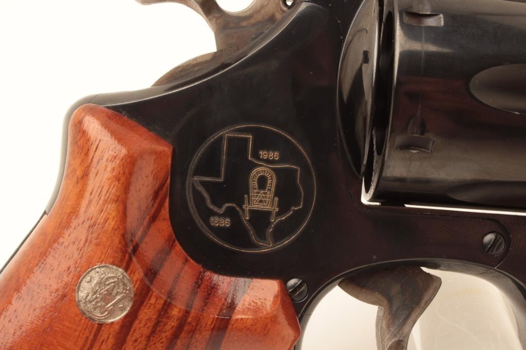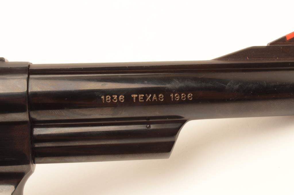 Smith & Wesson Texas Wagon Train Commemorative Model 544 double action revolver, .44/40 caliber, Serial #TWT2398. The pistol is as new in the box with a 5” barrel, blue and case hardened finish with Lot Title smooth Goncalo Commemorative target wood medallion grips. Created to honor the Sesquicentennial or 150th birthday of the state of Texas, the Texas Wagon Train Commemorative was limited in production to Lot Title 7800 pistols. This one is as new in the box with all associated packaging materials. Est.: $500-$1,000. (Modern).