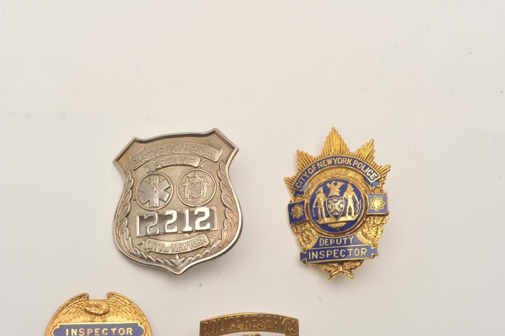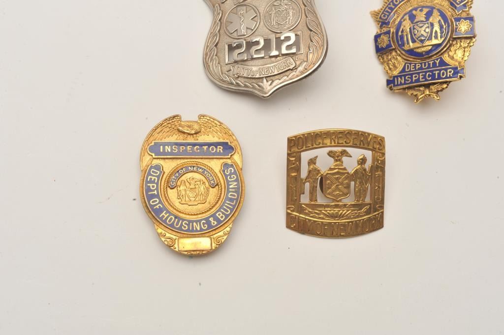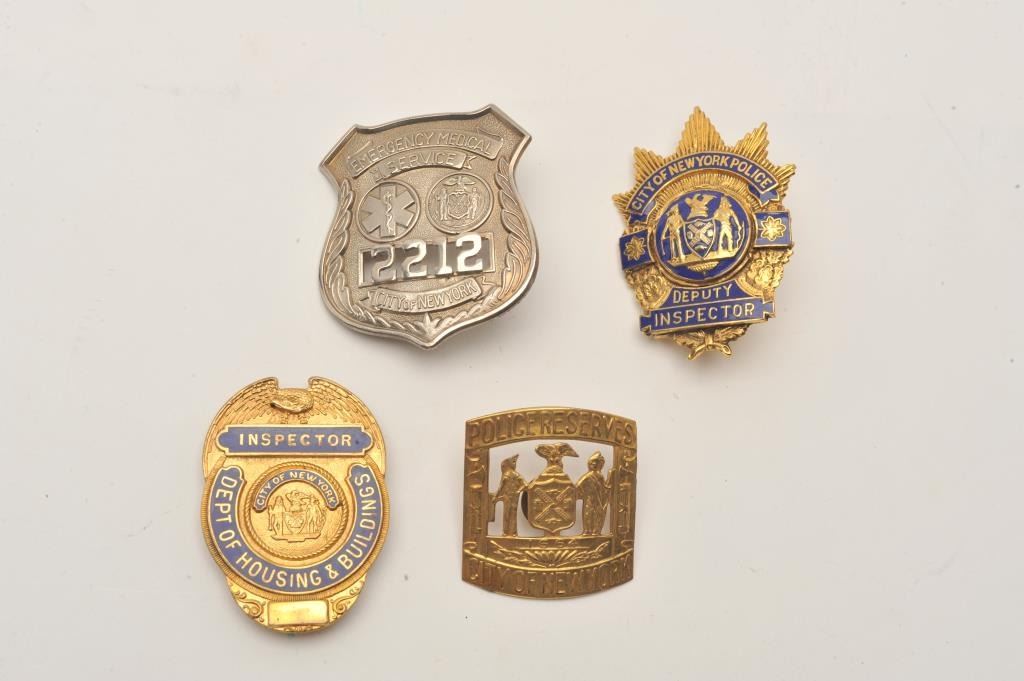 lot of 4 badges including City of New York Dept. of Housing & Buildings Inspector badge (hallmark Johnson National Insignia/314 W. 14th St.), a City of New York Police Deputy Inspector cap badge, a City of New York Lot Title Police Reserves badge (1664 on reverse) and a City of New York Emergency Medical Service cap badge (2212). Est.: $200-$400.