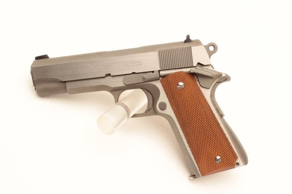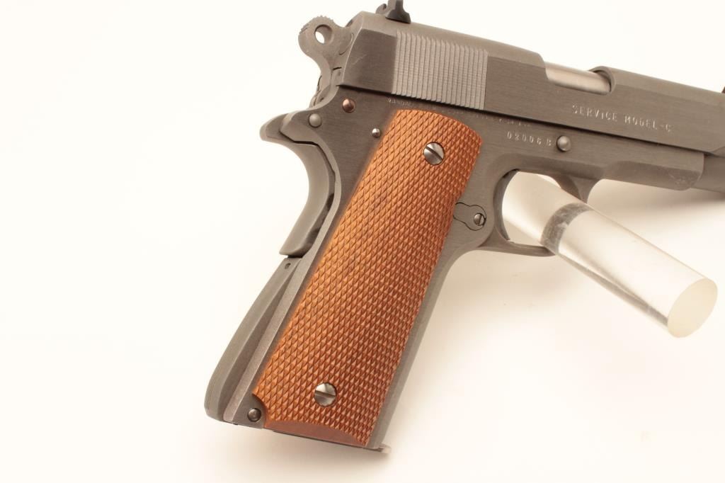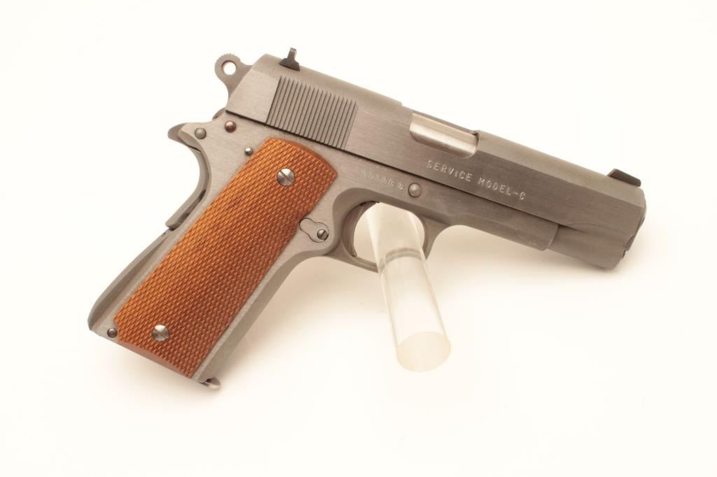 Randall Firearms Service Model C semi-automatic pistol, .45 ACP caliber, Serial #02006B. The pistol is as new in the factory cardboard box. The pistol features a 4” barrel with a fixed rear sight. The Lot Title pistol retains 99% of its matte stainless finish with only light handling marks. The checkered wood grips are also in excellent condition. The box includes all associated packaging materials, manual and warranty Lot Title card. The lot includes one correct, Randall marked magazine. Est.: $500-$1,000. (Modern).