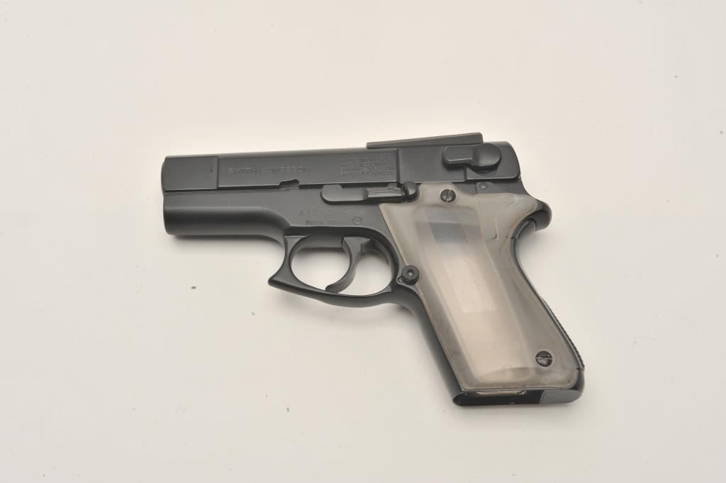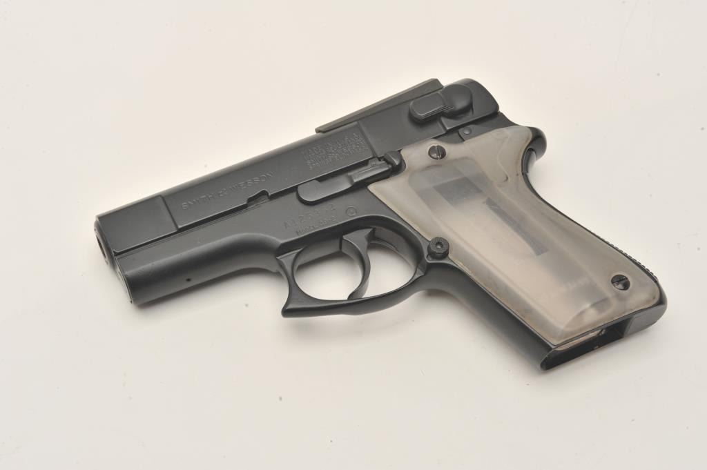 Smith & Wesson Model 39-2 compact semi-automatic pistol, 9mm caliber, serial #A125362. The pistol is in very good overall condition with a 3 ½” barrel. The pistol retains the majority of its blue finish with Lot Title primarily storage and handling marks. The clear plastic grips are in very good condition showing little use. The bore is good, the markings are sharp and action crisp. The lot includes four correct Lot Title magazines, a leather double magazine holder and nylon carrying case. Est.: $300-$600. (Modern).