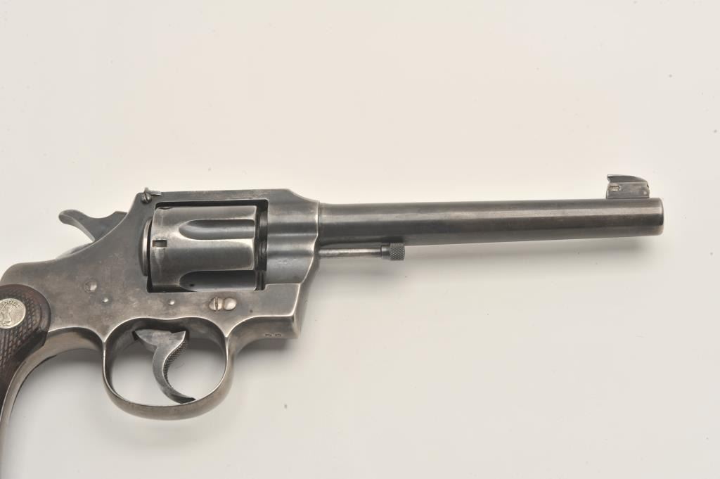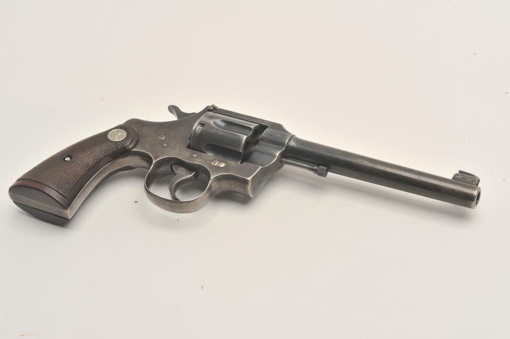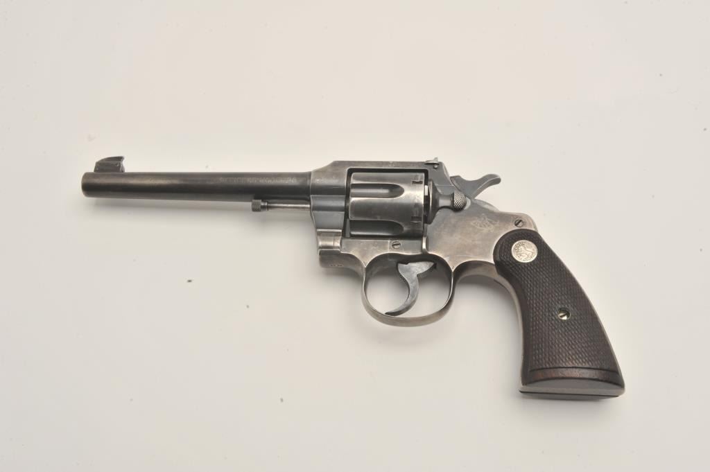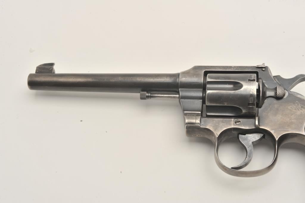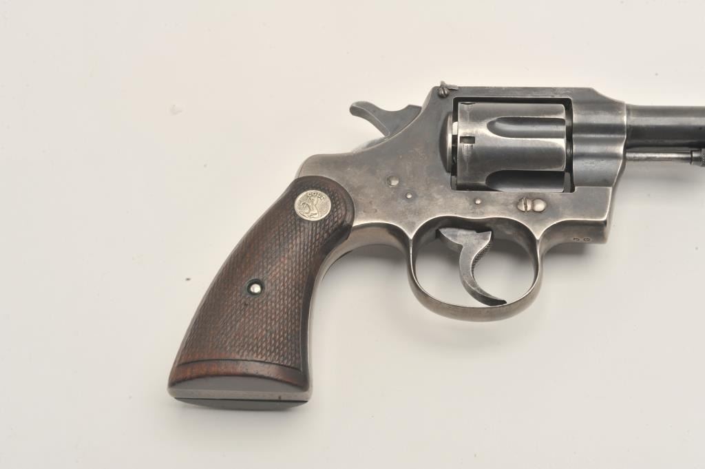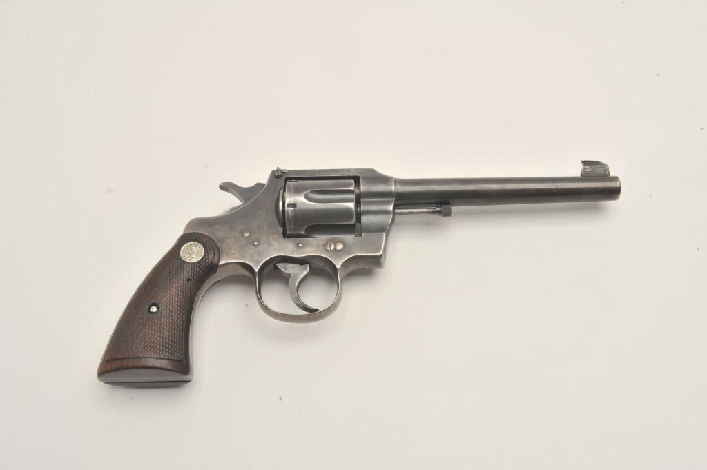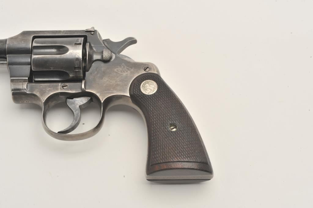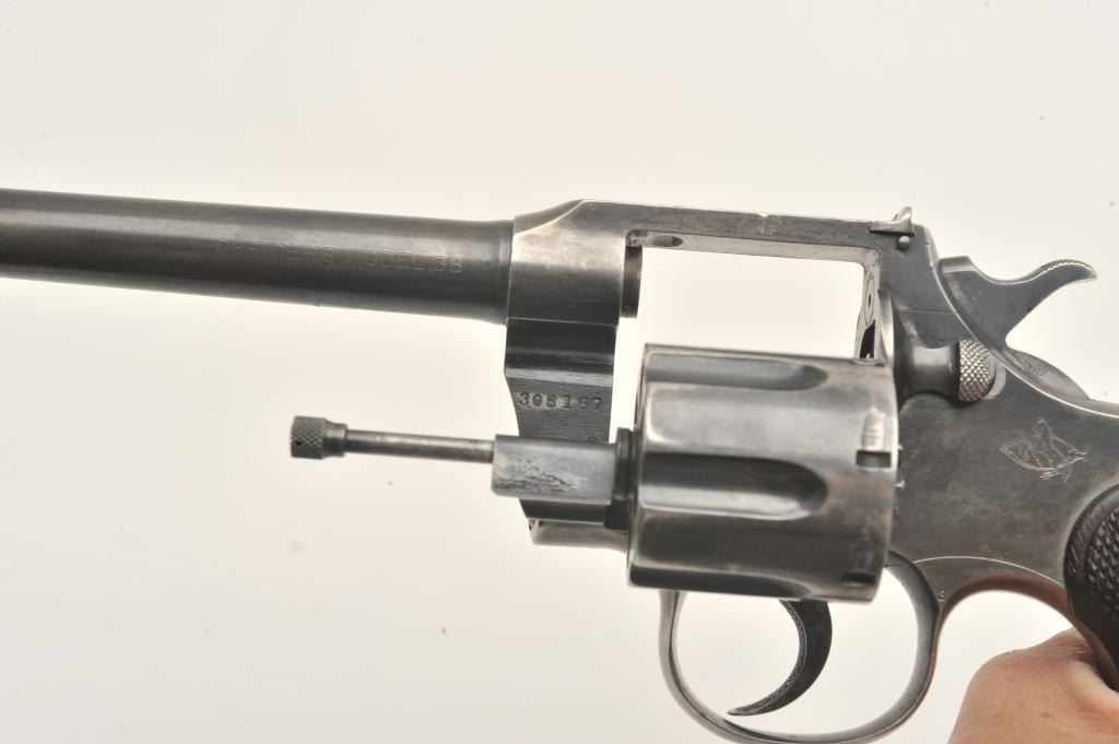 Colt Officers Model double action revolver, .38 caliber, Serial #308187. The pistol is in good overall condition with a 6ā barrel. The pistol retains the majority of its thinning blue finish with wear at the muzzle Lot Title and āJGā stamped under the crane. The checkered wood silver medallion grips are a later style, in good condition with some flattening of the checkering and the grip strap is checkered. The bore is good, the Lot Title action is crisp and the markings are sharp. Est.: $500-$1,000. (C+R).