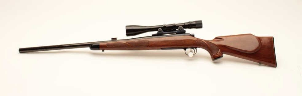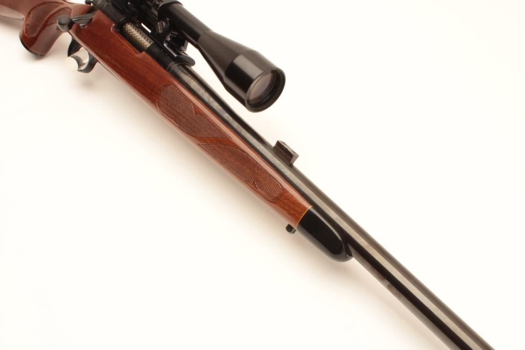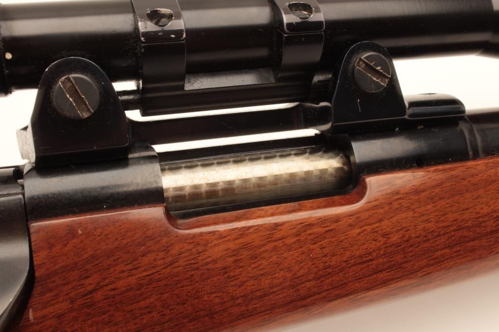 Remington Model 700 bolt action rifle, .222 caliber, Serial #6504918. The rifle is in good overall condition with a 24” heavy barrel. The barrel and receiver retain the majority of their blue finish with some light Lot Title surface erosion evident, while the bolt has been jeweled. The checkered wood stock is in good condition with small mars, compressions and an ebony tip on the fore end. The butt ends with a checkered plastic butt plate. Lot Title The rifle is topped with a Balvar 8a 2.5 x 8 variable power scope. The bore is good, the action is crisp and markings are sharp. Est.: $400-$800. (Modern).