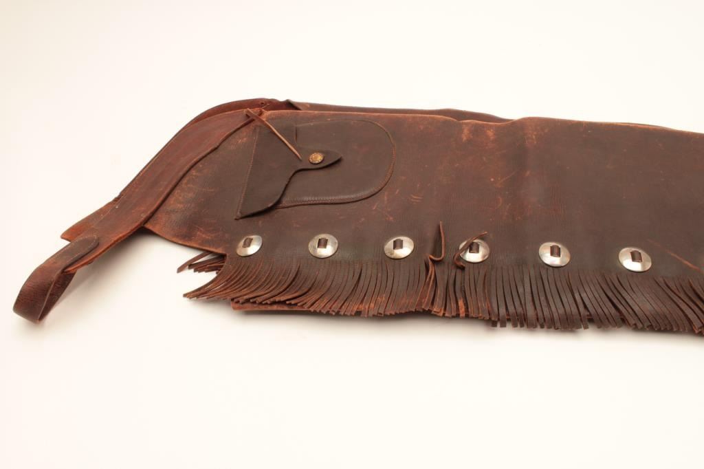Pair of fringed shotgun style chaps by Heiser, Denver, Colo.; good condition overall; ca. 1900-1930’s. Est.: $200-$400.