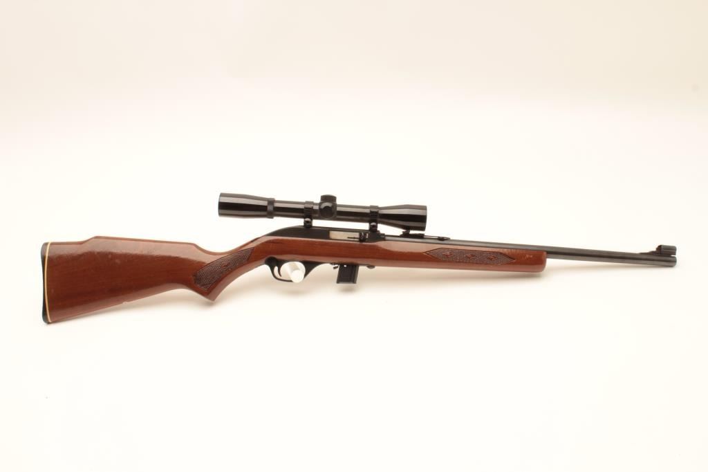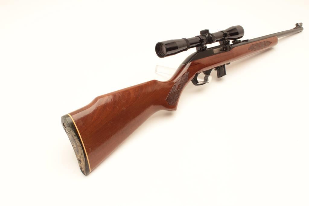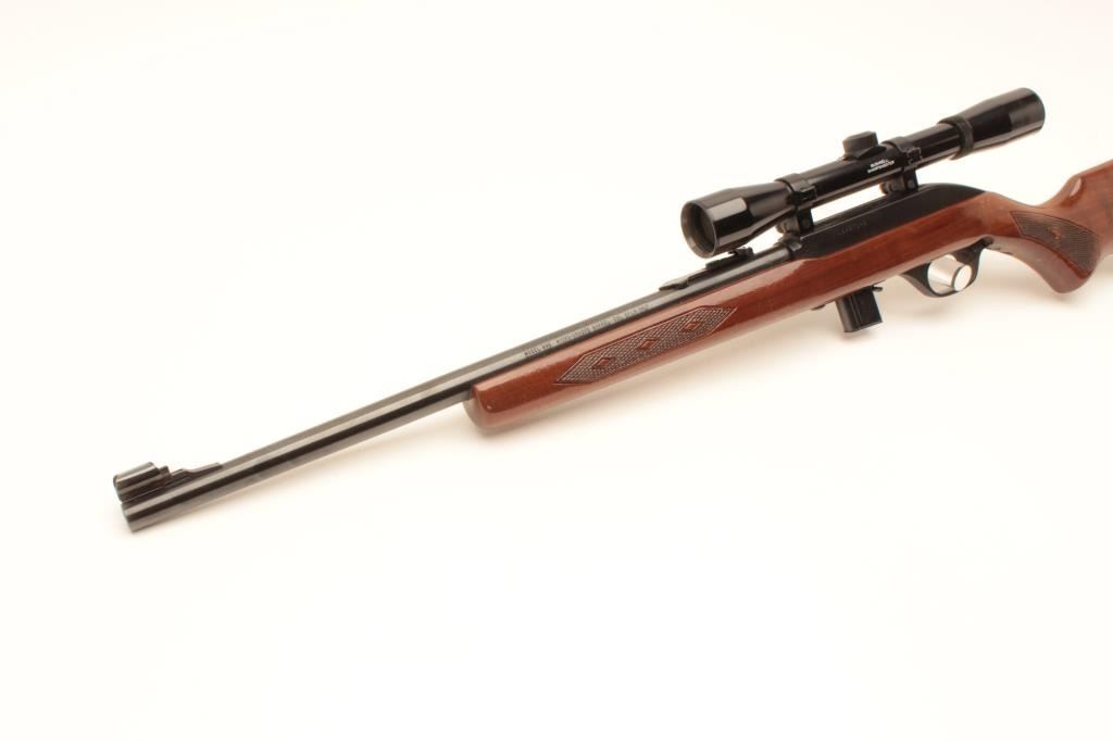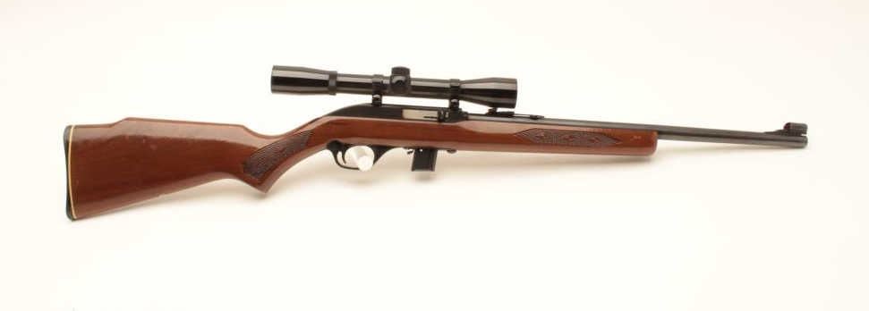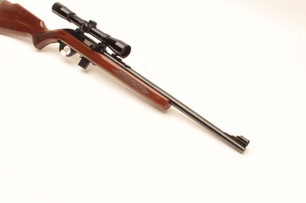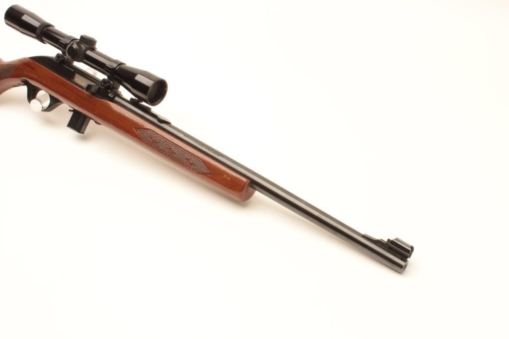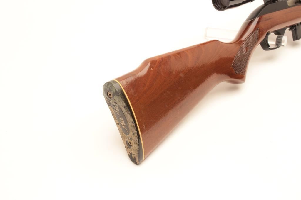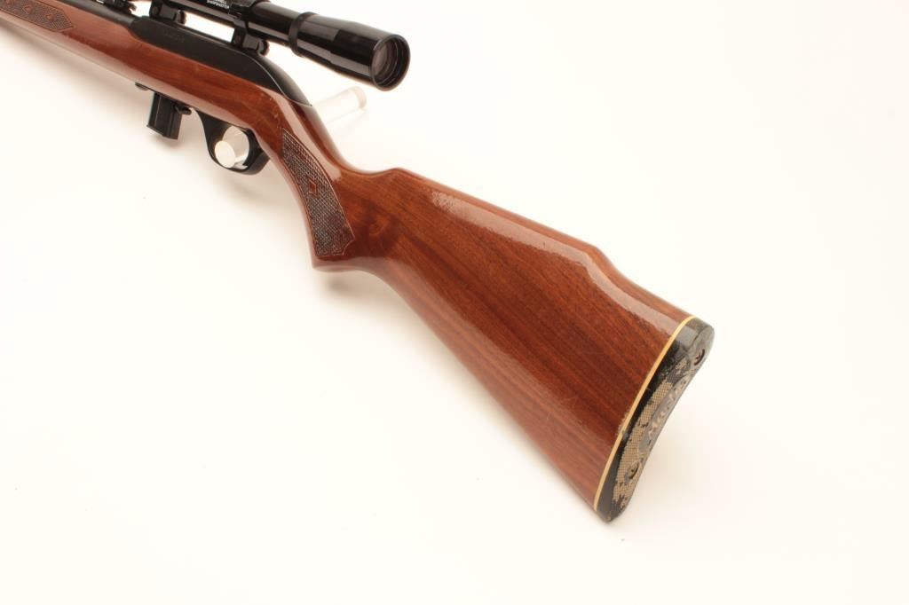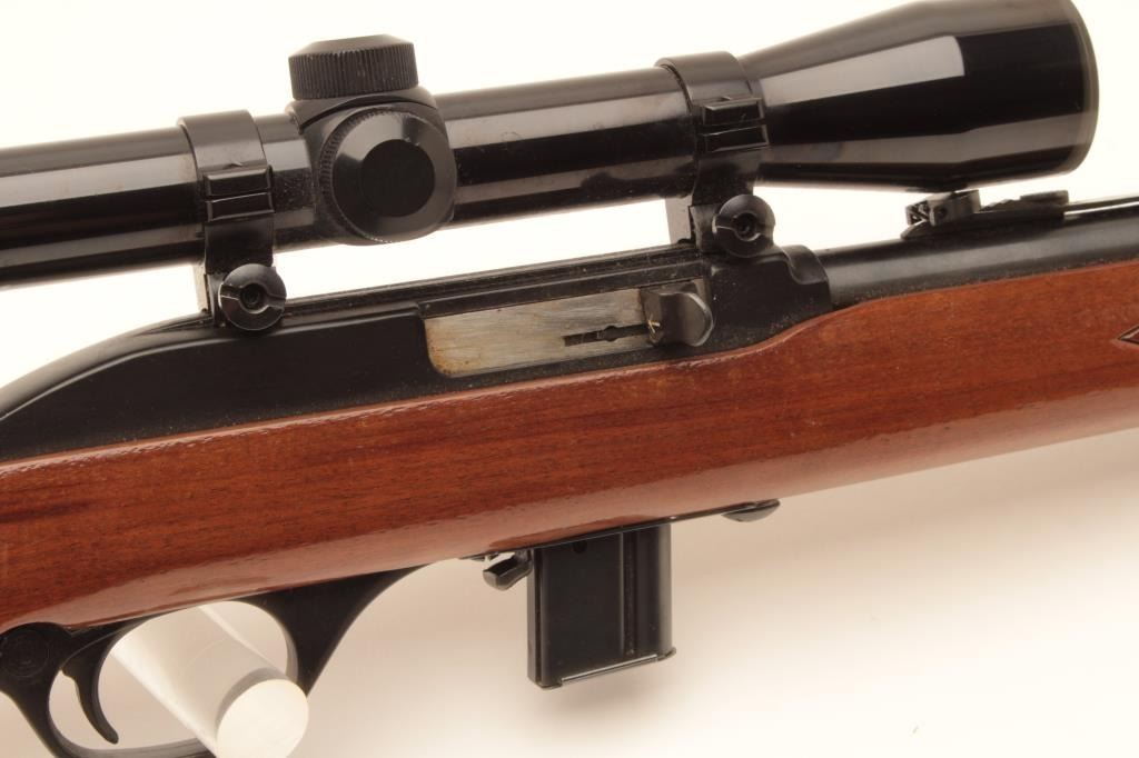 Marlin Model 995 semi-automatic rifle, .22LR caliber, blued finish, checkered wood stock, S/N 15467049, in overall very good used condition with one extra magazine; mounted with a Bushnell Sharpshooter scope with crisp Lot Title optics. (Modern). Est.: $100-$200.