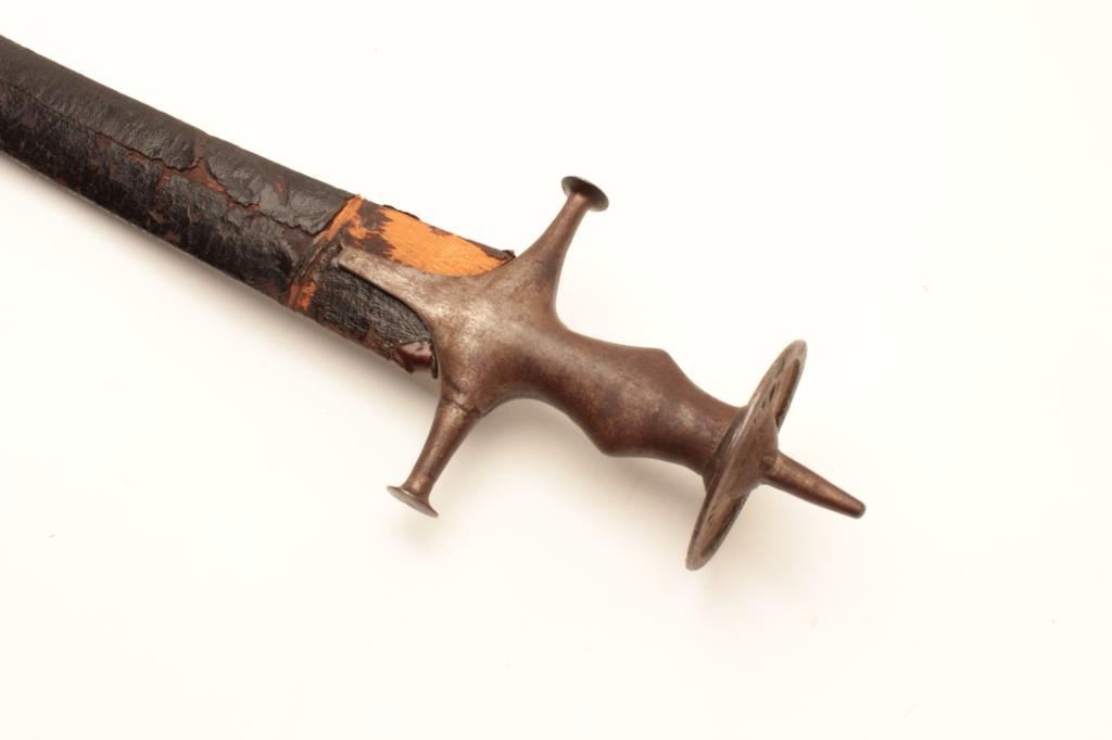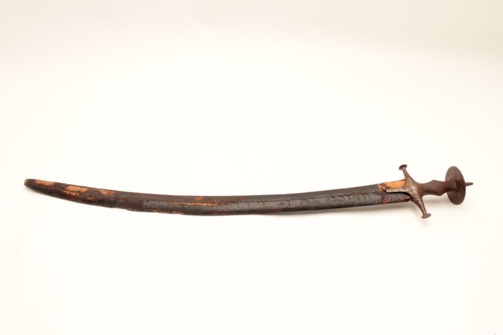 Tulwar sword with scabbard, 19th Century, India, approximately 36” overall; good condition; some losses to leather scabbard wrap. Est.: $150-$300.
