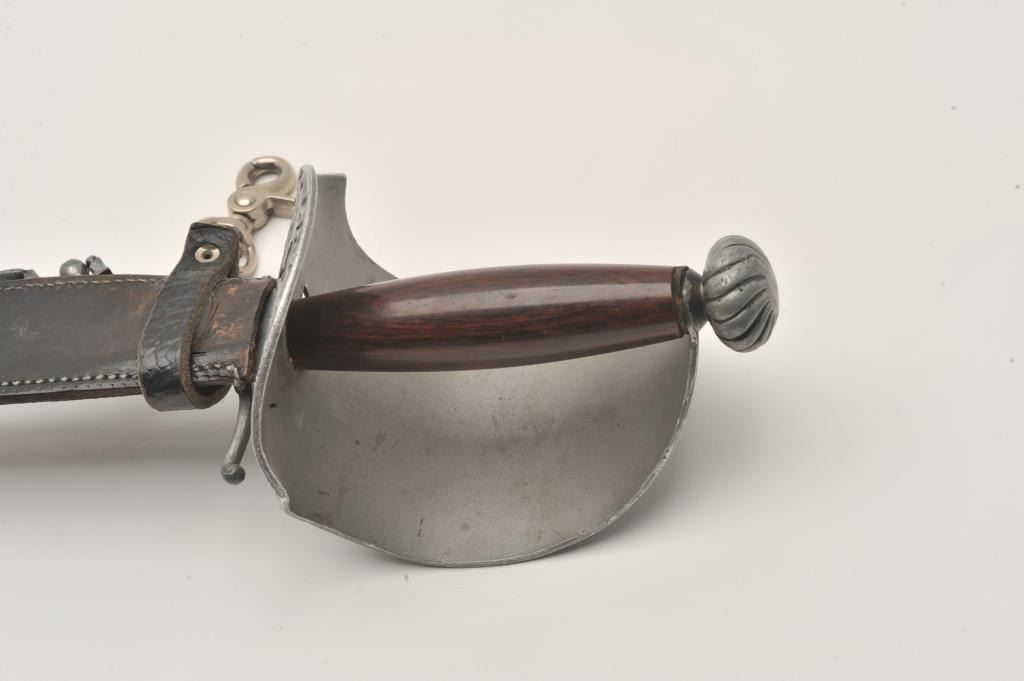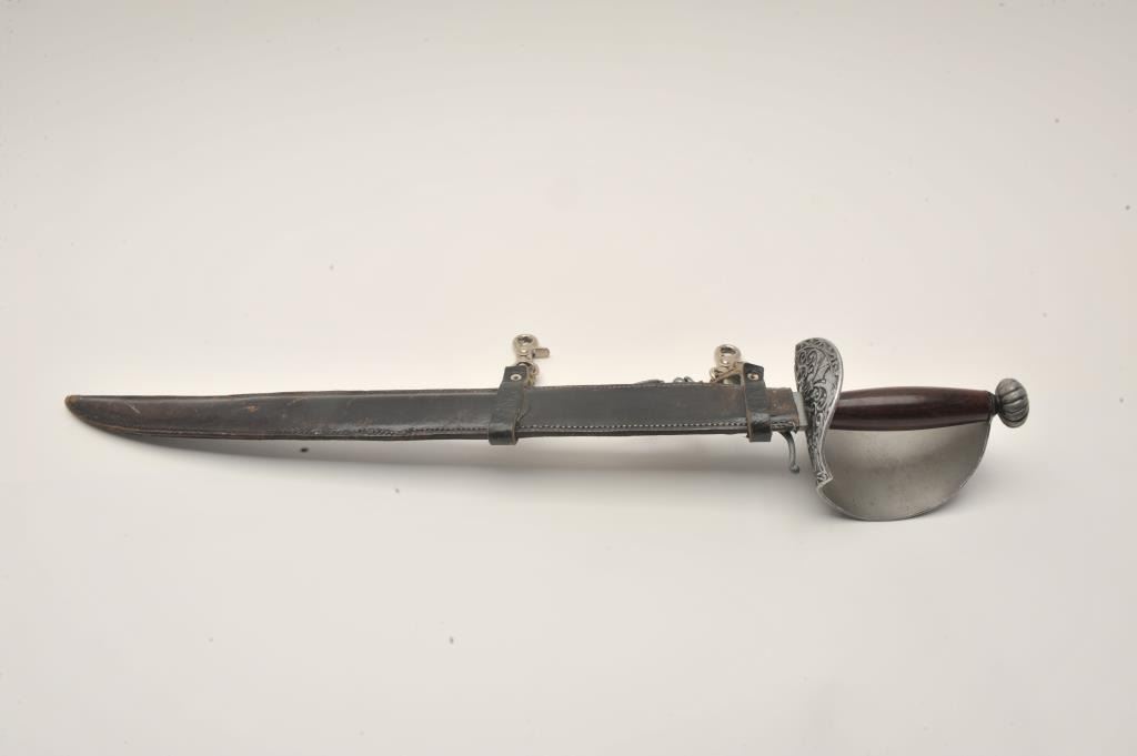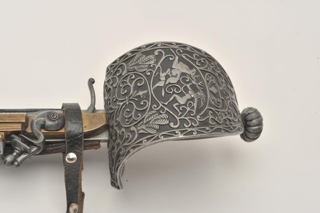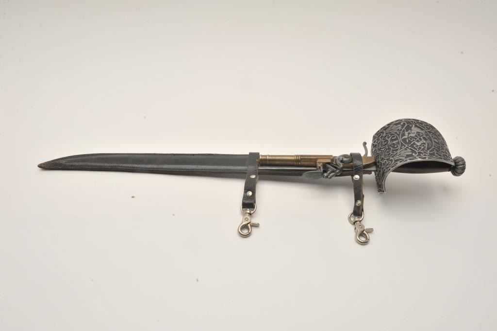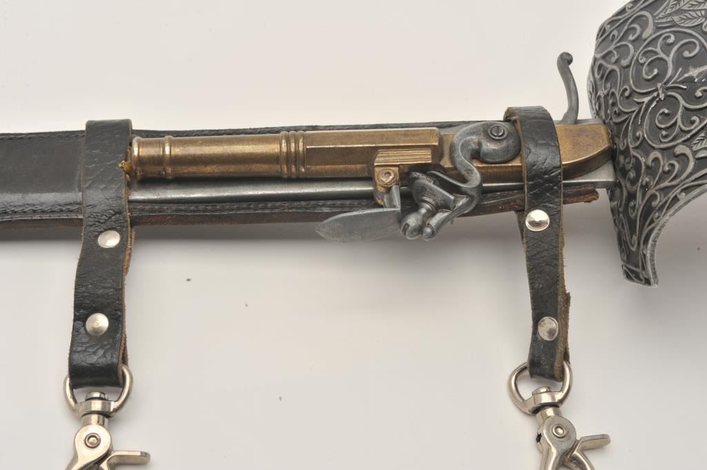 Replica sword pistol with cast metal handle and smooth wood grip. The sword features a replica pistol in brass mounted on the sword. The sword pistol includes a leather sheath with hangers. A nice decorator piece for Lot Title someone’s Pirate lair. Est.: $100-$200.