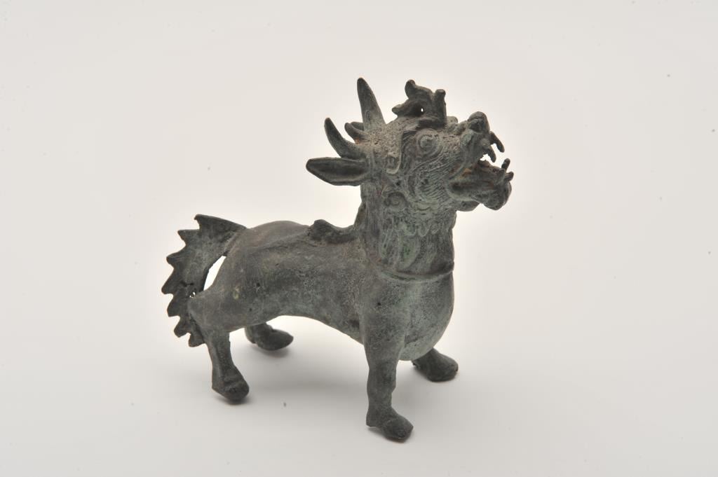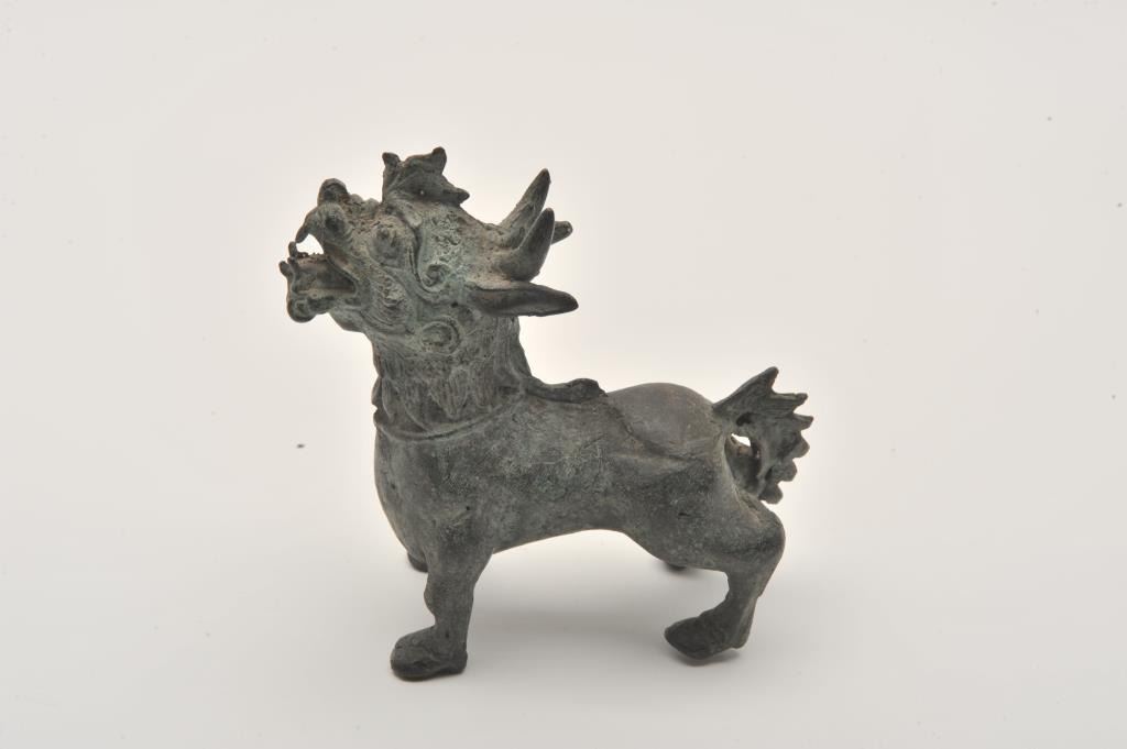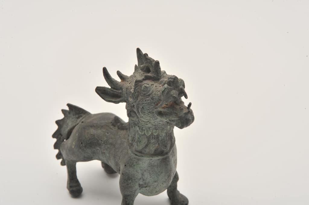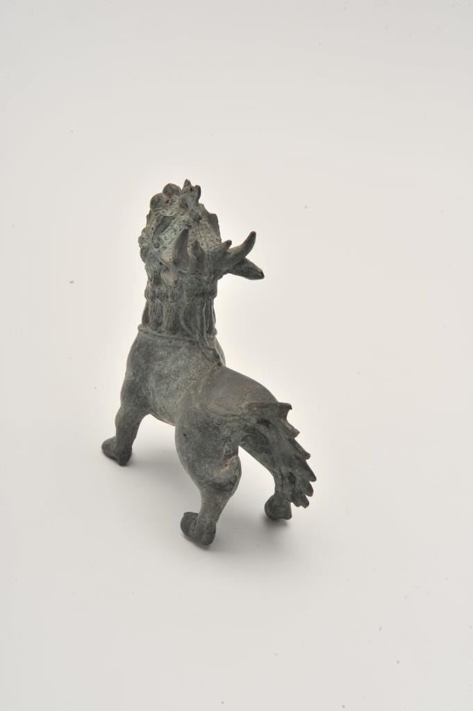 Antique bronze deity in the form of a horned and crested dog (resembling a Chinese Foo Dog); approximately 5.5” in height, 6” long and 2.5” wide; great patina. Est.: $150-$300.