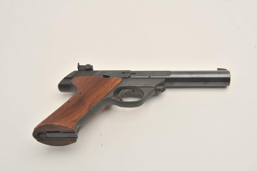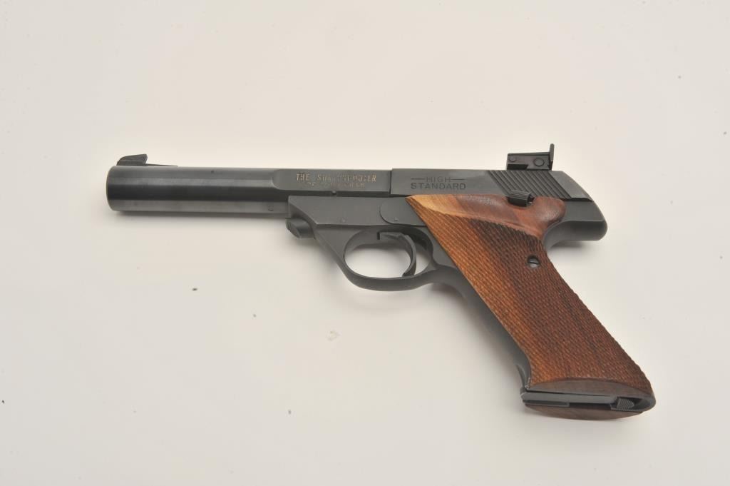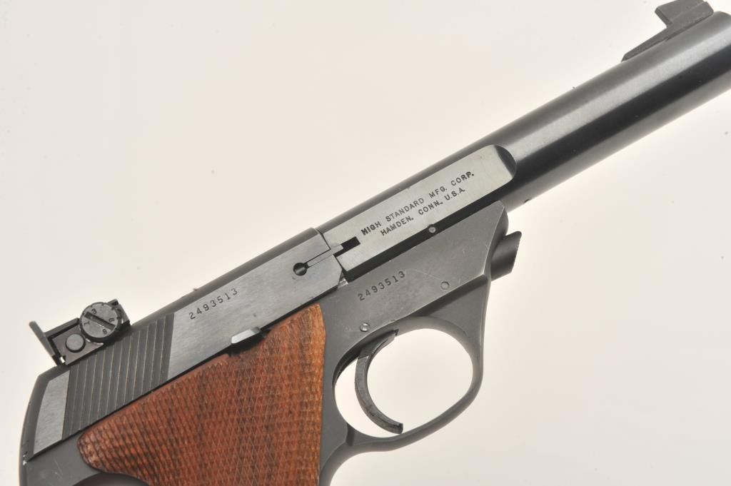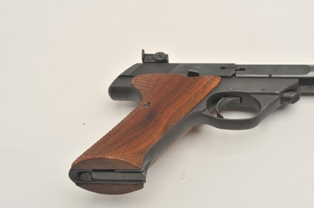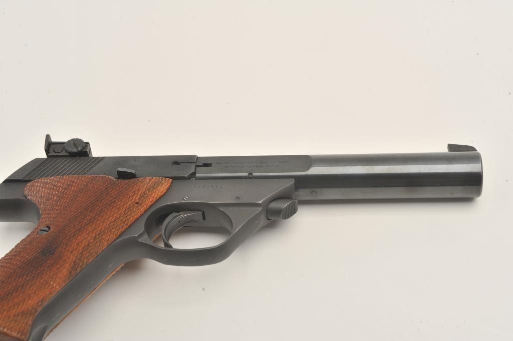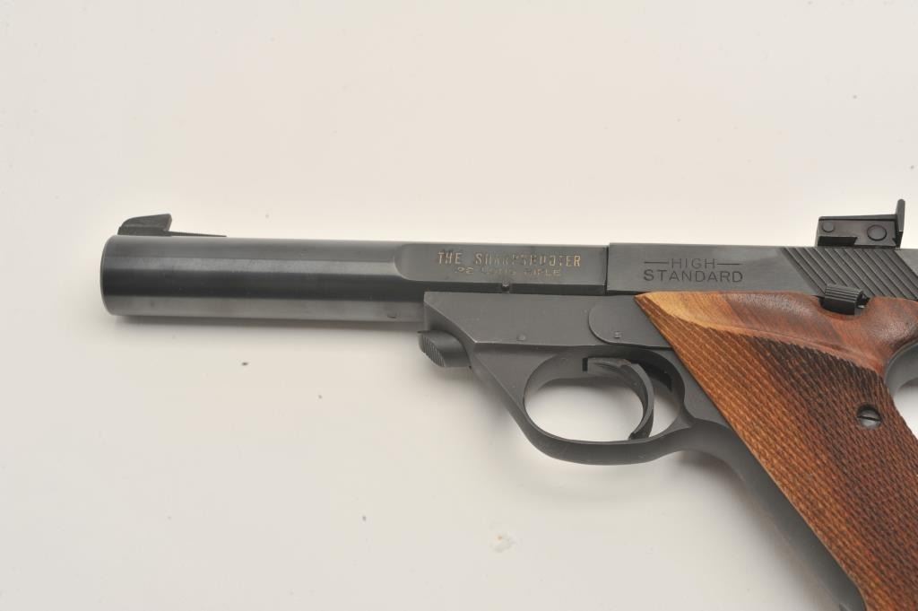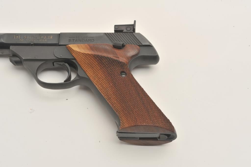 Hi-Standard The Sharpshooter semi-automatic pistol, .22 Long Rifle, Serial #2493513. The pistol is in fine overall condition with a 5 ½” heavy barrel with a blade front and adjustable rear sights. The metal surfaces Lot Title retain nearly all of their blue finish with only light handling marks. The checkered wood target grips are in very good condition with sharp checkering and light storage marks. The bore is good, the action crisp Lot Title and markings are sharp. The lot includes one correct magazine. Est.: $400-$800. (Modern).