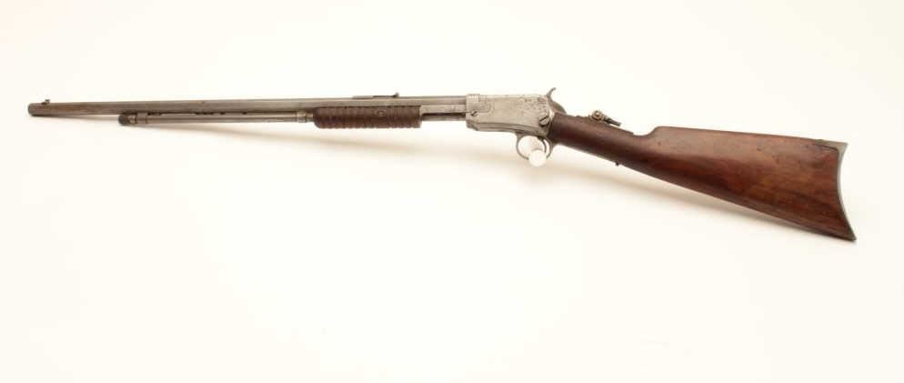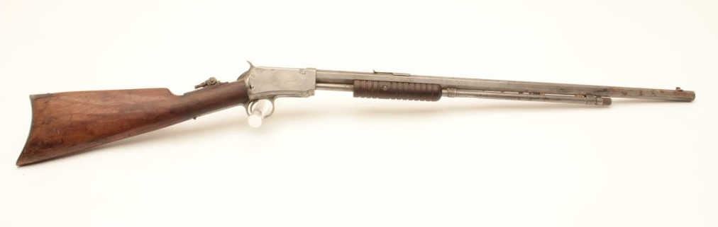 Winchester Model 1890 pump action rifle, .22 LR caliber, 24” octagon barrel, grey patina to metal surfaces, wood stocks, S/N 627584, in overall fair + condition with dark bore, good action, partial tang sight, scattered Lot Title spots of erosion and surface rust to metal surfaces, fair to good wood stocks; would benefit from a careful cleaning and oiling. (C&R). Est.: $150-$300.