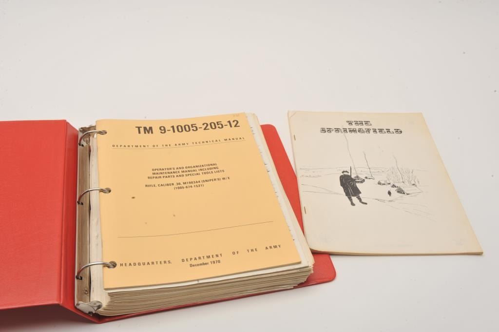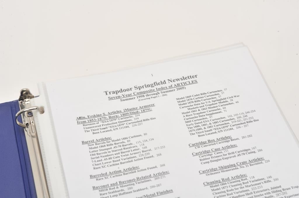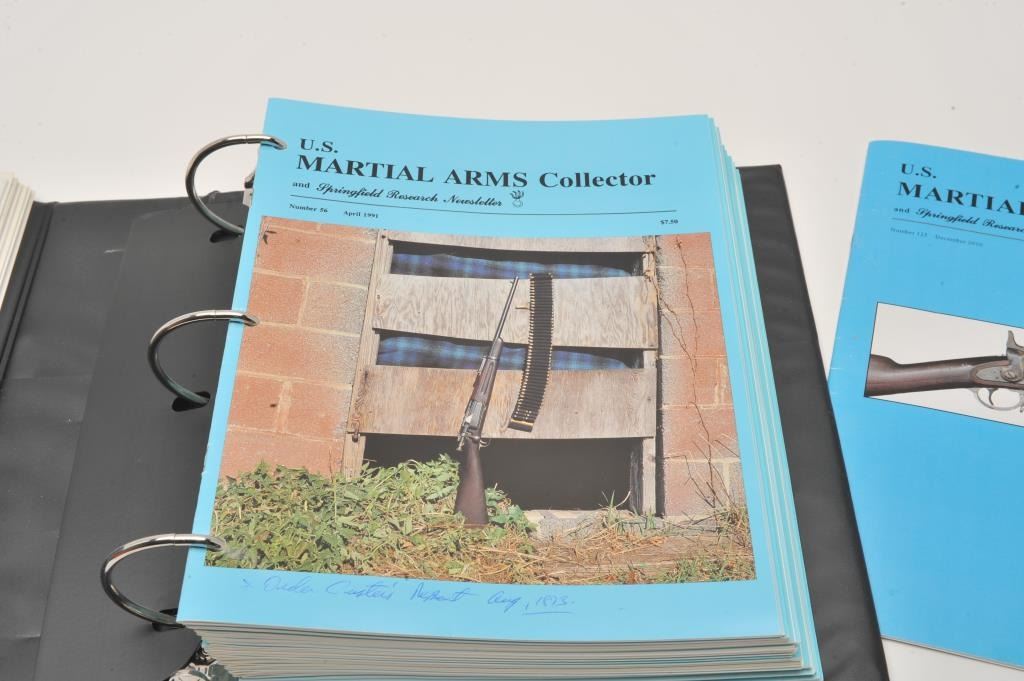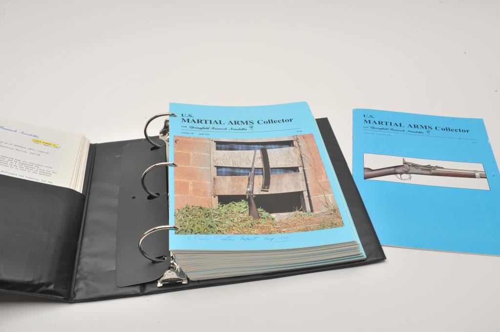 Six large 3-ring binders of reference materials including Volumes 1 thru 9 of the Trapdoor Springfield Newsletter on U.S. Trapdoor rifles by Frasca Publishing (1998 – 2007) and Springfield Research Service Lot Title Martial Arms Collector newsletters and data summary information including serial numbers, general correspondence, etc. for trapdoors, Krag rifles, ‘03’s, 1911’s, etc. Extensive detailed information on a variety of historic Lot Title U.S. Martial Arms! Est.: $100-$150.
